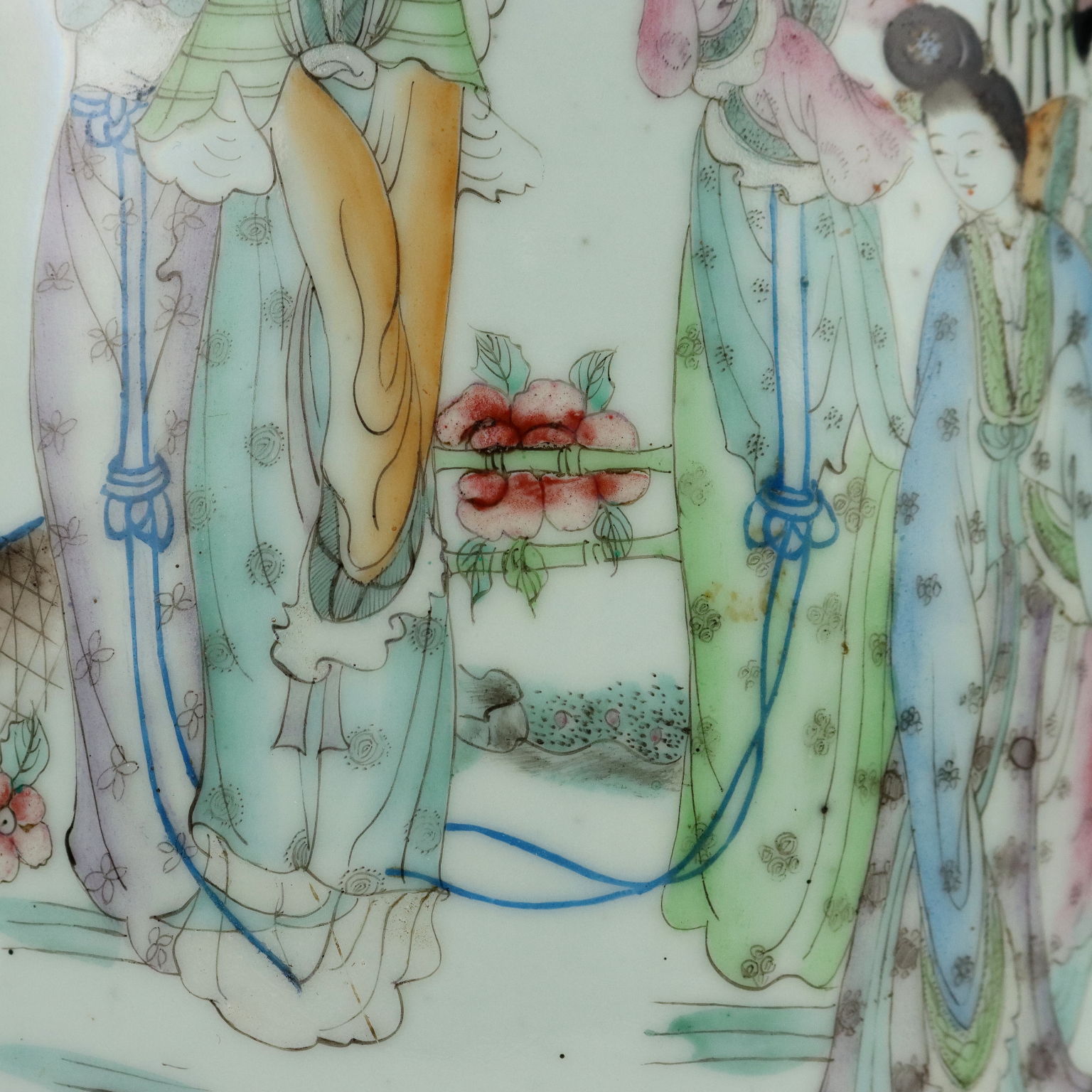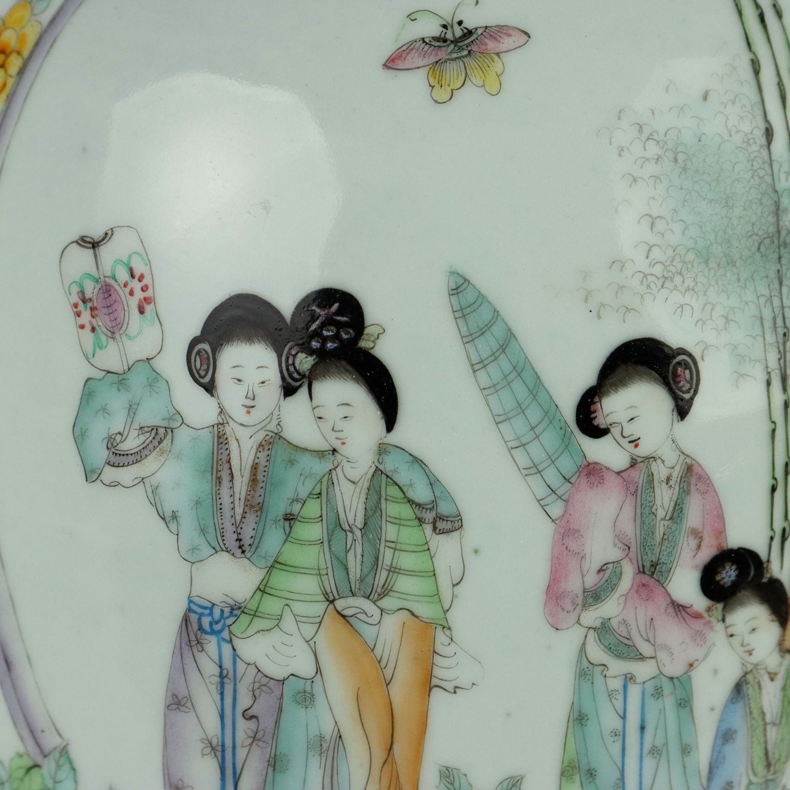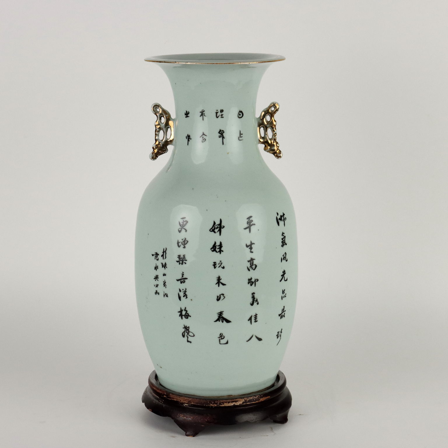 Vaso a balaustro in porcellana dipinta a smalti Qianjiang con rappresentazione di cortigiane in un giardino fiorito. Anse laterali lumeggiate in oro. La parte retrostante con un lungo poema scritto in caratteri cinesi.