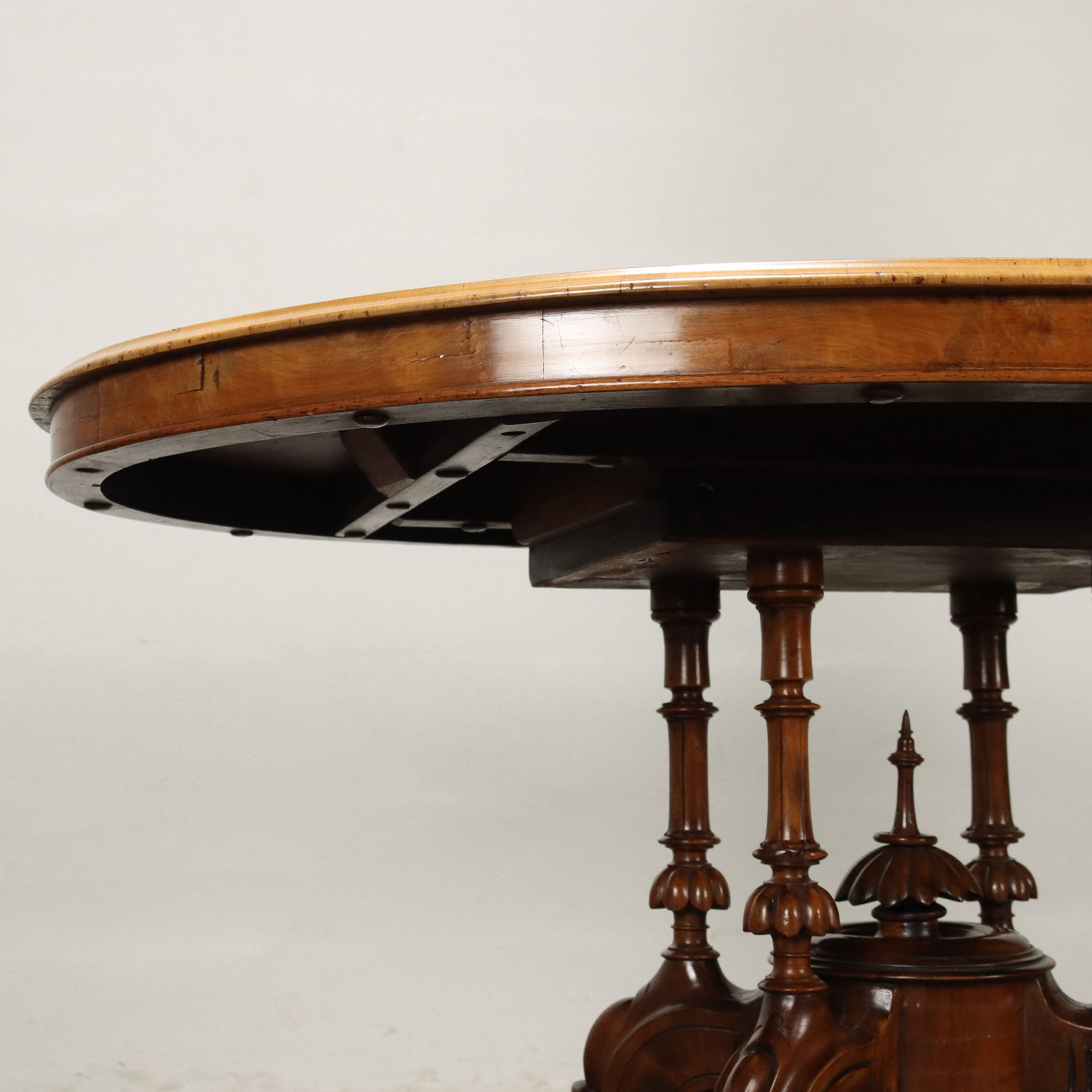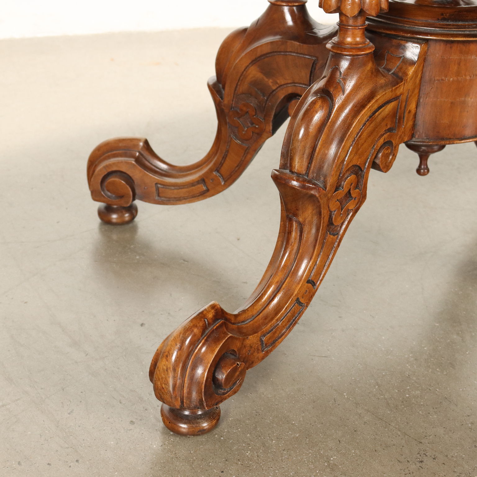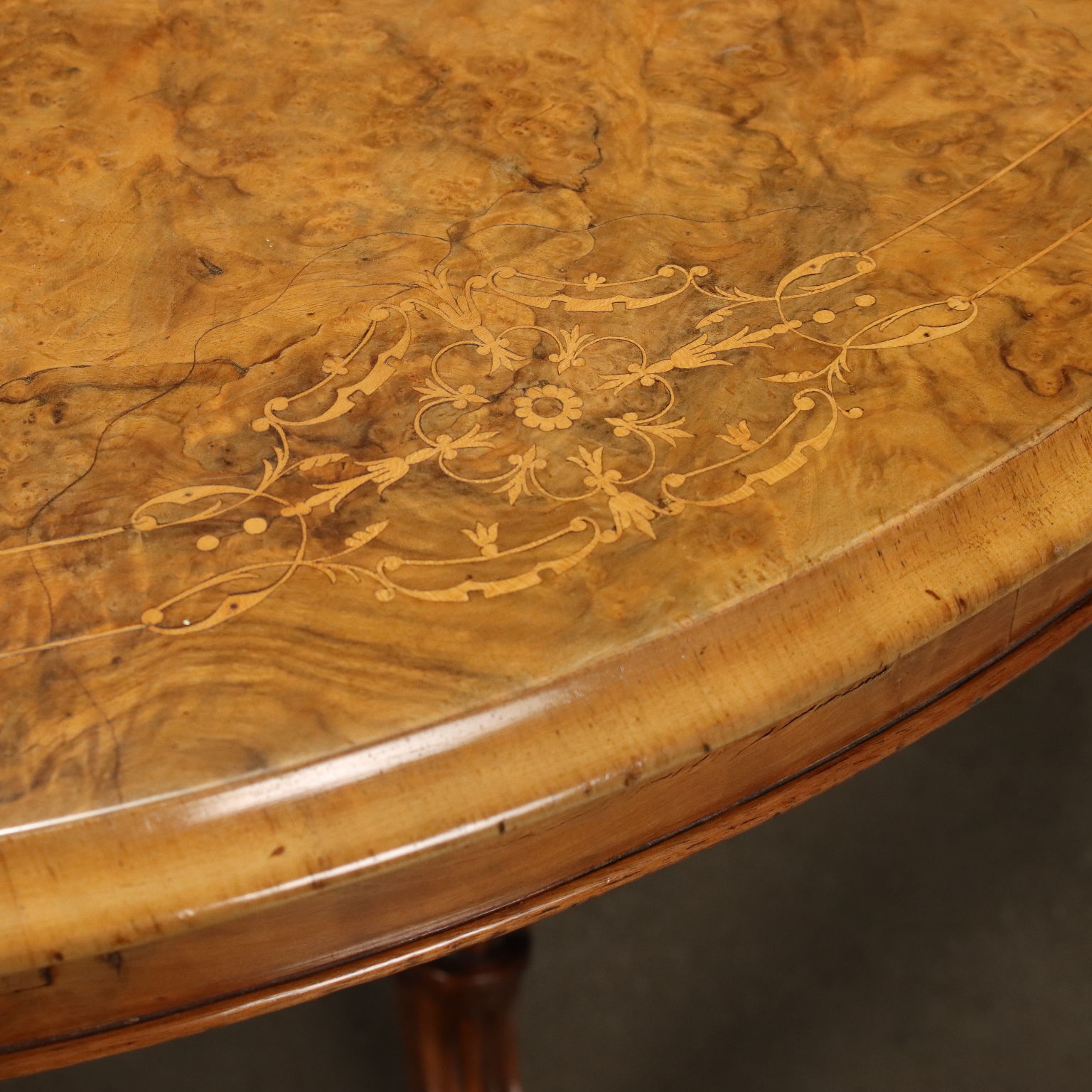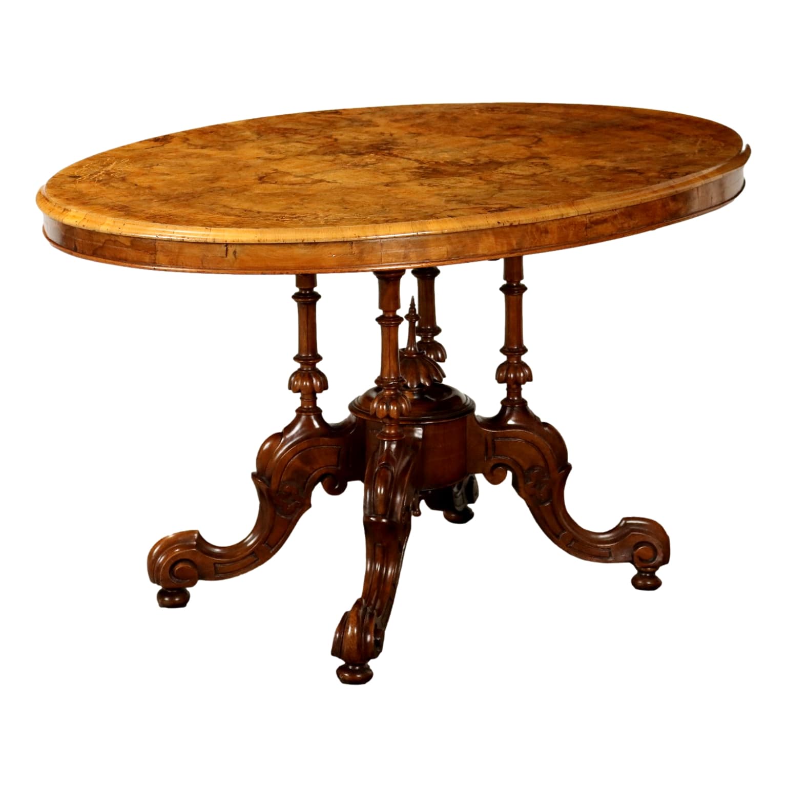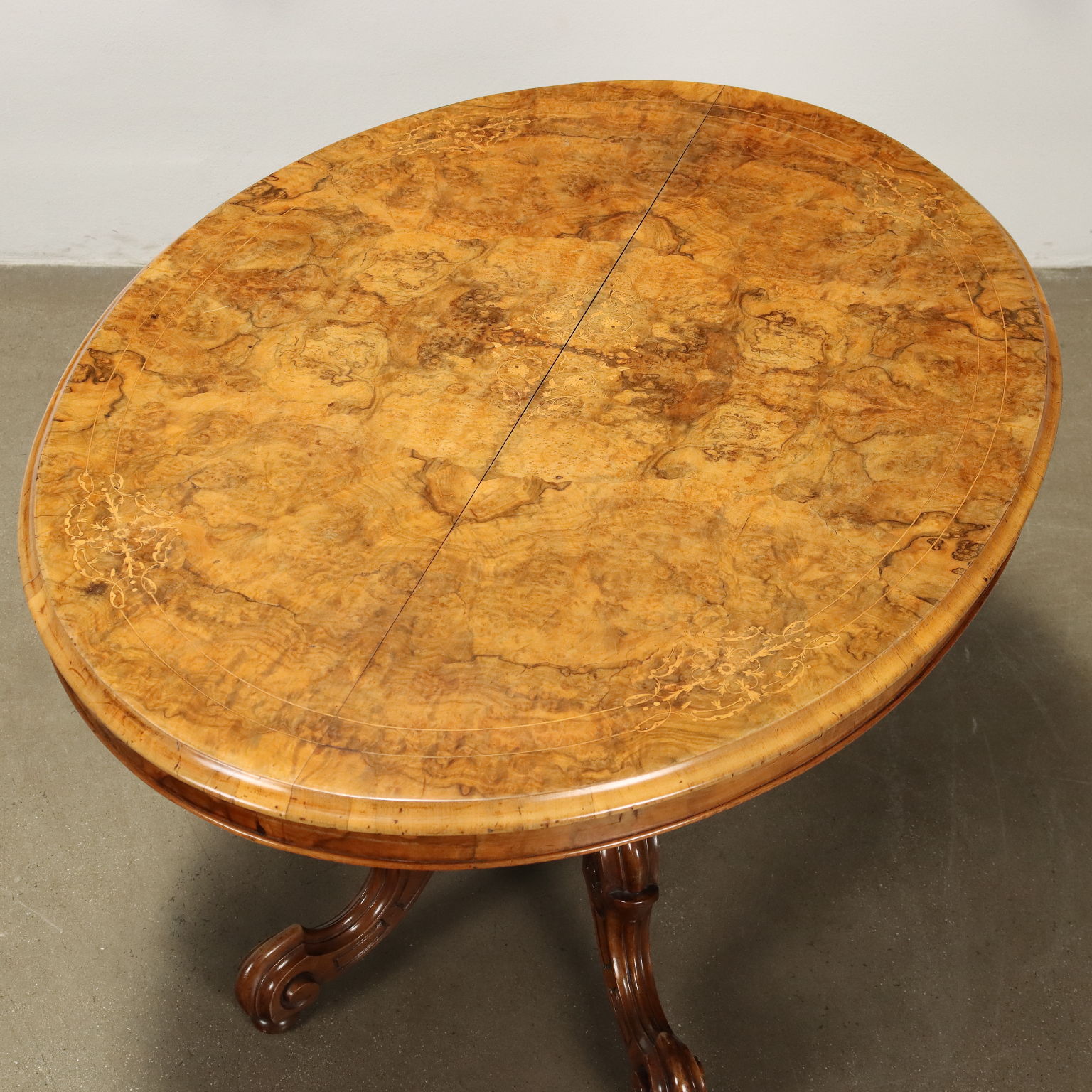Tavolo inglese a vela il cui meccanismo è stato successivamente bloccato, poggiante su tre piedi mossi e intagliati a ricciolo, sui quali si innestano quattro colonne tornite e intagliate. In noce, il piano è impiallacciato in radica e ornato con filettature e intarsi in acero.