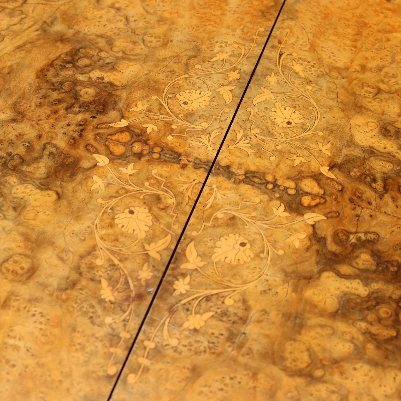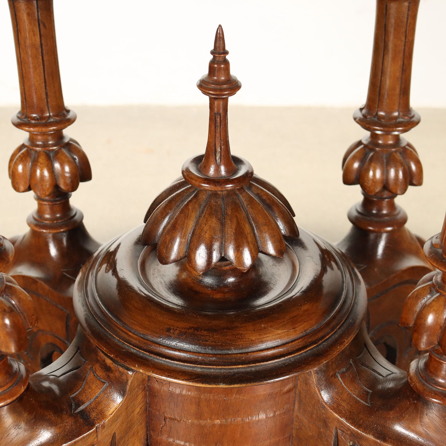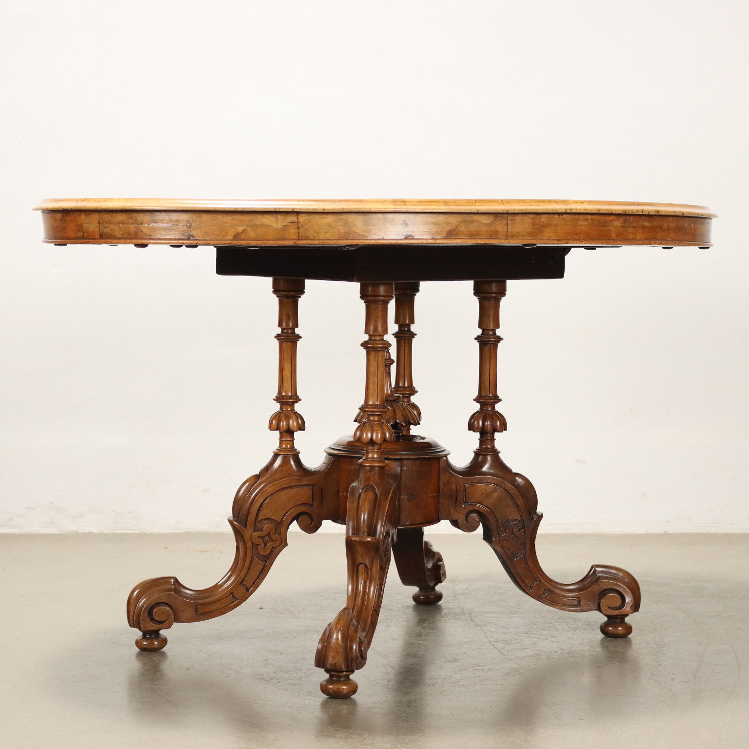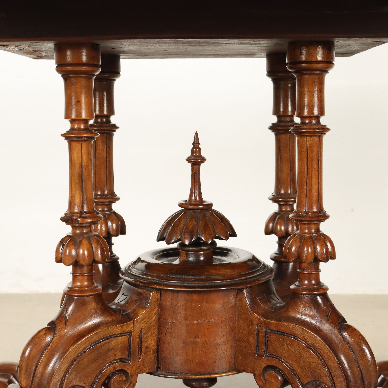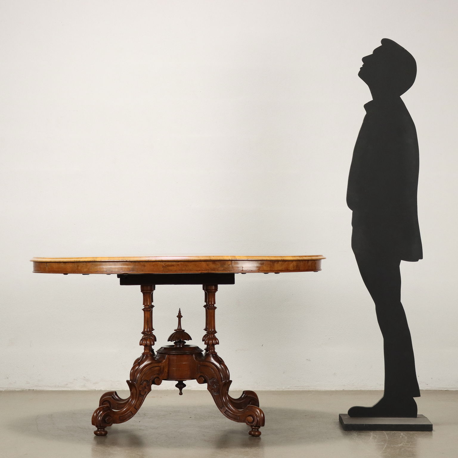 Tavolo inglese a vela il cui meccanismo è stato successivamente bloccato, poggiante su tre piedi mossi e intagliati a ricciolo, sui quali si innestano quattro colonne tornite e intagliate. In noce, il piano è impiallacciato in radica e ornato con filettature e intarsi in acero.