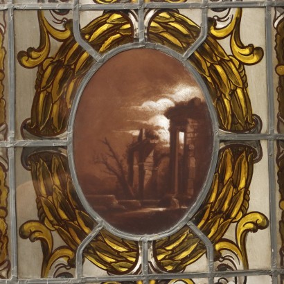 Coppia di vetrate liberty in vetro piombato dipinto, Italia fine XIX-inizio XX secolo. Bordure con fregio di foglie di alloro, parte interna con riccioli e volute fogliacee. Al centro delle vetrate, posti entro un ovale, sono raffigurati due paesaggi: l'uno fluviale, con imbarcazioni e case, l'altro di gusto classico, con rovine e una fanciulla posta nei pressi di uno specchio d'acqua.