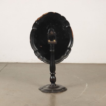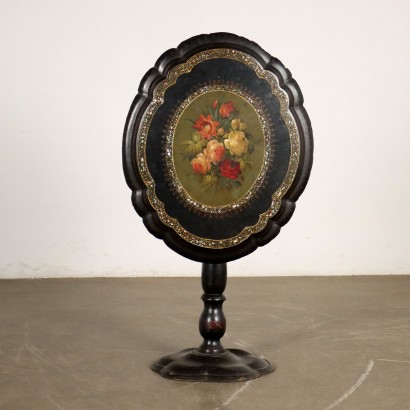 Tavolino a vela in papier-maché ebanizzato, il piano è laccato e dipinto con composizione floreale e le cornici sono in madreperla. Inghilterra, ultimo quarto del XIX Secolo