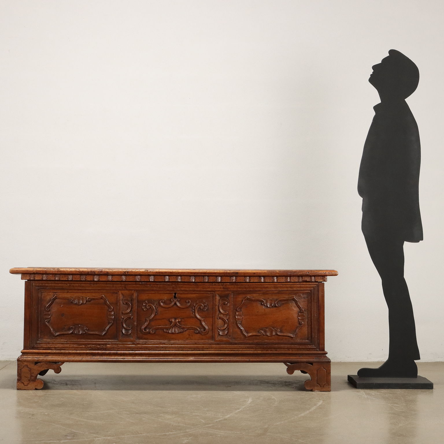 Cassapanca Barocca in noce sorretta da piedi a mensola, fronte tripartito intagliato, cerniere sostituite e restauri. Lombardia, metà XVIII Secolo.