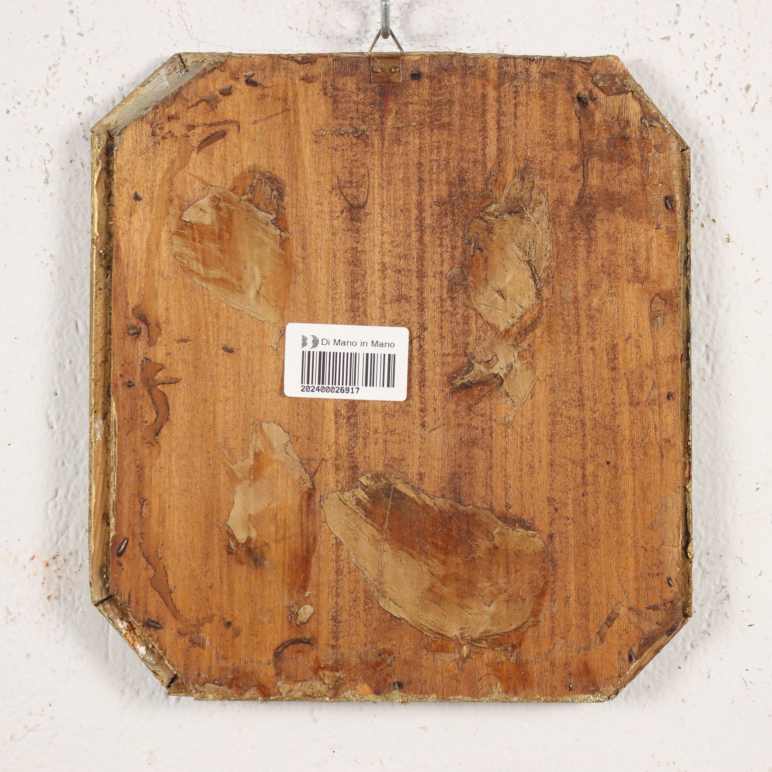 Olio su tela, applicata a pannello ligneo sagomato. La formella fa parte di una serie raffigurante episodi del Vangelo, incentrati sulla vita di Maria e di Gesù; i personaggi sono difatti raffigurati con le stesse sembianze nelle diverse scene. Qui è raffigurato l'Arcangelo Gabriele che si presenta a Maria, raffigurata mentre è inginocchiata a pregare, per annunciarle che diverrà Madre di Gesù per opera dello Spirito Santo. La sagoma lignea è incorniciata in listelli dorati coevi.
