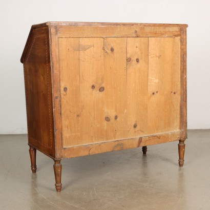 Ribalta Piemontese in noce, interni e schienale in abete. Anta a ribalta celante scarabattolo con quattro cassetti e quatto vani, fronte a due cassetti più due sottopiano, piedi troncoconici, filettature in acero e noce lungo tutta la superficie. Bocchette e maniglie sostituite. Piemonte, metà XVIII Secolo.