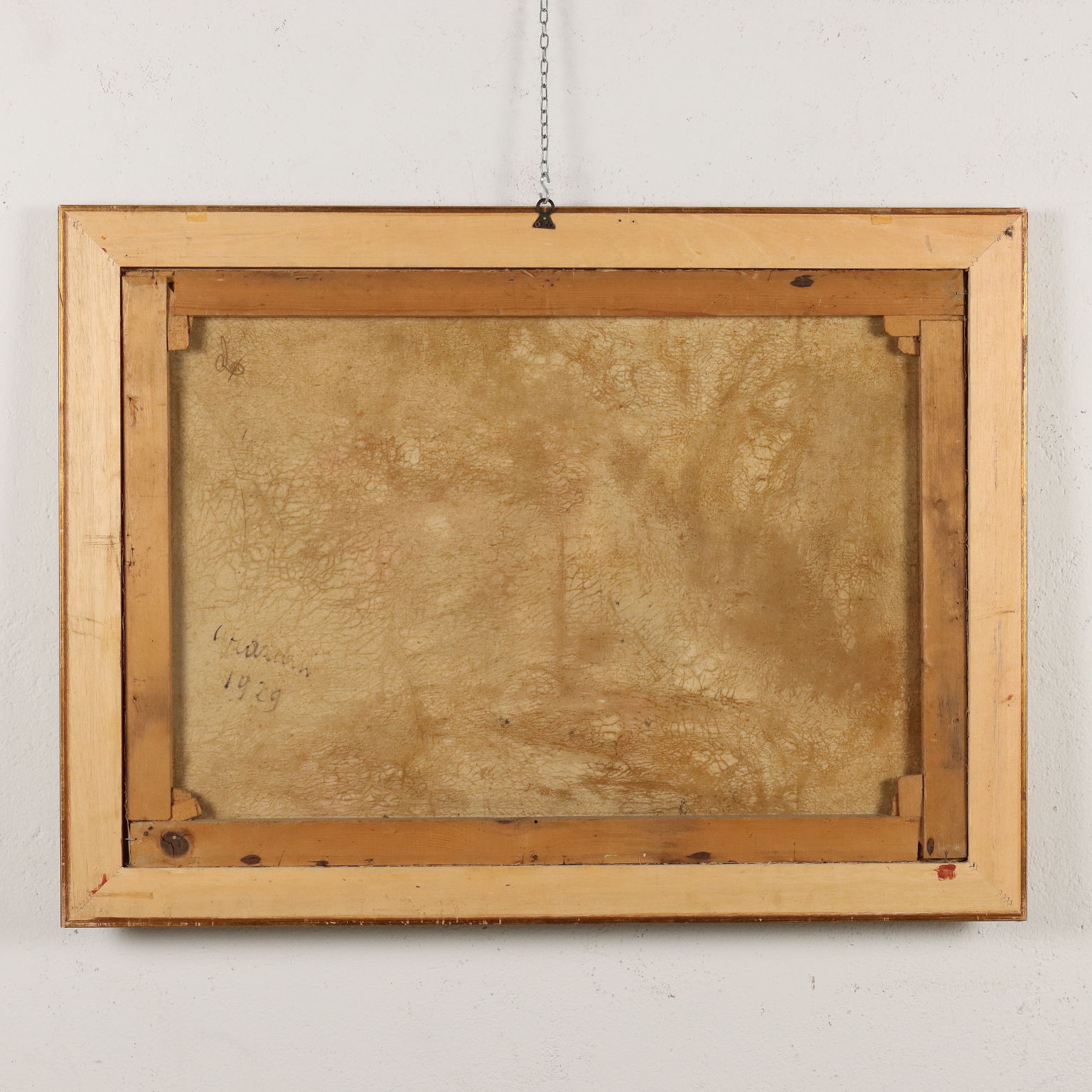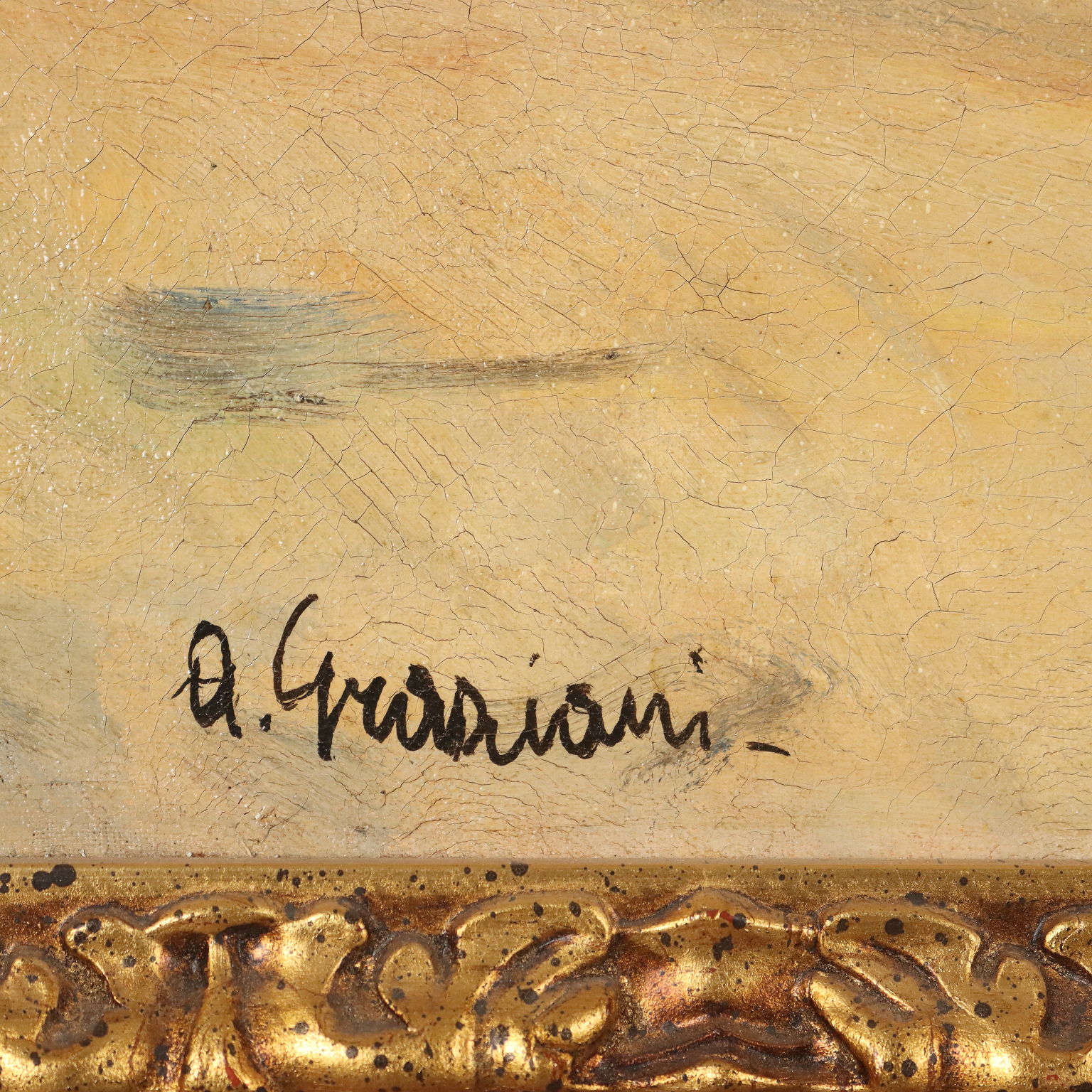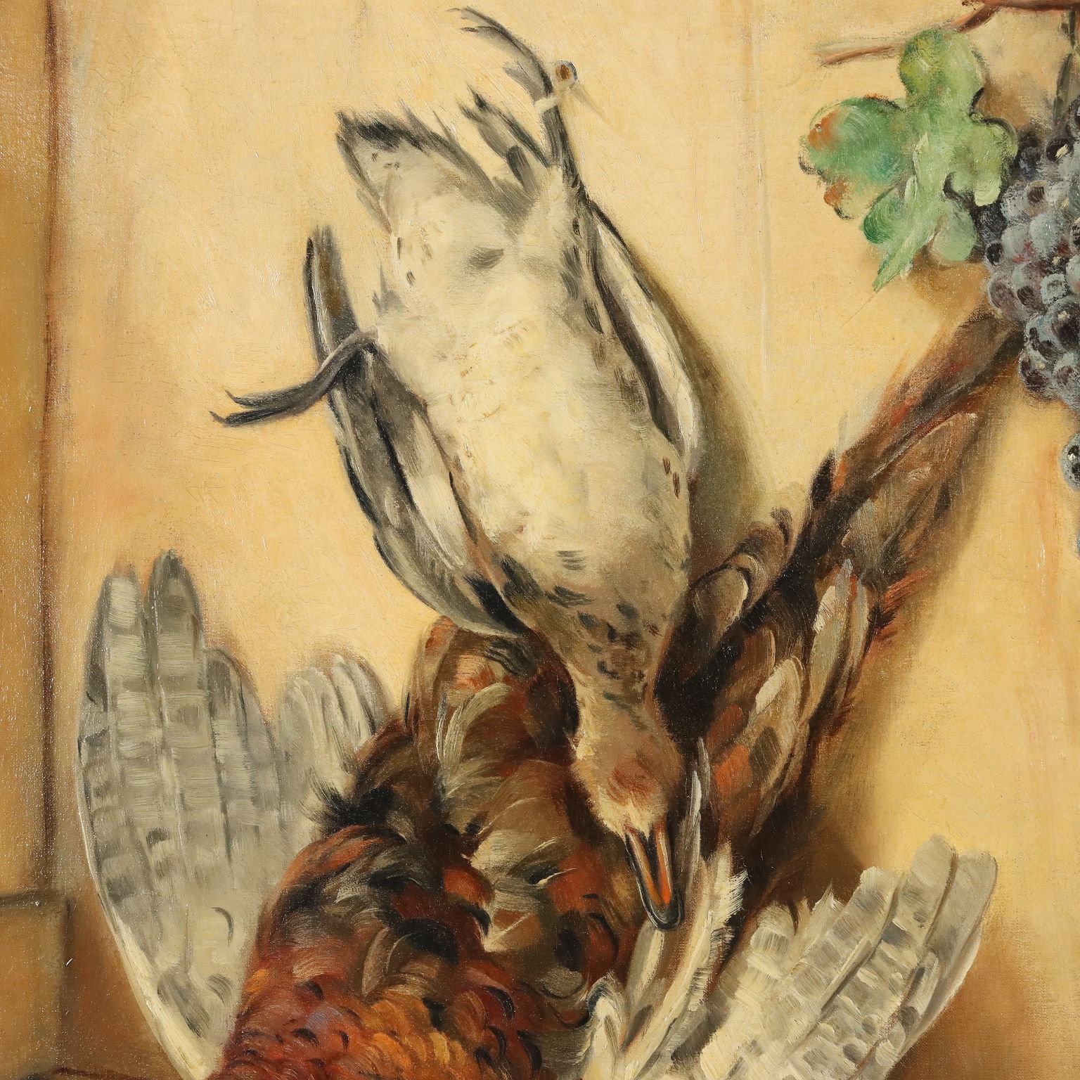 Olio su tela. Firmato in basso a sinistra. al retro ulteriore firma e la data. Alfio Paolo Graziani scelse la fedele trasposizione sulle sue tele della realtà, realizzando composizioni quasi iperrealiste per la precisione nel riprodurre i vari materiali e superfici, oltre che gli effetti della luce incidente su di essi. Soprannominato "Principe dei fiori" per la abbondante produzione di composizioni floreali, realizzò anche paesaggi, ritratti e nature morte. Nelle sue nature morte, come ben evidente in quest'opera, ricorrente è la presenza dell'uva, che permette il gioco di luce sui singoli acini, così come la presenza di elementi attinenti alla caccia, sia prede che attrezzi. L'opera è presentata in cornice.