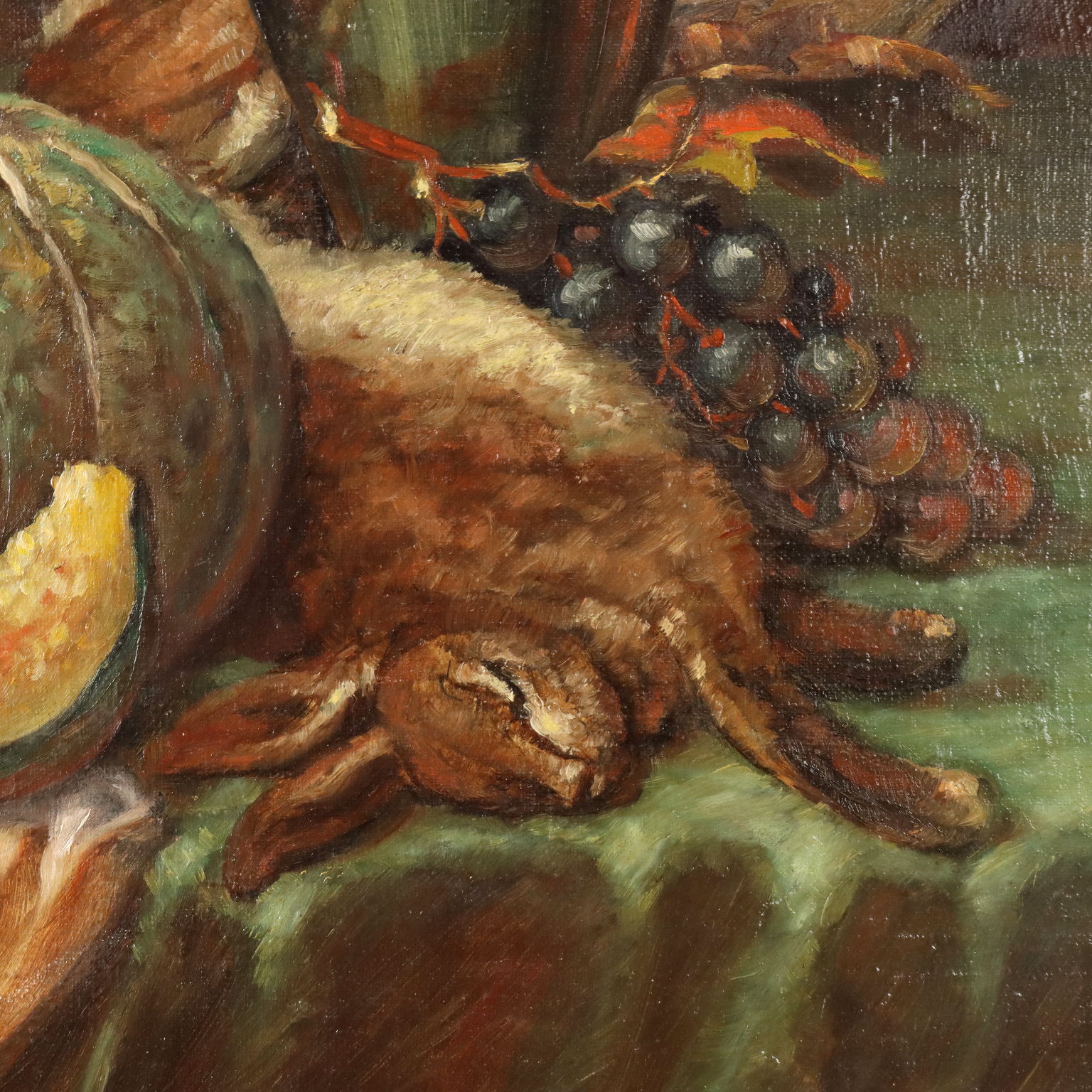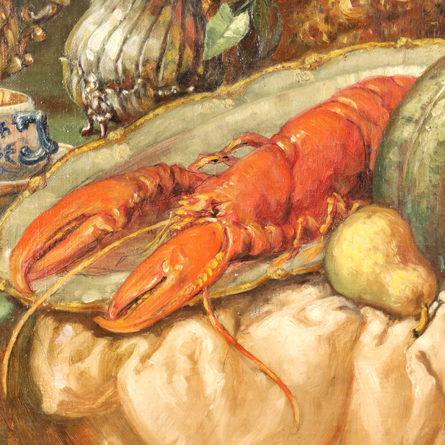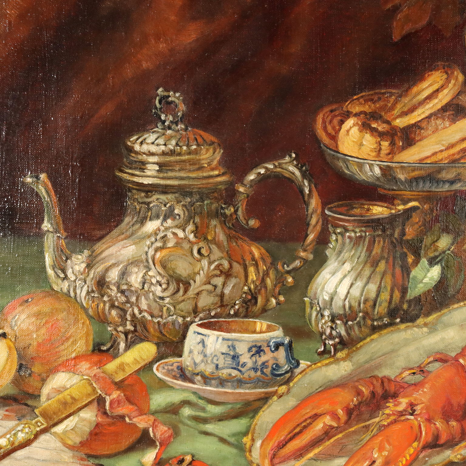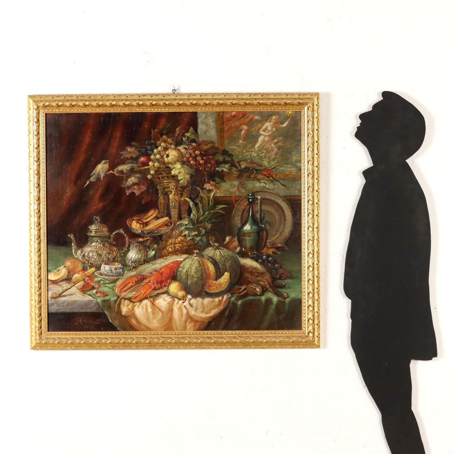 Olio su tela. Scuola centro-europea di inizio '900. firma no decifrata (J. Auer?) e data in basso a sinistra. Grande composizione di gusto antico, ambientata in una dimora signorile, per la ricchezza degli elementi d'arredo che ritrae. Spiccano l'astice al centro e la lepre sulla destra, collocati su una tavola riccamente imbandita di frutta variegata e di utensili. Tra questi la teiera in metallo sbalzato con la tazzina da tè in ceramica dipinta, e l'alzata portafrutta lavorata con elementi faunistici, presso la quale vi è un passerotto in cerca di cibo. Sullo sfondo a destra un dipinto con figura femminile. Il dipinto , restaurato e ritelato, è presentato in cornice in stile.