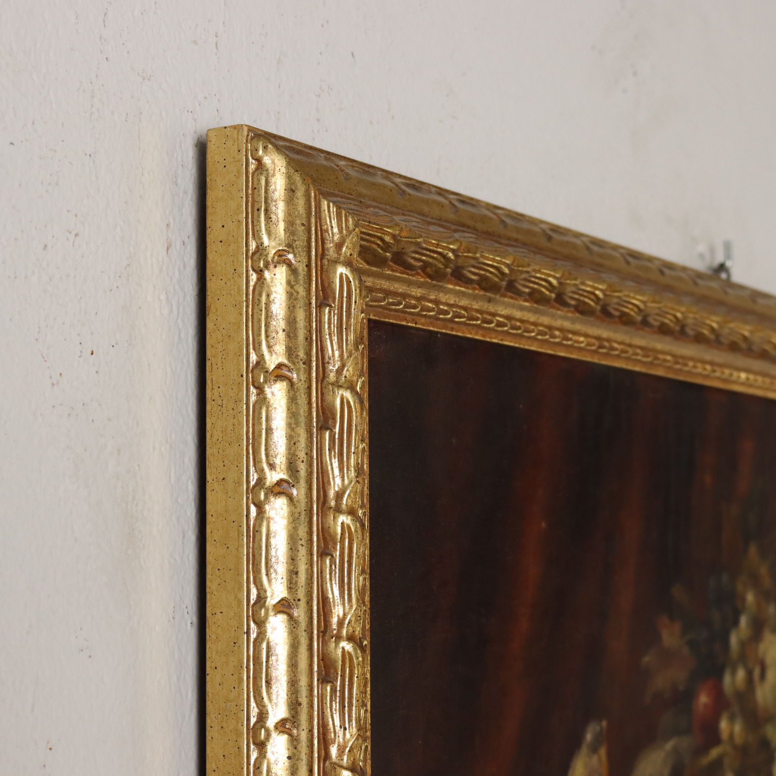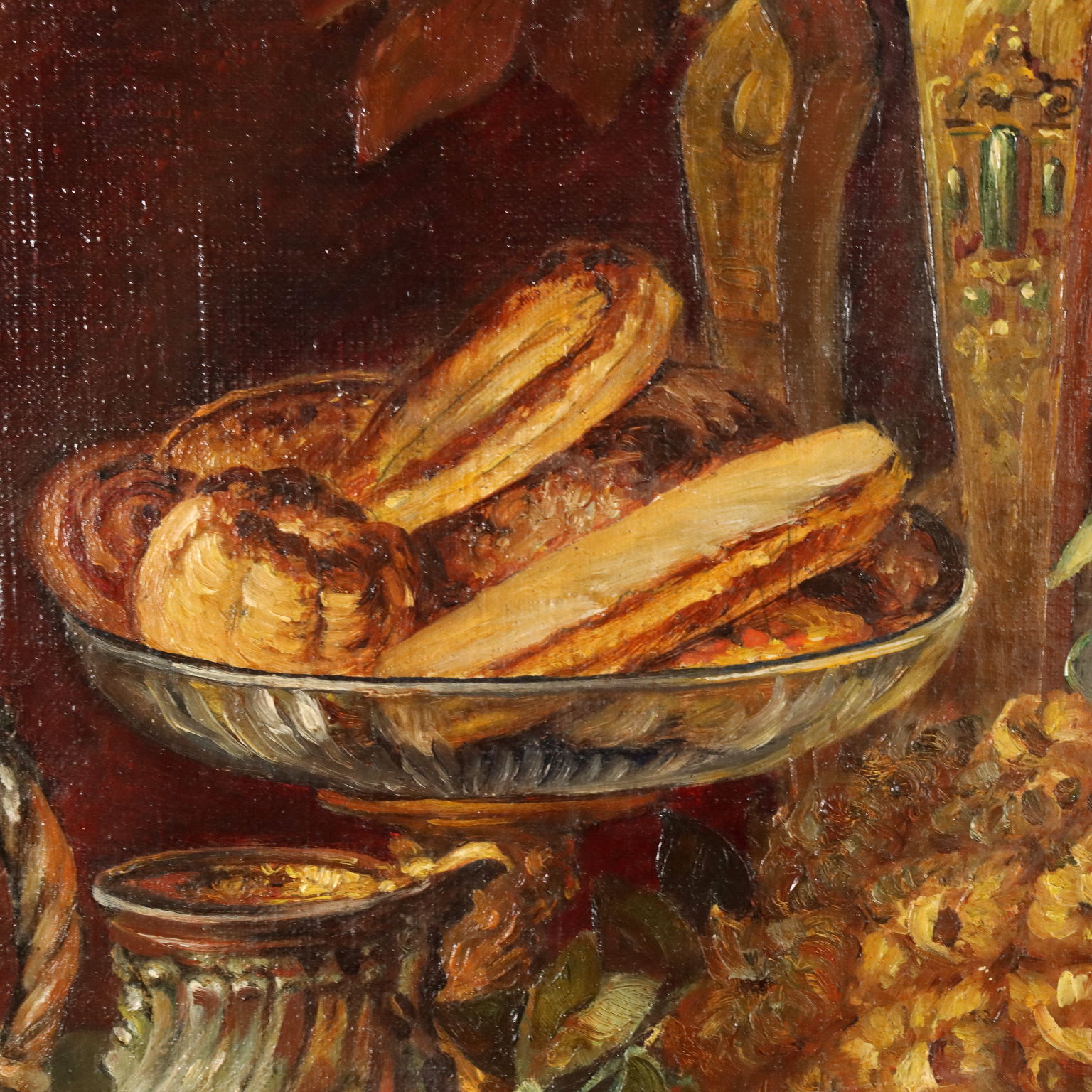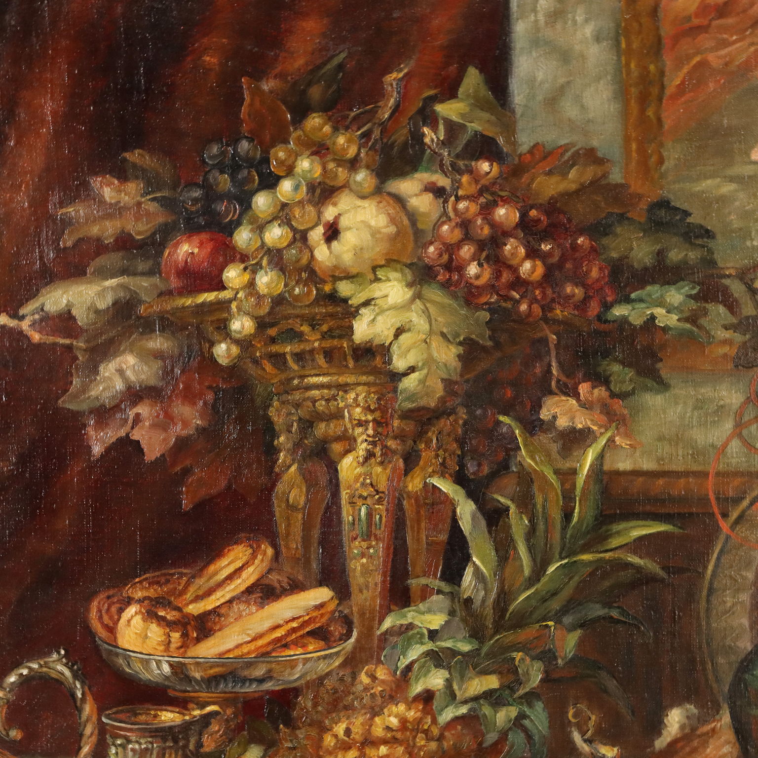 Olio su tela. Scuola centro-europea di inizio '900. firma no decifrata (J. Auer?) e data in basso a sinistra. Grande composizione di gusto antico, ambientata in una dimora signorile, per la ricchezza degli elementi d'arredo che ritrae. Spiccano l'astice al centro e la lepre sulla destra, collocati su una tavola riccamente imbandita di frutta variegata e di utensili. Tra questi la teiera in metallo sbalzato con la tazzina da tè in ceramica dipinta, e l'alzata portafrutta lavorata con elementi faunistici, presso la quale vi è un passerotto in cerca di cibo. Sullo sfondo a destra un dipinto con figura femminile. Il dipinto , restaurato e ritelato, è presentato in cornice in stile.