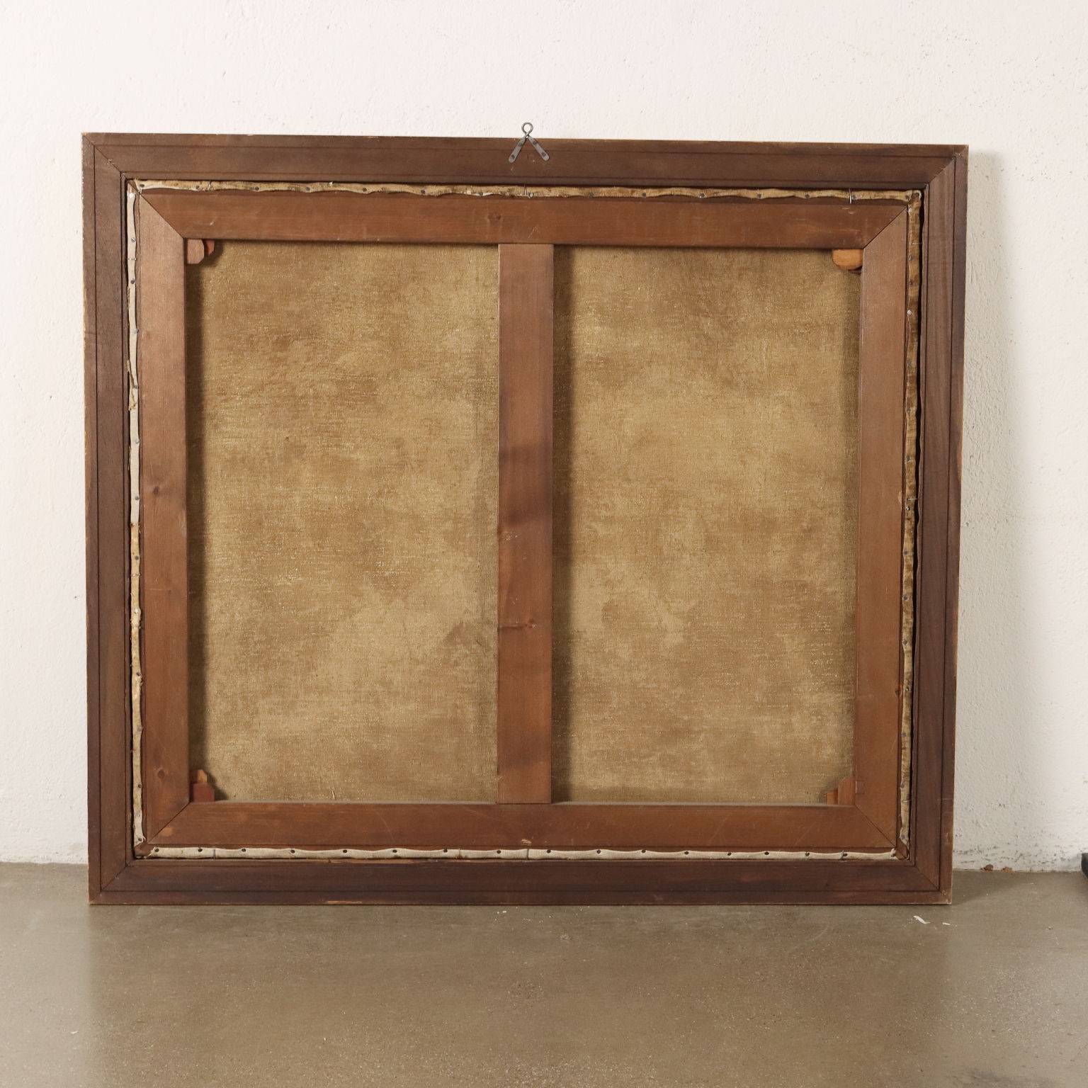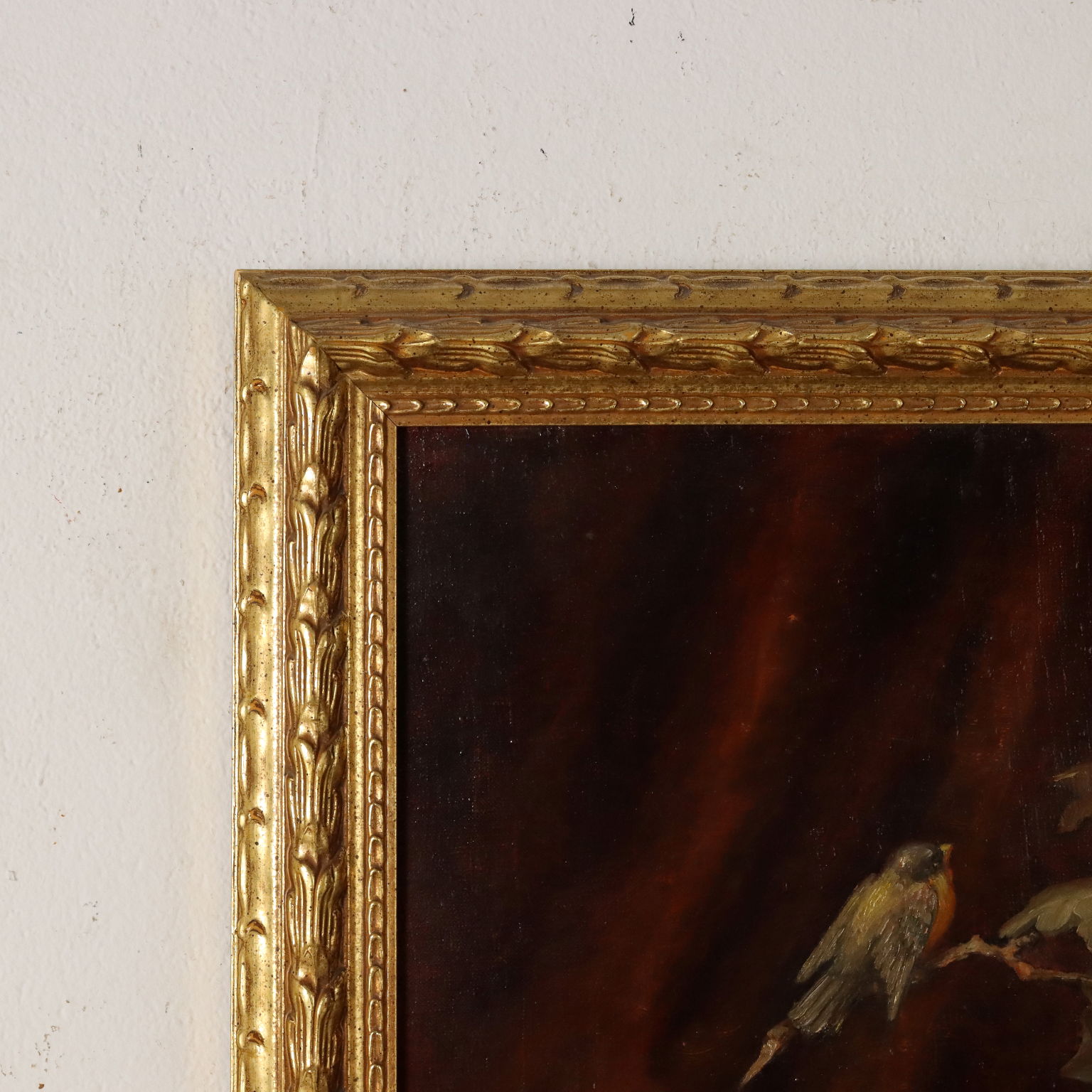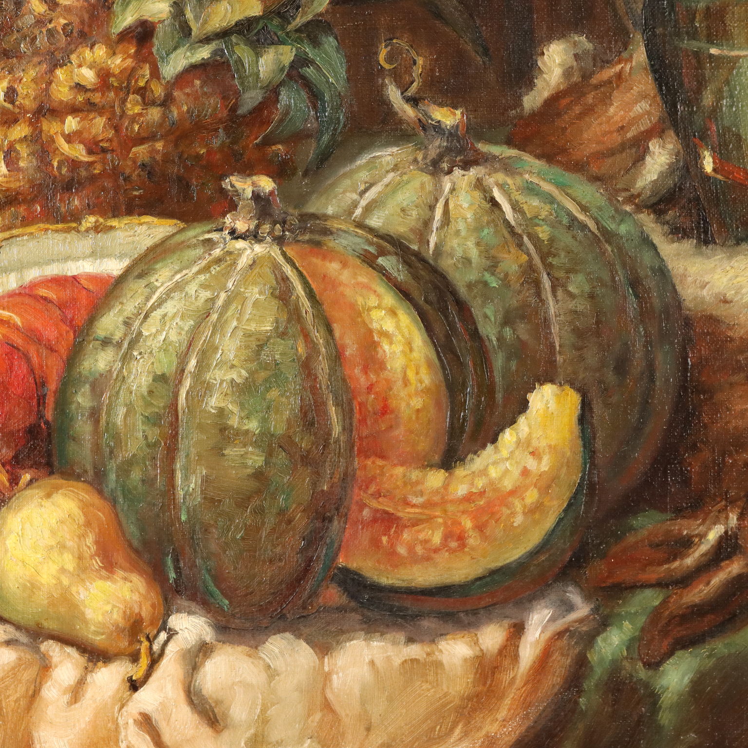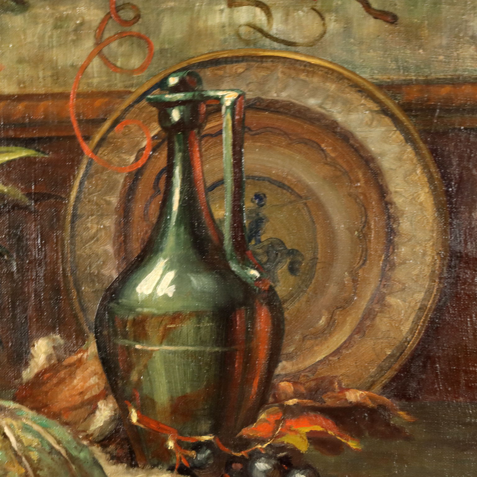 Olio su tela. Scuola centro-europea di inizio '900. firma no decifrata (J. Auer?) e data in basso a sinistra. Grande composizione di gusto antico, ambientata in una dimora signorile, per la ricchezza degli elementi d'arredo che ritrae. Spiccano l'astice al centro e la lepre sulla destra, collocati su una tavola riccamente imbandita di frutta variegata e di utensili. Tra questi la teiera in metallo sbalzato con la tazzina da tè in ceramica dipinta, e l'alzata portafrutta lavorata con elementi faunistici, presso la quale vi è un passerotto in cerca di cibo. Sullo sfondo a destra un dipinto con figura femminile. Il dipinto , restaurato e ritelato, è presentato in cornice in stile.