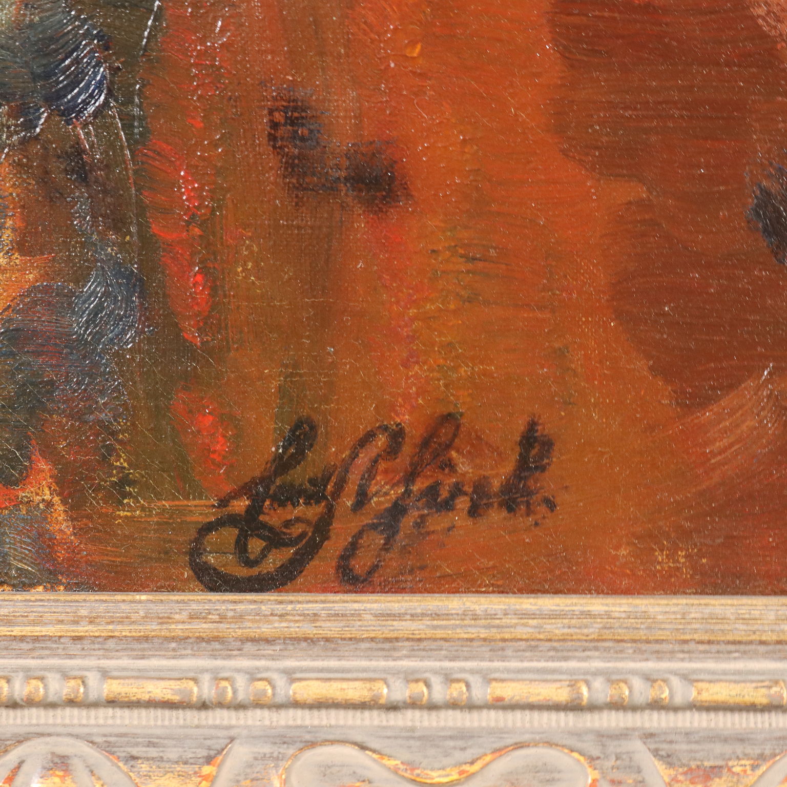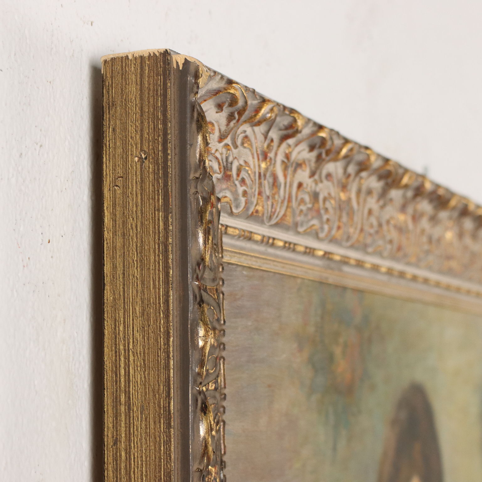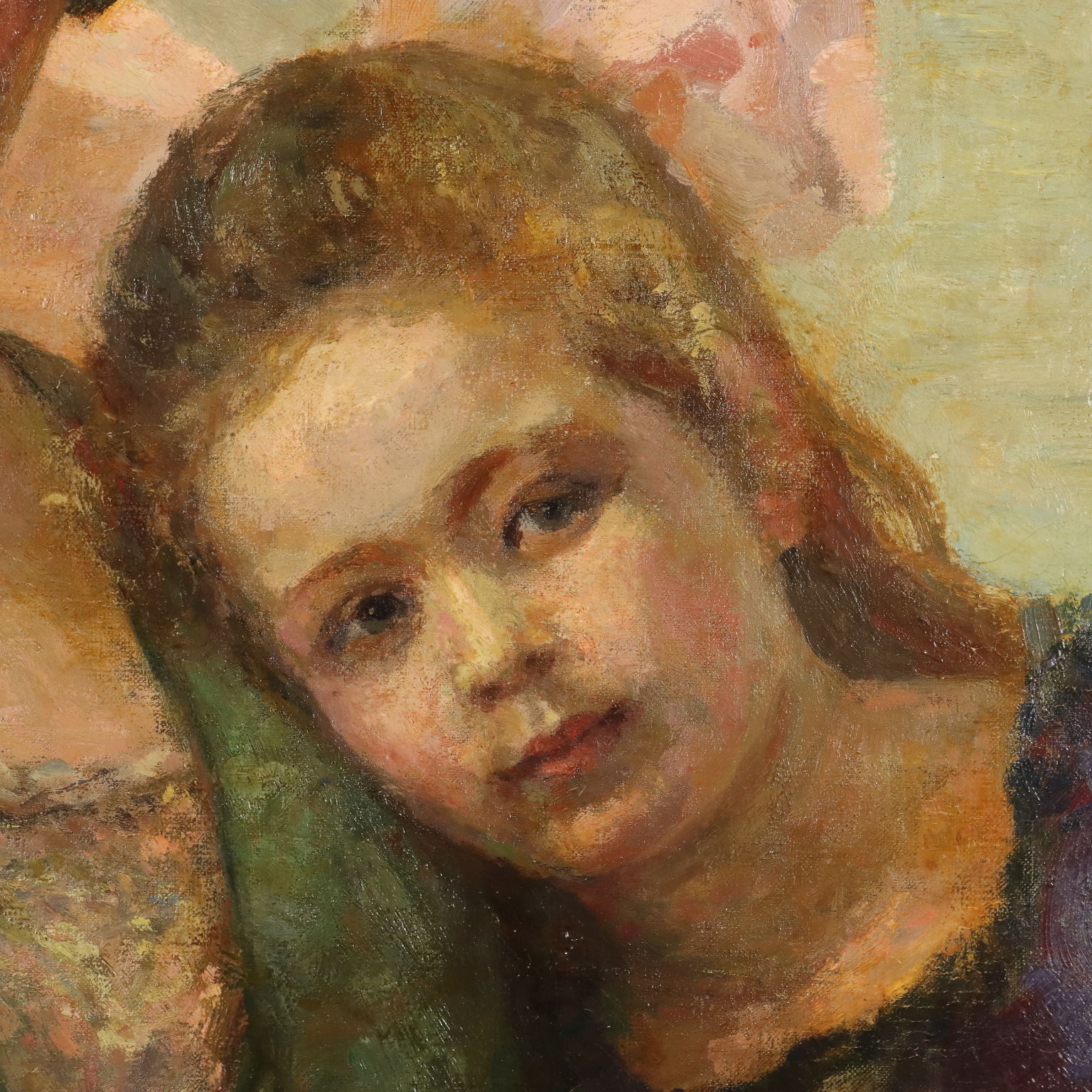 Olio su tela. Scuola centro-europea della prima metà del '900. Firma non identificata in basso a sinistra. Dolcezza e tenerezza traspaiono da queste due figure abbracciate, simili nei tratti del volto e nell'espressione, composte nei loro vestiti eleganti e vivaci, con lo sfondo di una carta da parati floreale. Il dipinto è presentato in cornice in stile.