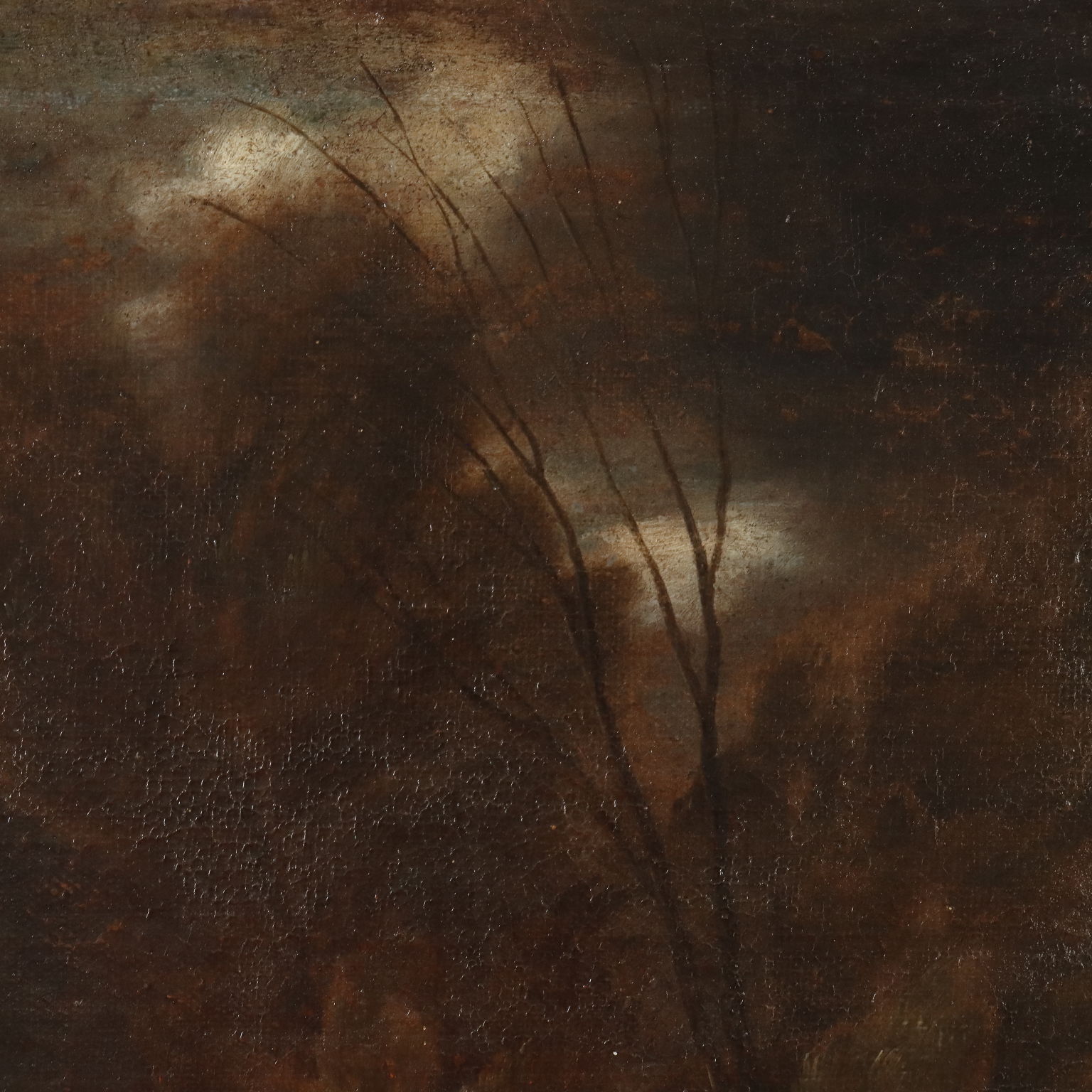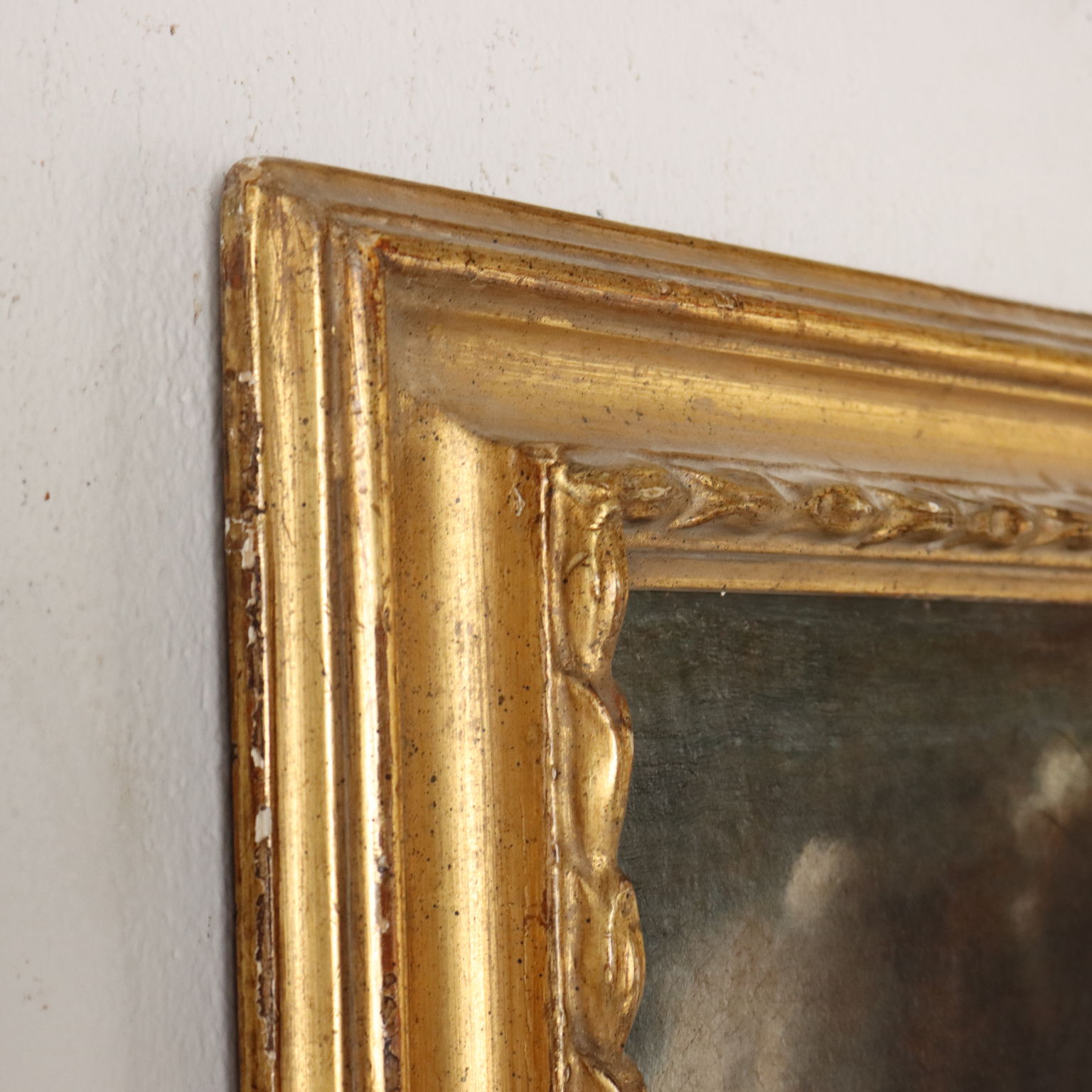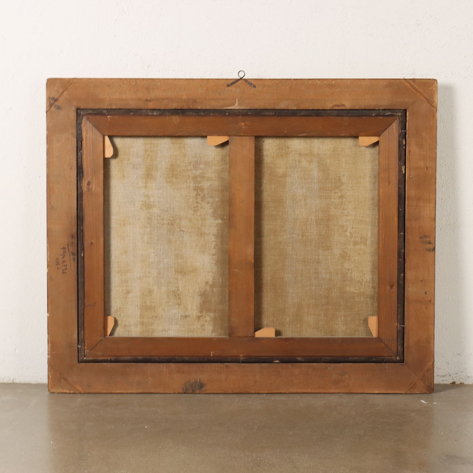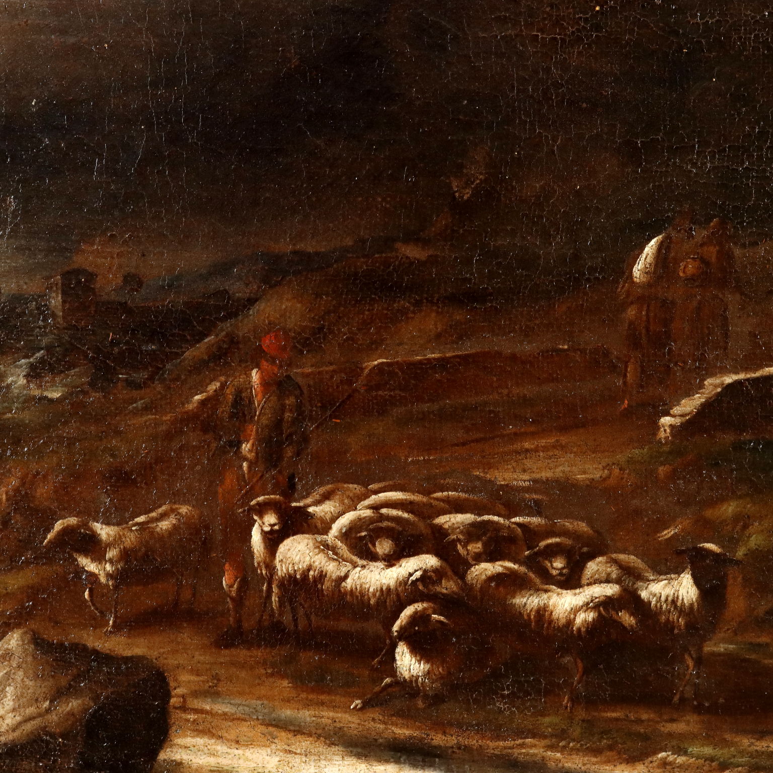 Olio su tela. In un paesaggio molto buio, con un pallido disco solare velato da nuvoloni scuri, preludio di un temporale, si erge sulla destra un rustico casolare, la stalla verso cui si dirige il pastore con il suo gregge, collocati sulla sinistra presso il torrente per l'abbeverata. Restaurato e ritelato, il dipinto è presentato in cornice in stile.