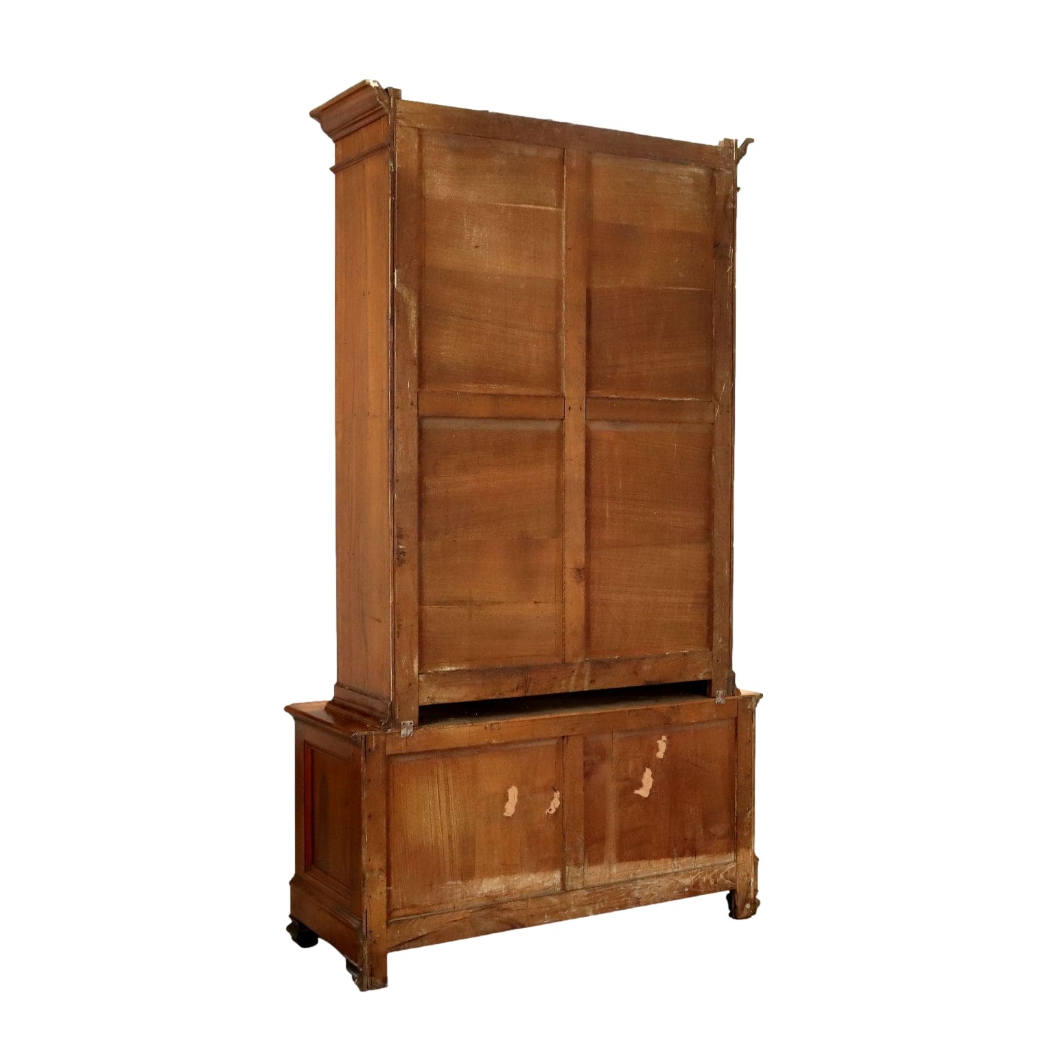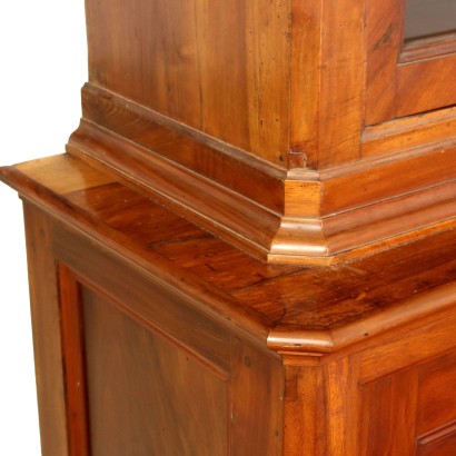 Libreria Umbertina in noce, base con ante pannellate, ante superiori con verti. Ripiani in Abete, piedi ebanizzati. Bocchetta mancante. Italia, ultimo quarto del XIX Secolo