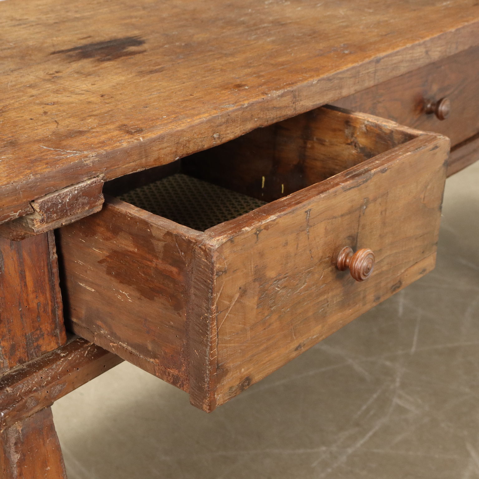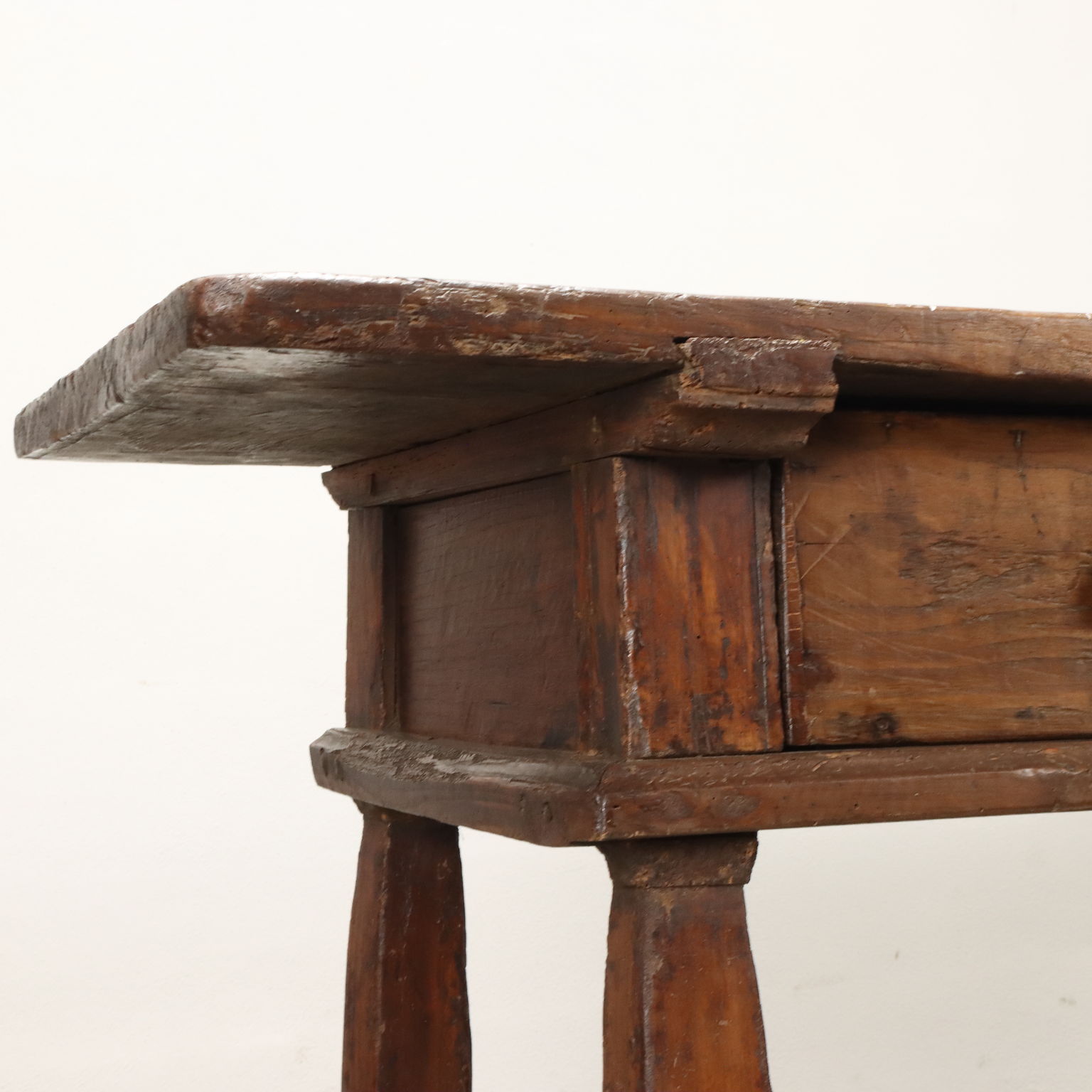 Tavolo Barocco in noce, piano in asse unica, tre cassetti nella fascia sottopiano. Piedi sostituiti. Spagna, inizio XVIII Secolo.