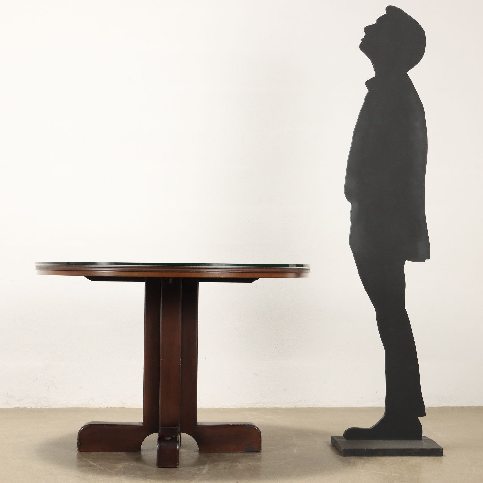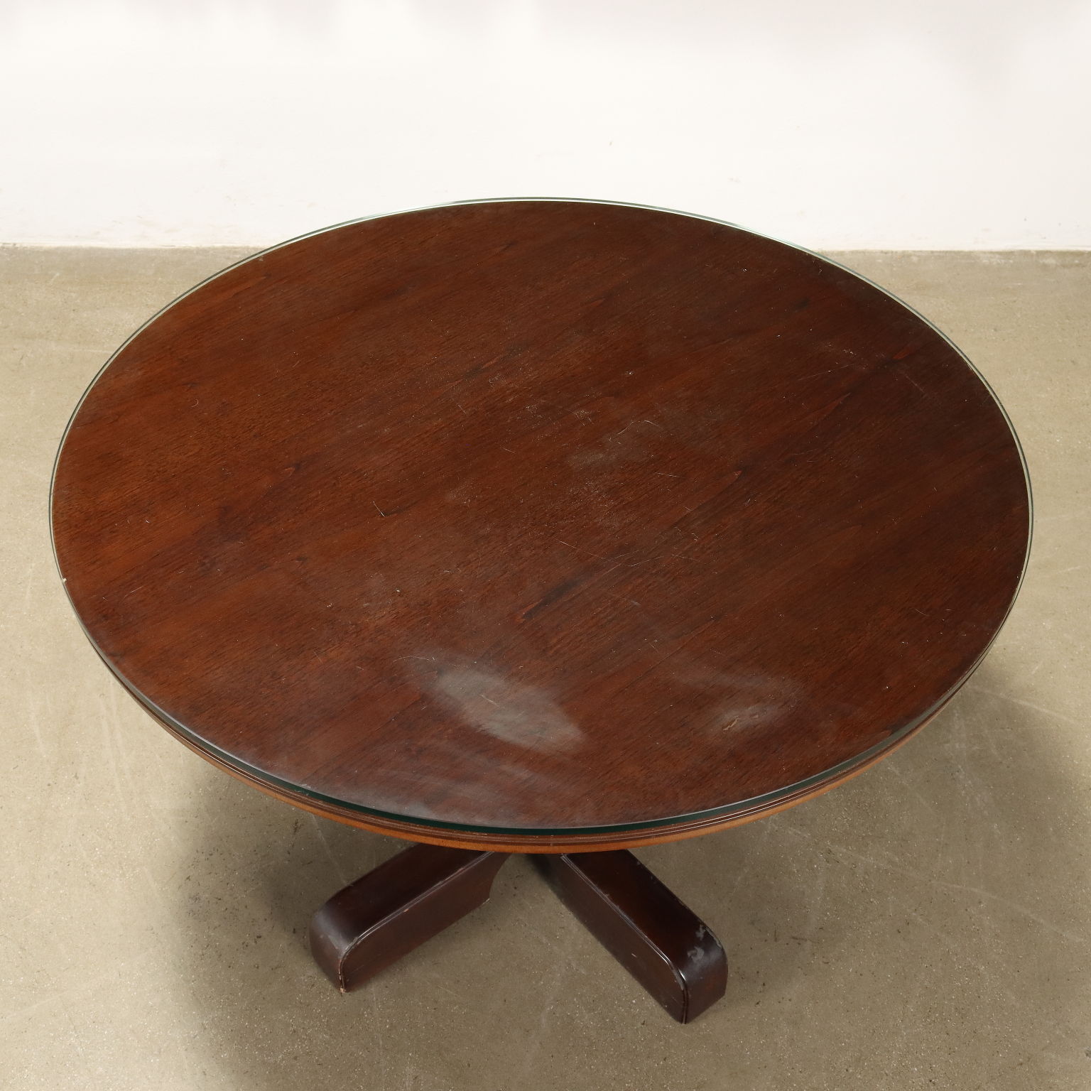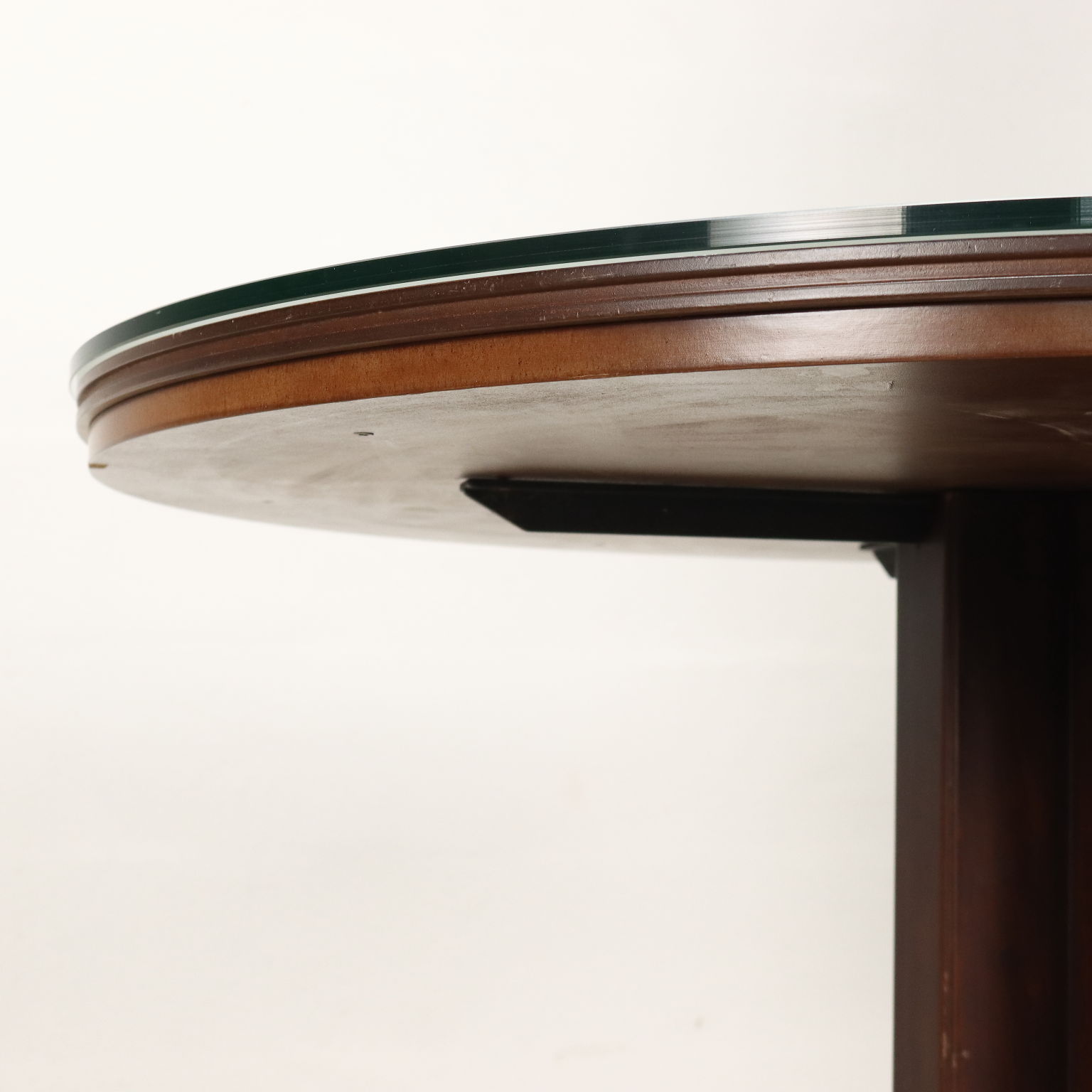 Tavolo con base in legno massello tinto, piano in legno impiallacciato legno esotico, vetro trasparente in appoggio.
