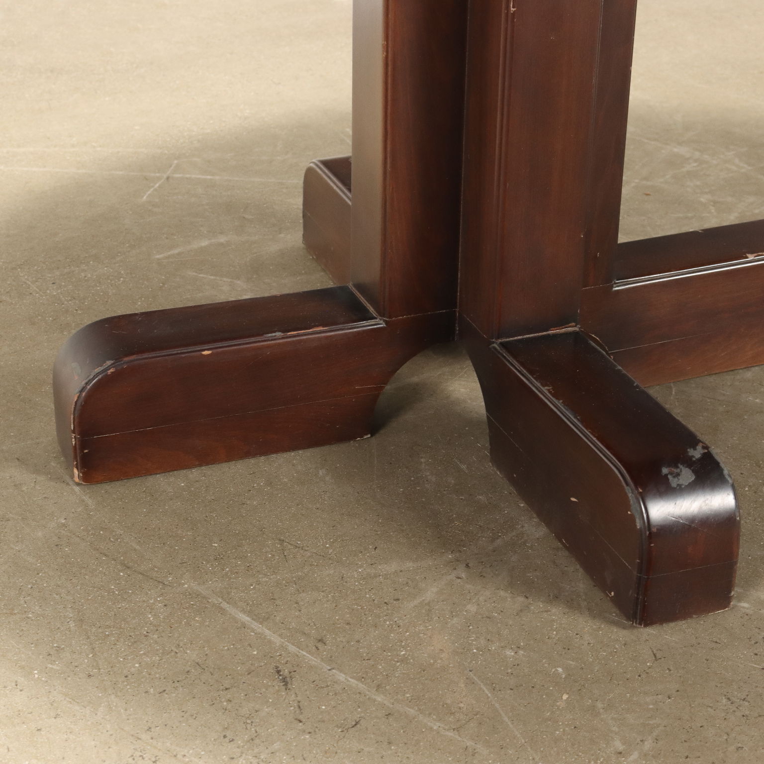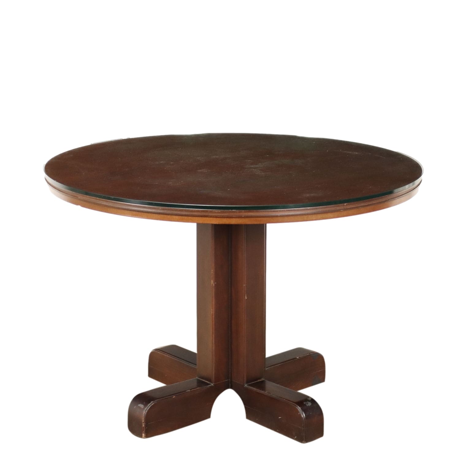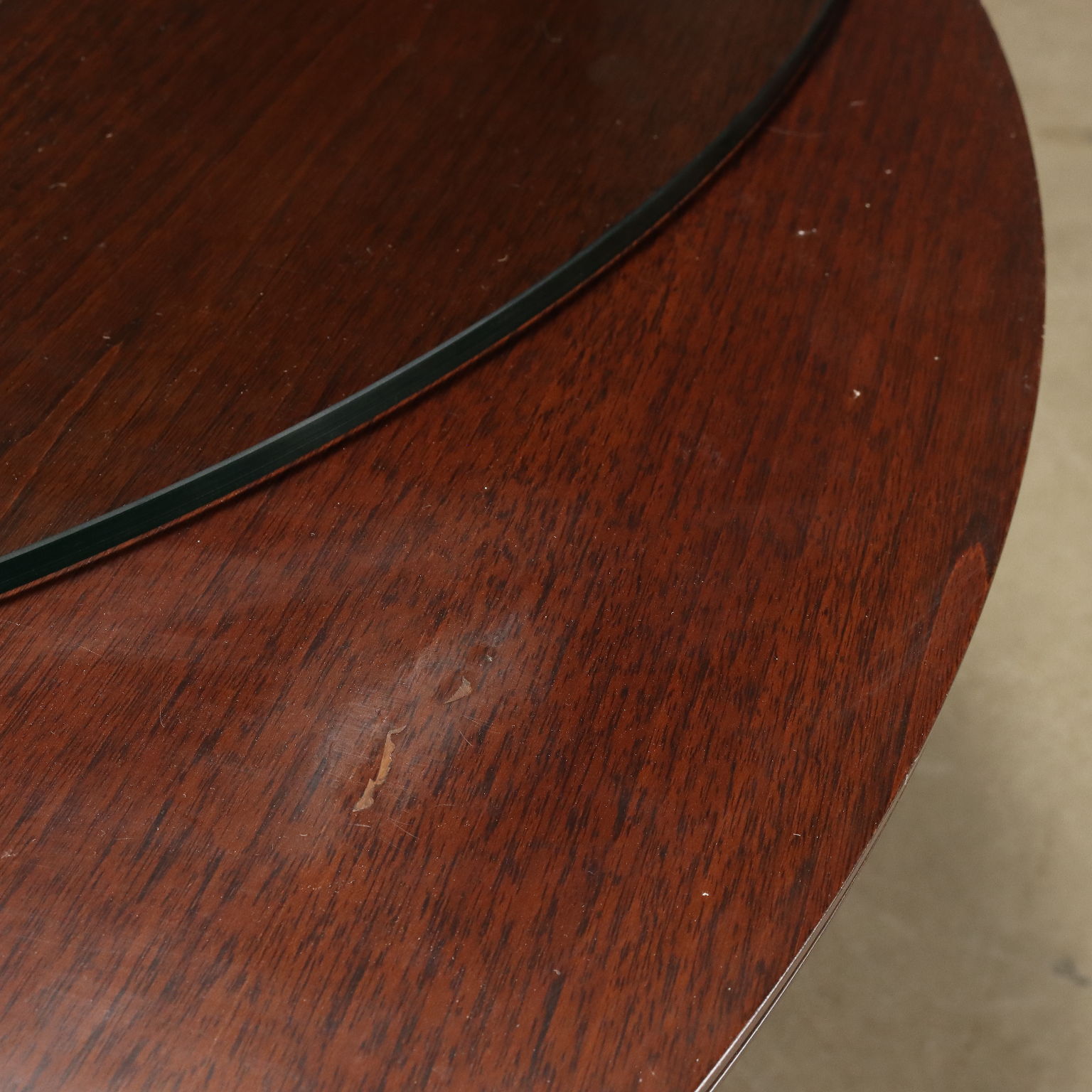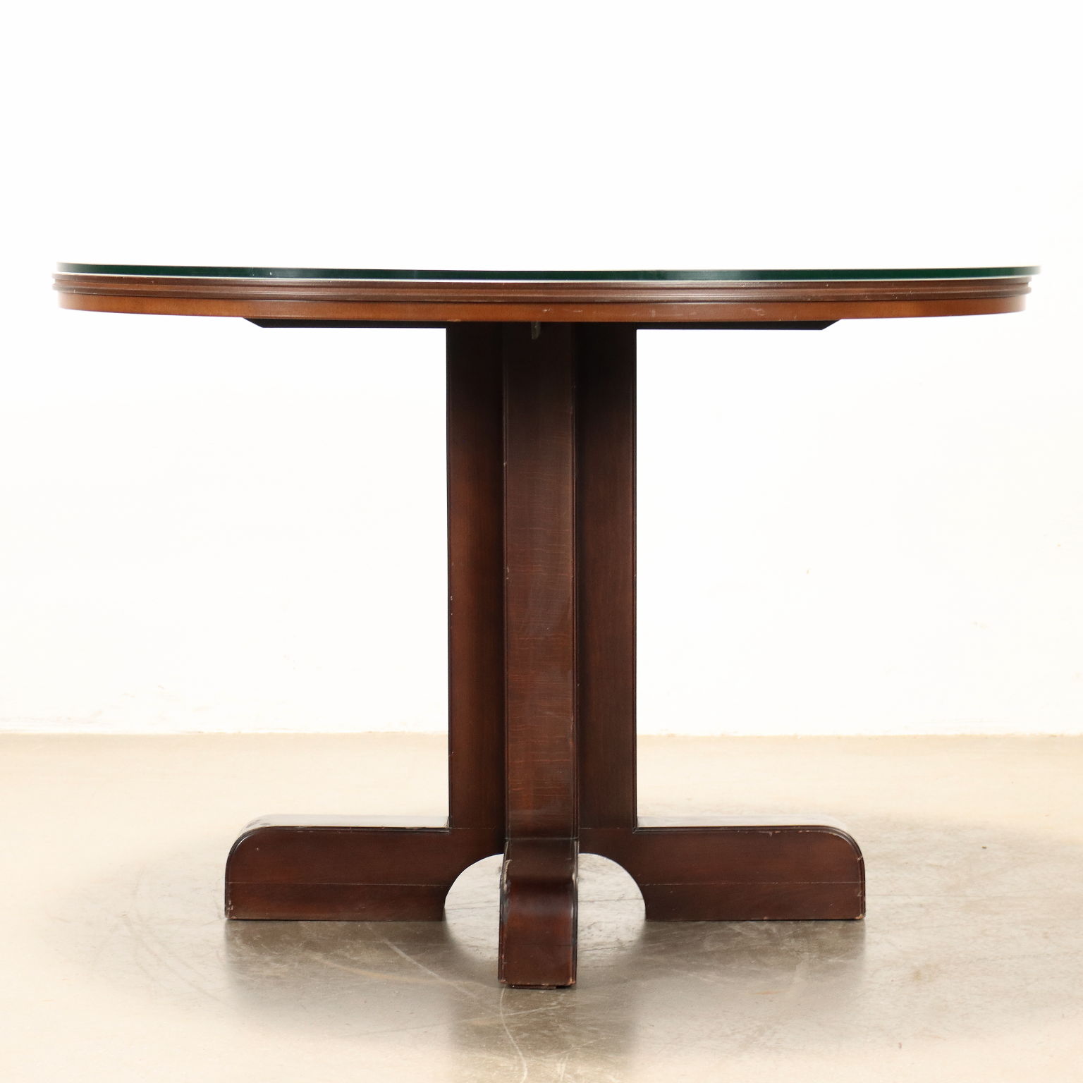 Tavolo con base in legno massello tinto, piano in legno impiallacciato legno esotico, vetro trasparente in appoggio.