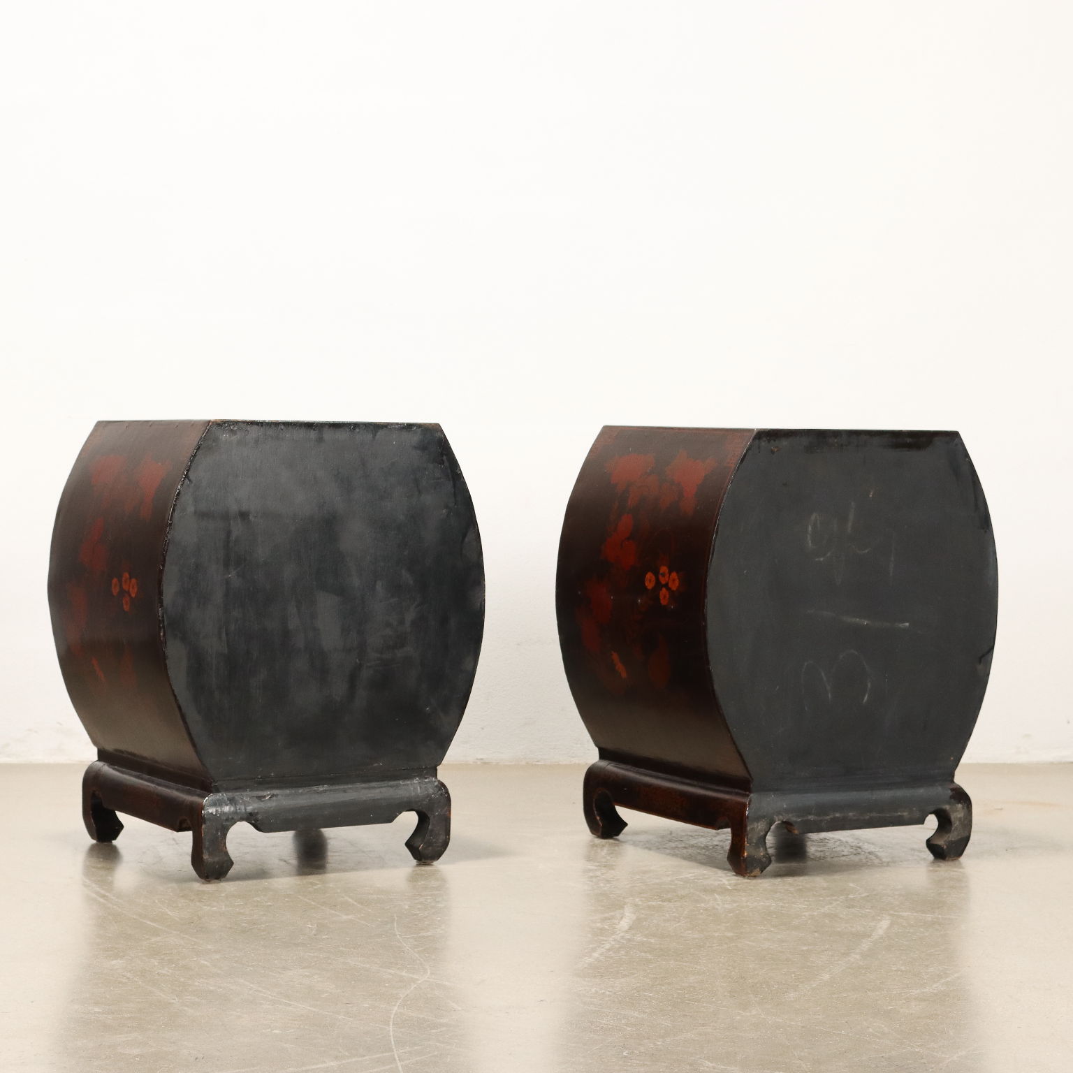 Coppia di comodini a Chinoiserie riccamente dipinti e laccati su tutta la superficie, interni ebanizzati. Cina, XX Secolo.