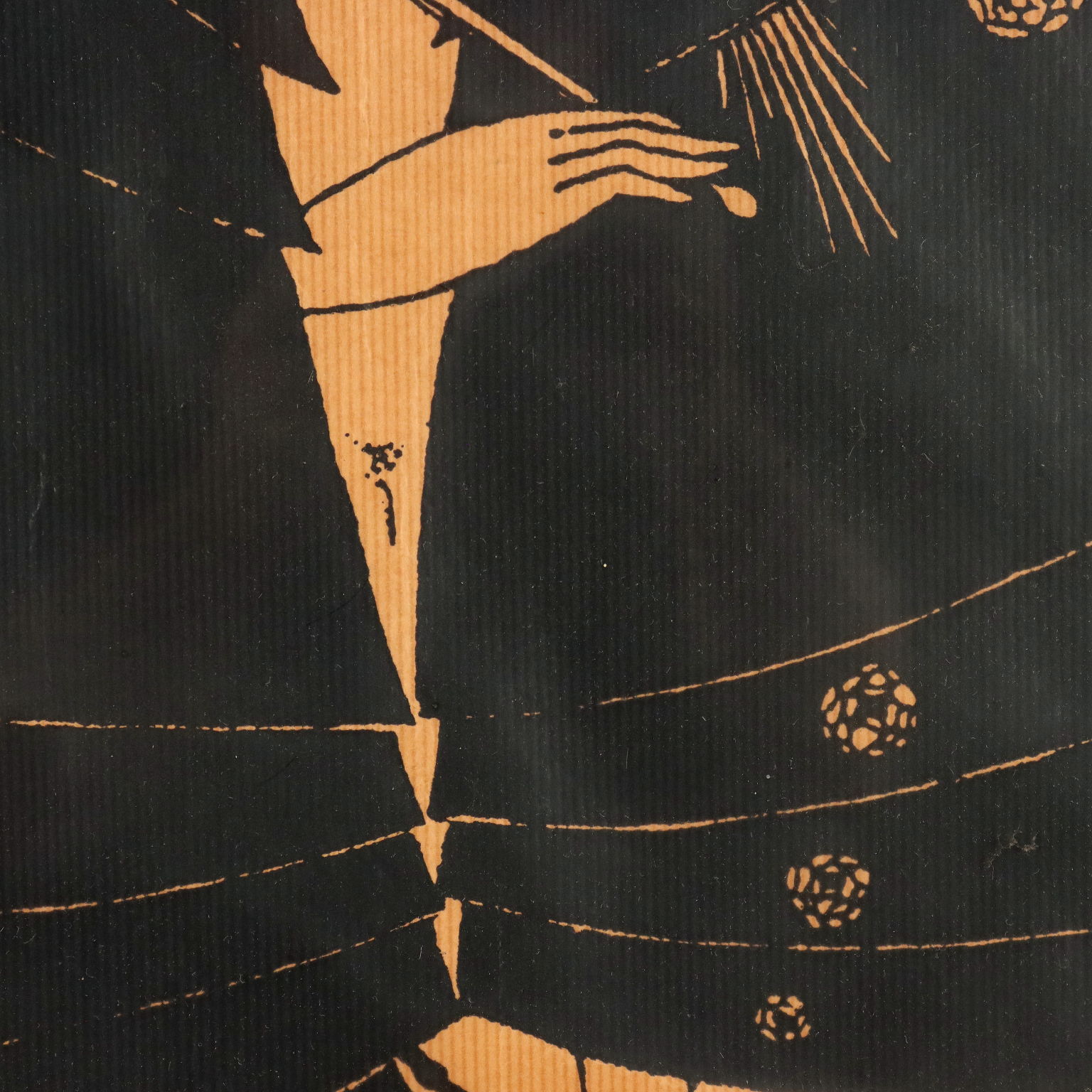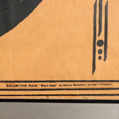 Stampa su carta. In basso la dicitura "Gallery Five PU4/IK - Black Cape by Audrey Beardsley - Printed in England". Si tratta di una riedizione degli anni '50-'60 a cura della galleria londinese di una delle illustrazioni liberty realizzate da Audrey Beardsley per il dramma teatrale di Oscar Wilde "Salomé: a tragedy in one act", scritto in francese nel 1891 da Oscar Wilde, pubblicato a Londra in inglese per la prima volta nel 1893 e uscito l'anno successivo corredato da sedici illustrazioni del giovane artista. Il genio irriverente di Wilde trovò piena risposta nei disegni di Beardsley: le elegantissime silhouette in bianco e nero di Beardsley sono l'esatta icona dello stile che il disegnatore e lo scrittore incarnavano, ovvero la figura del dandy che eleva se stesso e la sua vita ad opera d'arte, attraverso un egocentrico compiacimento della propria raffinatezza estetica. Le decorazioni piatte, asimmetriche, superficiali di Beardsley si proponevano in netto contrasto con il naturalismo trompe l'oeil, con tutto ciò che è volume o corpo plastico, con le forme massicce, pesanti, sovraccariche, con l'eccesso dei particolari, insomma con il gusto dell'epoca vittoriana matura. L'opera è presentata in cornice.