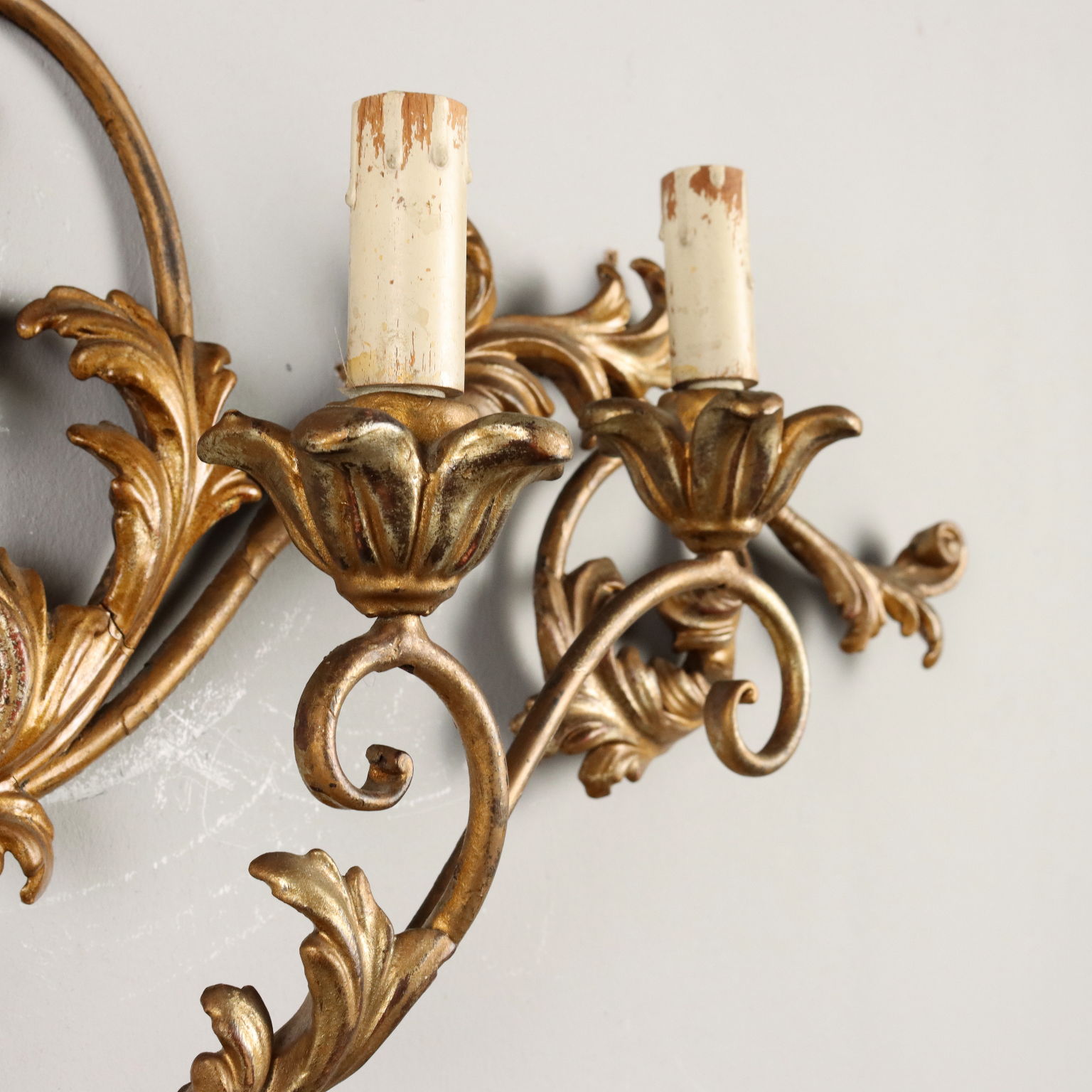 Applique 5 luci in ferro dorato, finemente adornata con intagli floreali e fogliacei in pastiglia dorata a mecca. Italia, XX Secolo.