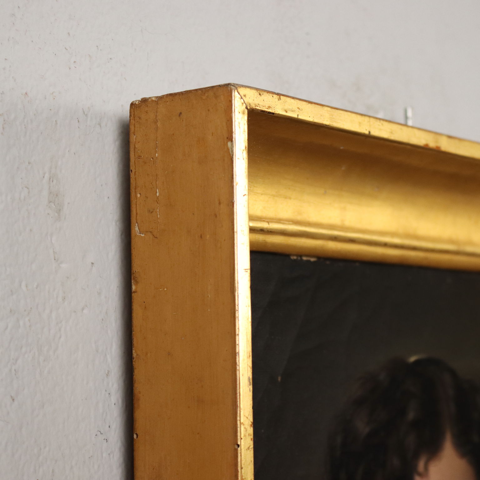 Olio su tela. Ritratto su sfondo monocromo di giovane signora, in lutto con l'abito rigorosamente nero, seppur arricchito dall' orecchino pendente in oro. Il dipinto presenta qualche caduta di colore, con un cretto piuttosto marcato. E' presentato in cornice coeva ridorata.