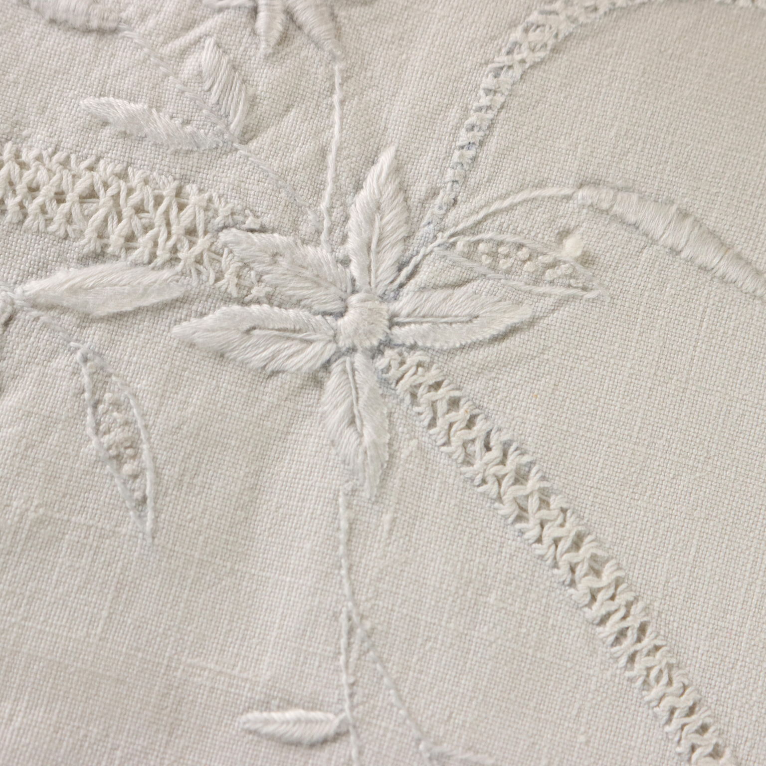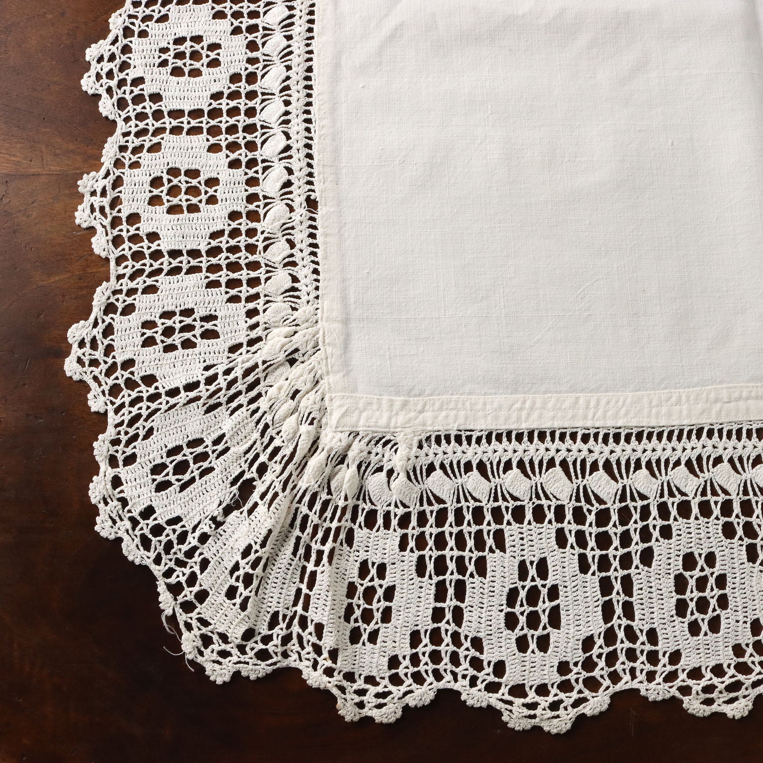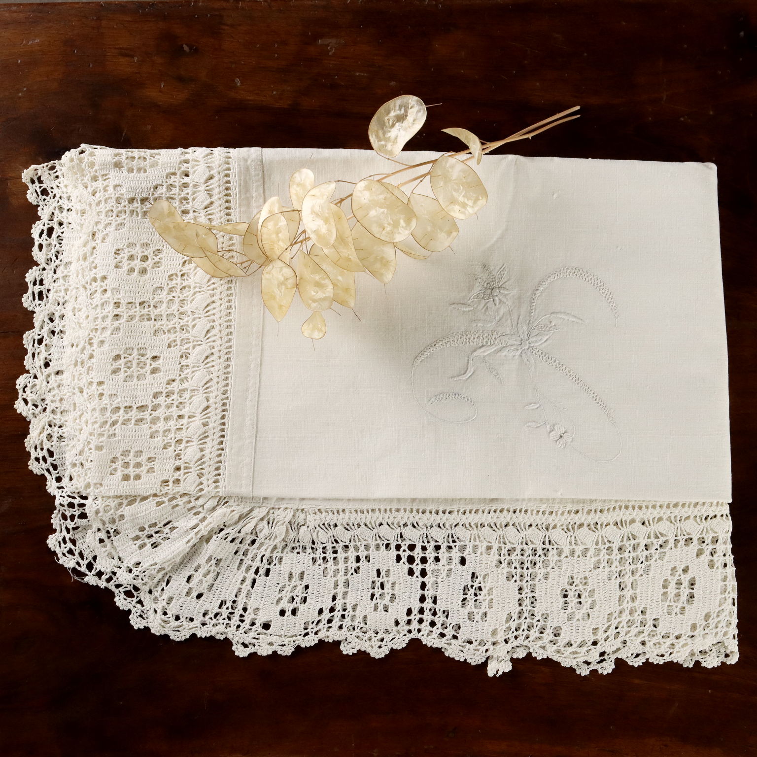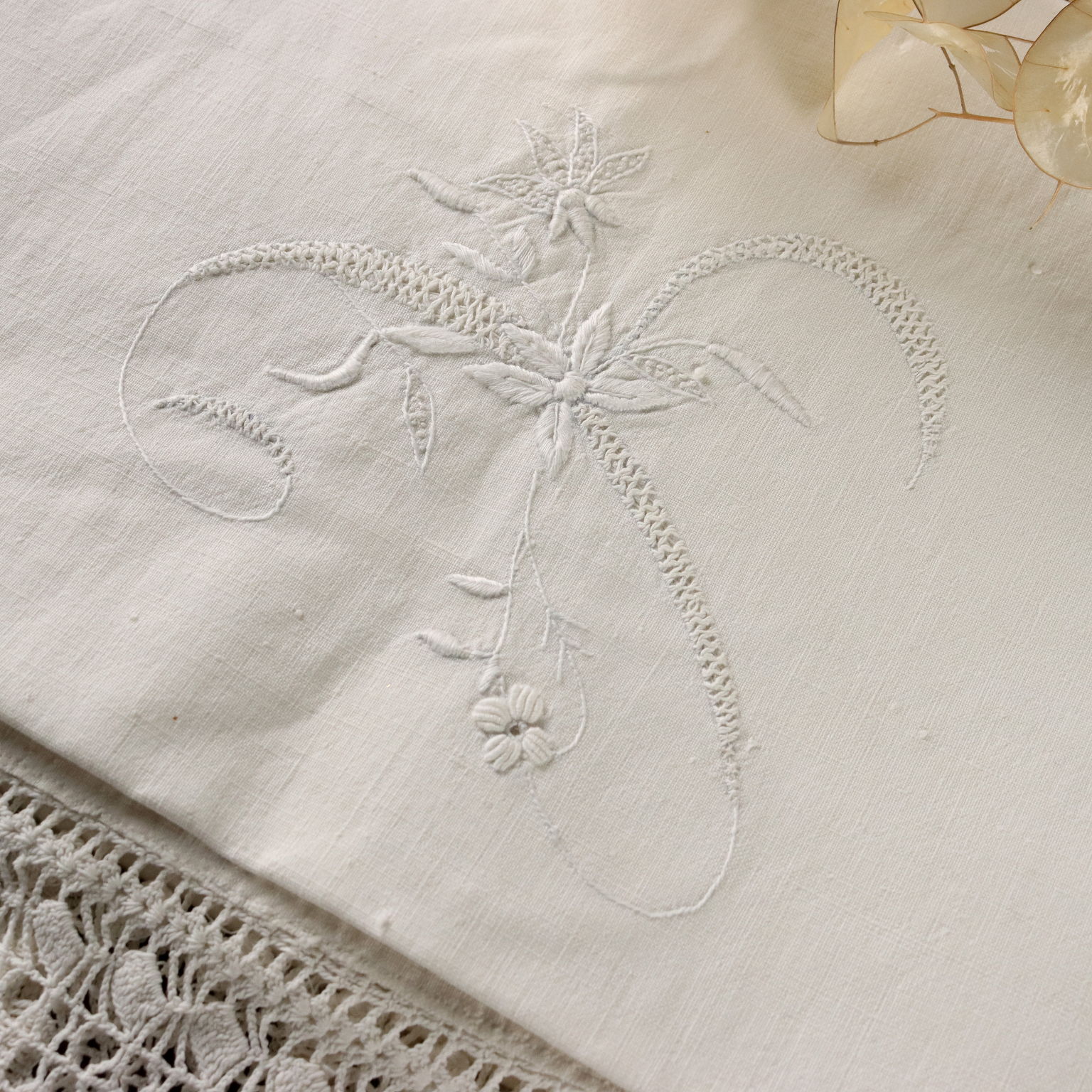 Finta matrimoniale con ricamo centrale in punto pieno e alta bordura con lavorazione ad ago Alcuni segni del tempo Colore bianco Composizione lino grezzo Dimensioni Cm 200 x cm 83 bordura cm 12