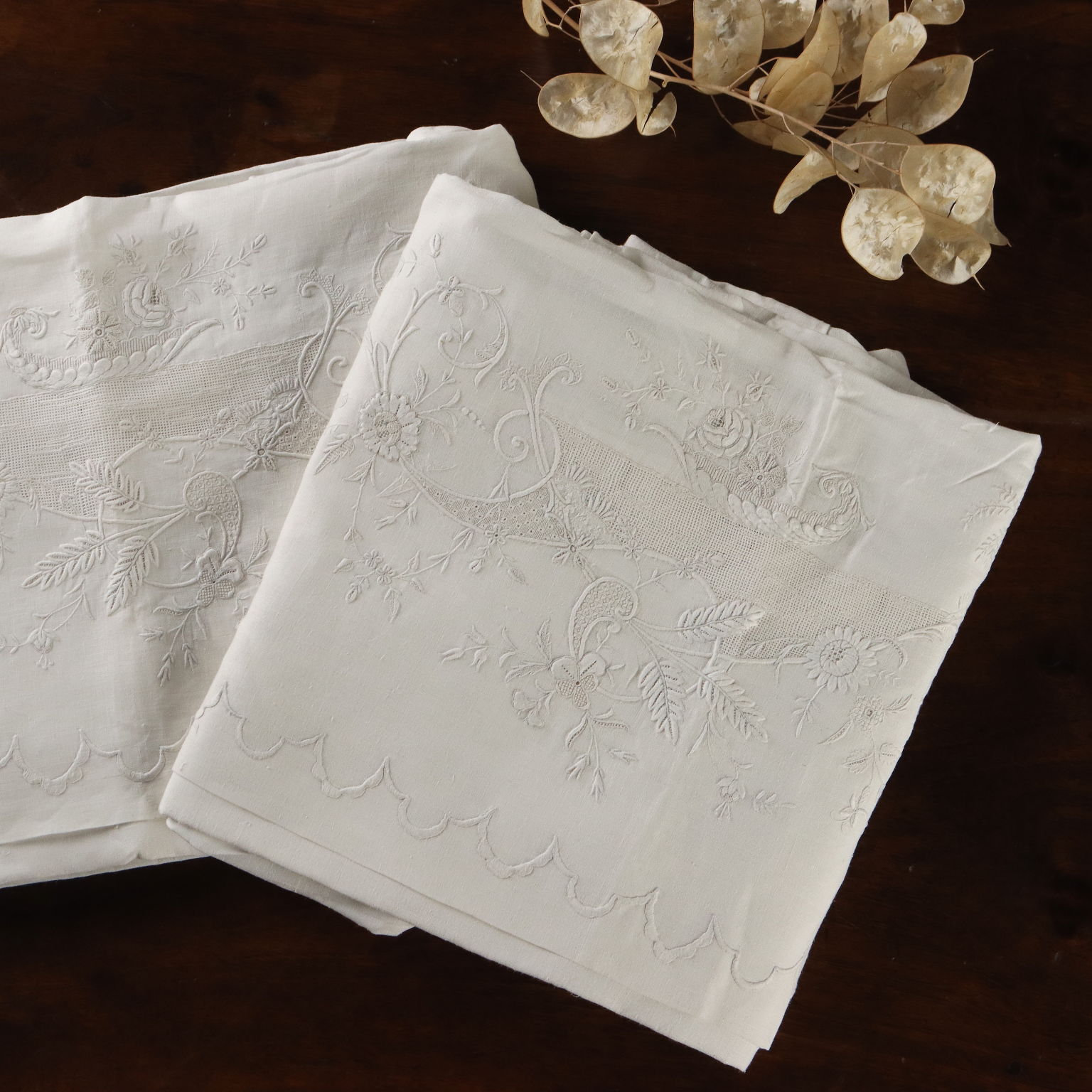 Bellissima coppia di federe con importante ricamo centrale e alta bordura in punto rodi e punto pieno a motivo floreale Colore bianco Composizione lino Dimensioni cm 87 x cm 85 bordura 28
