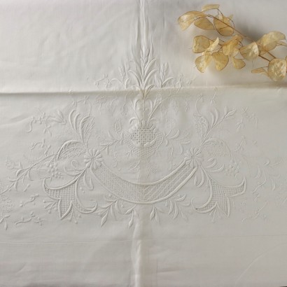 Lenzuolo Matrimoniale in lino Bellissima ed elegante la reversina ricamata in punto rodi e punto pieno che dona rilievo al ricamo In alcuni punti sono presenti segni del tempo Colore bianco Composizione lino Dimensioni cm 288 x cm 262