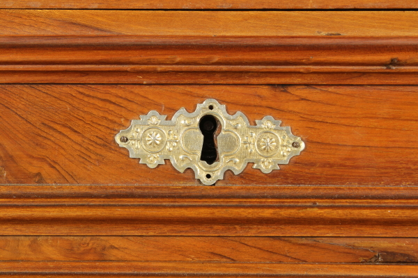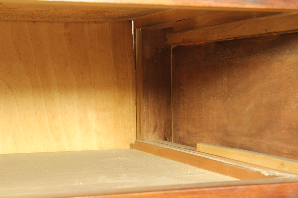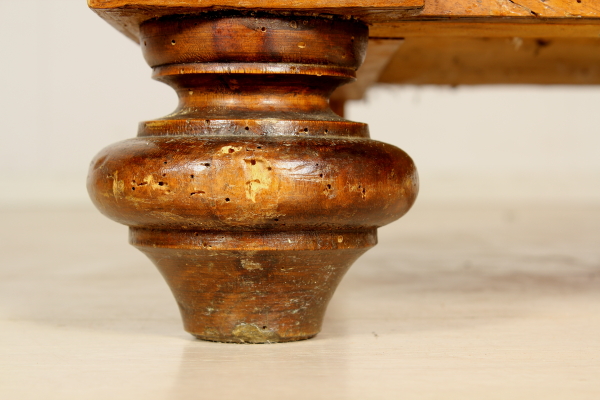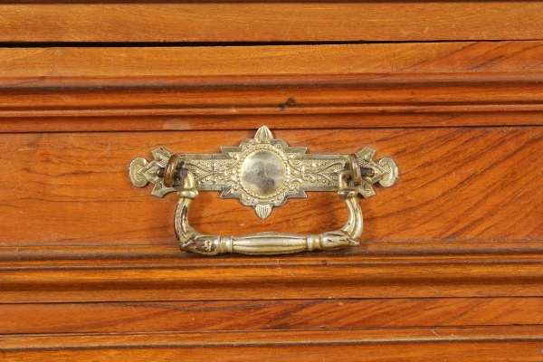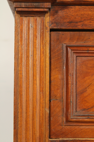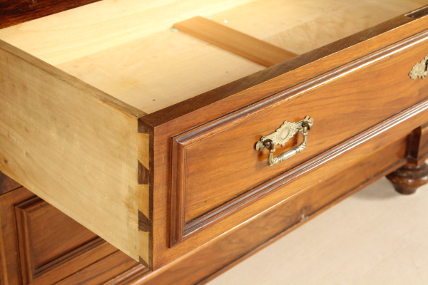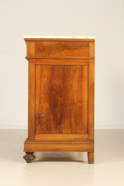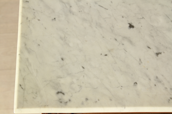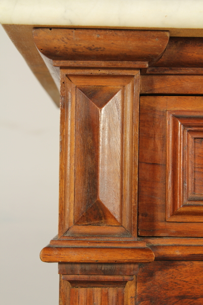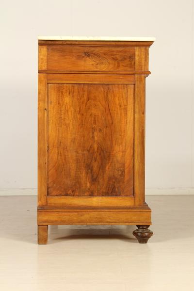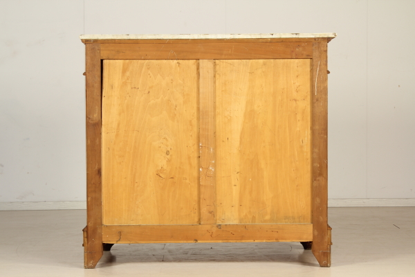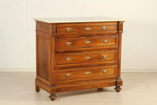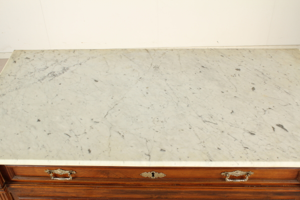 Presenta montanti scanalati terminanti con piedi torniti. Sul fronte quattro cassetti. Piano in marmo di Carrara.