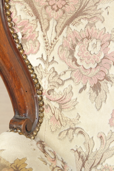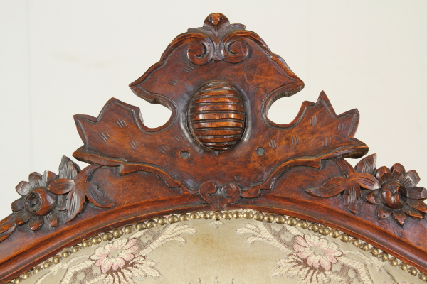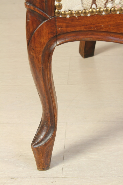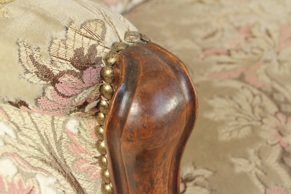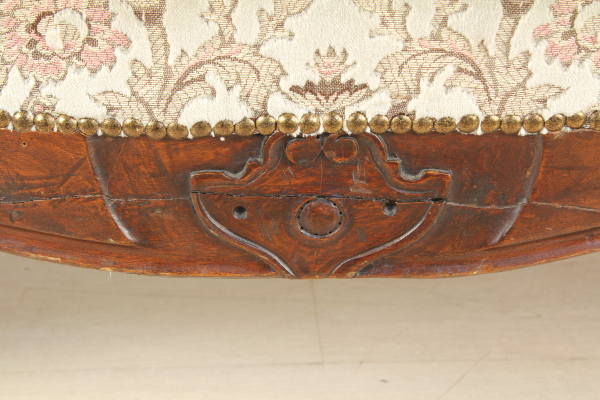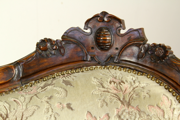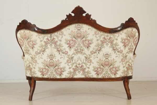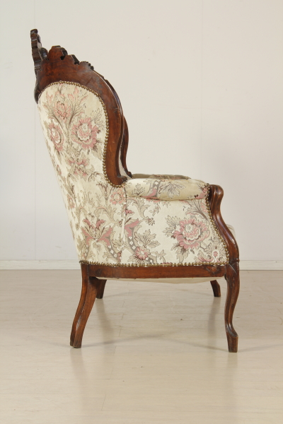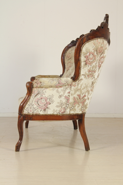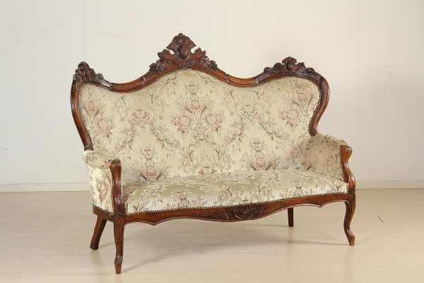 Montanti e gambe mossi e intagliati.Schienale tripartito con cimase intagliate. Interamente imbottito.