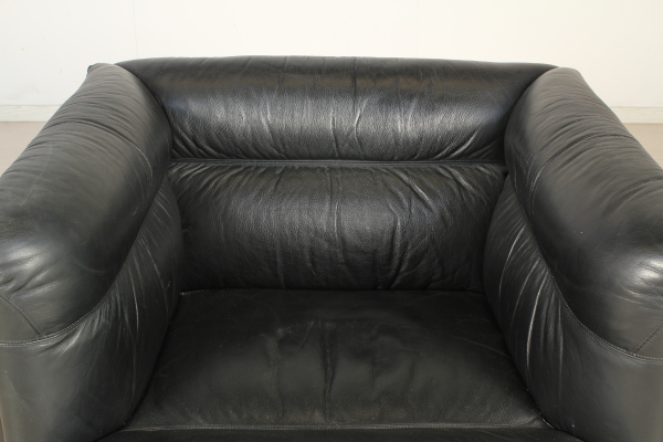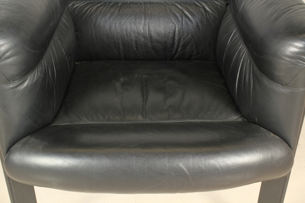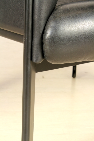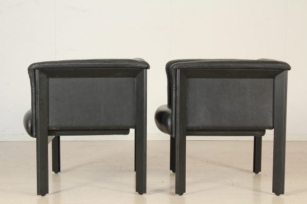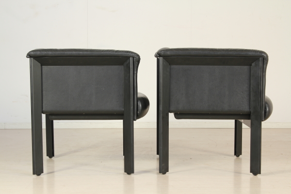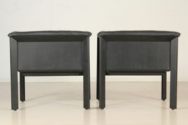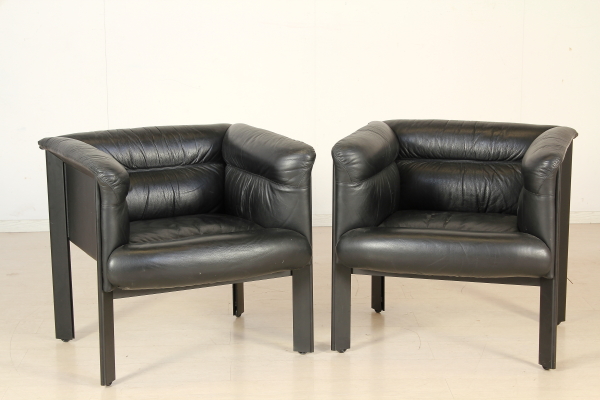 Coppia di poltrone; struttura in metallo, imbottitura in espanso, rivestimento in pelle. Buone condizioni, presentano piccoli segni di usura.