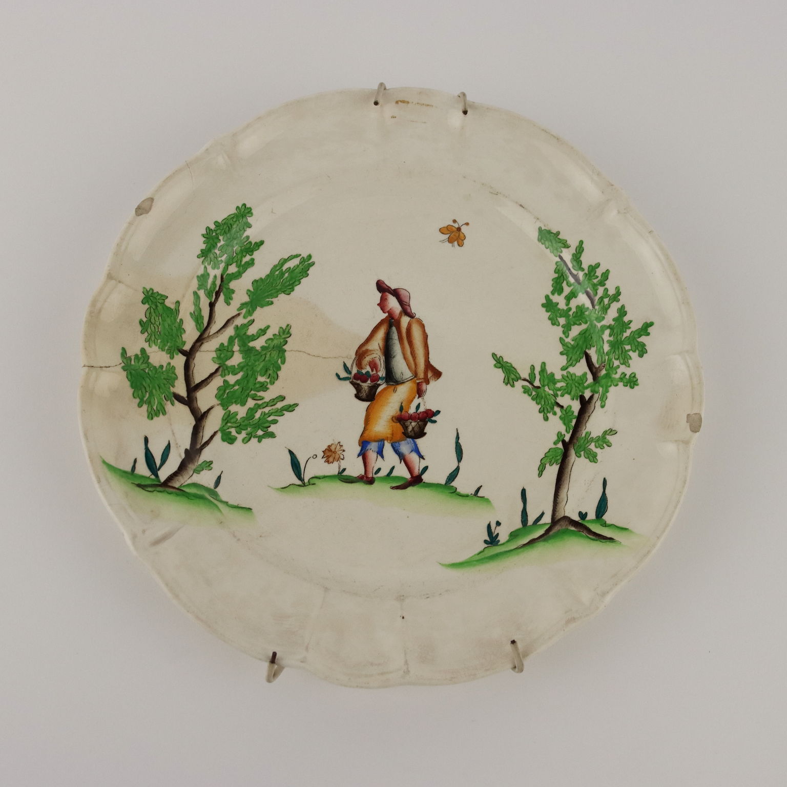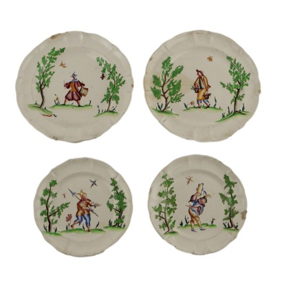 Gruppo di quattro piatti in ceramica decorati con figure a smalti policromi. Guido Andlovitz per Laveno, marchio della manifattura sotto la base.
