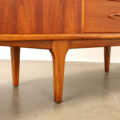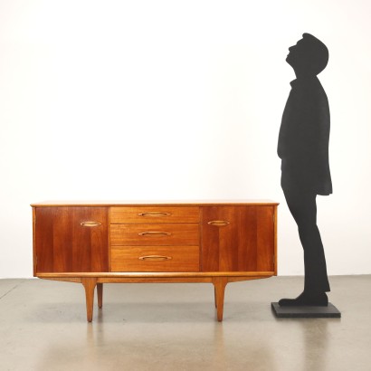 Sideboard ad ante battenti, cassetti centrali a vista, legno impiallacciatura di teak, accuratamente e completamente restaurato dal nostro laboratorio. Restaurato.