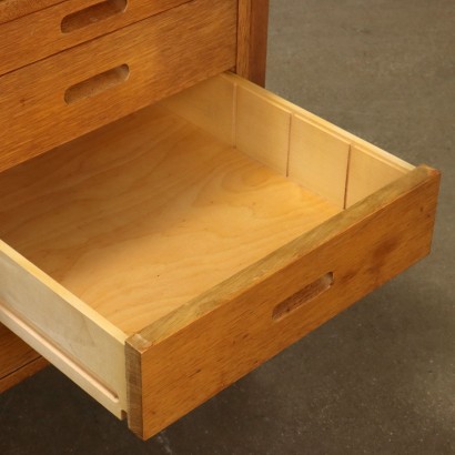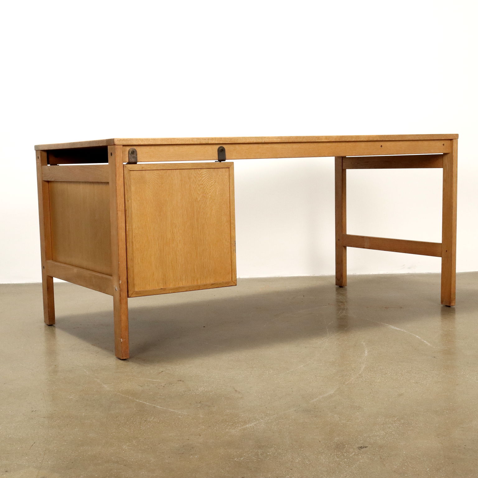 Scrivania con colonna cassetti laterale, legno massello e impiallacciatura di rovere.