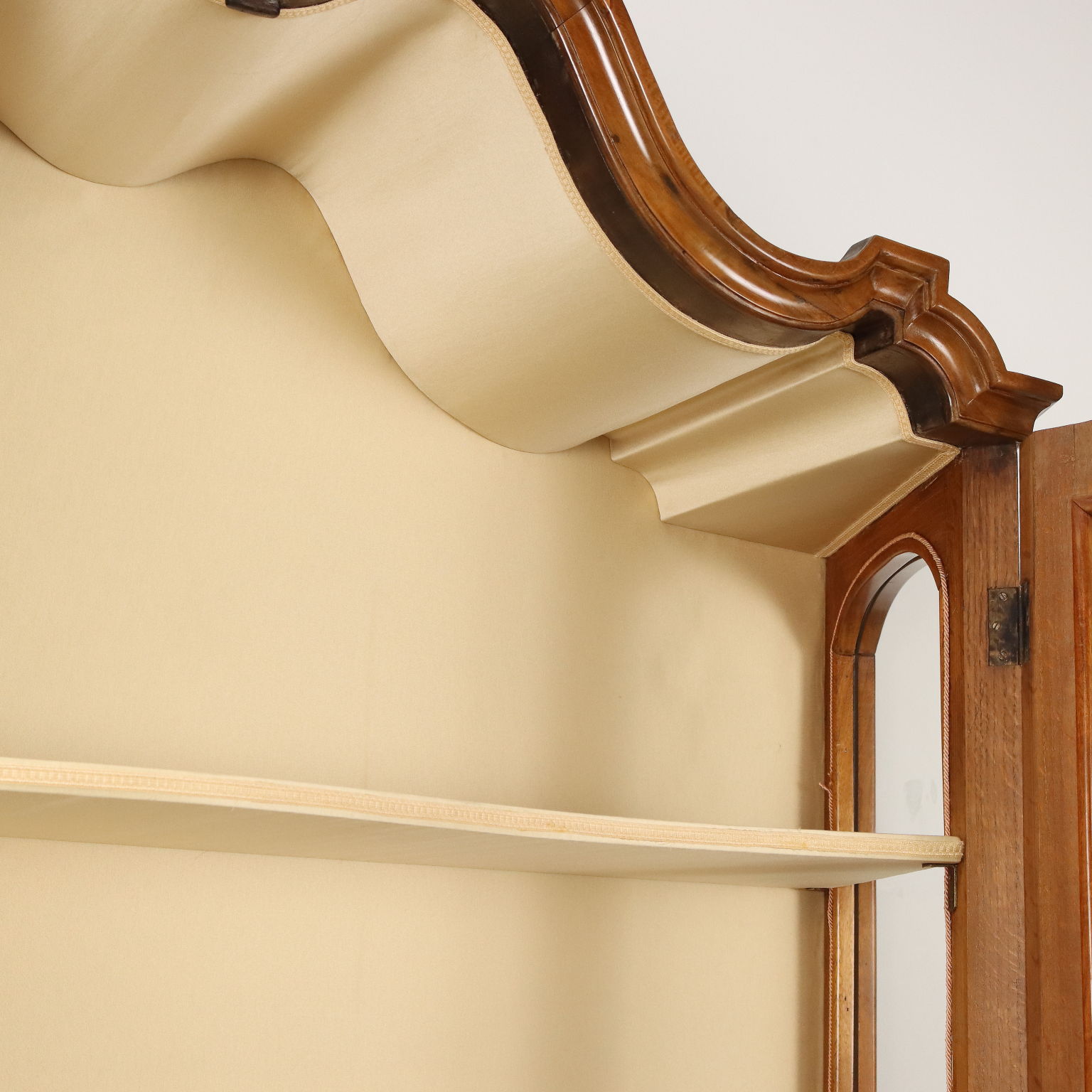 Vetrina in stile barocchetto olandese sorretta da piedi a mensola intagliati, il corpo bombato presenta tre cassetti con maniglie e bocchette in bronzo; alzata con coppia di ante con vetri, ornate nella parte superiore da intagli a ricciolo, la cimasa è intagliata con elementi fogliacei e floreali. Impiallacciato in radica di noce, è ornata con caratteristici intarsi vegetali e filettature in acero; interni in rovere.