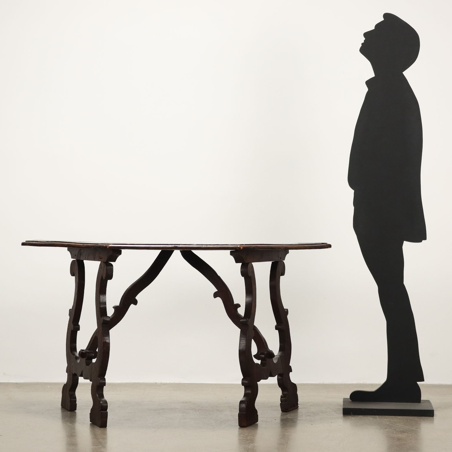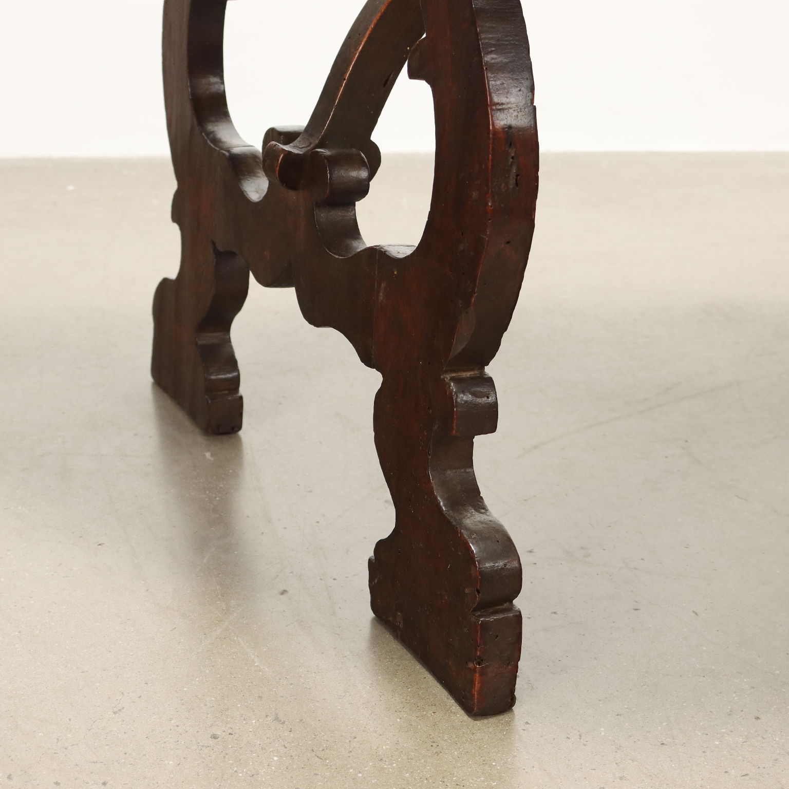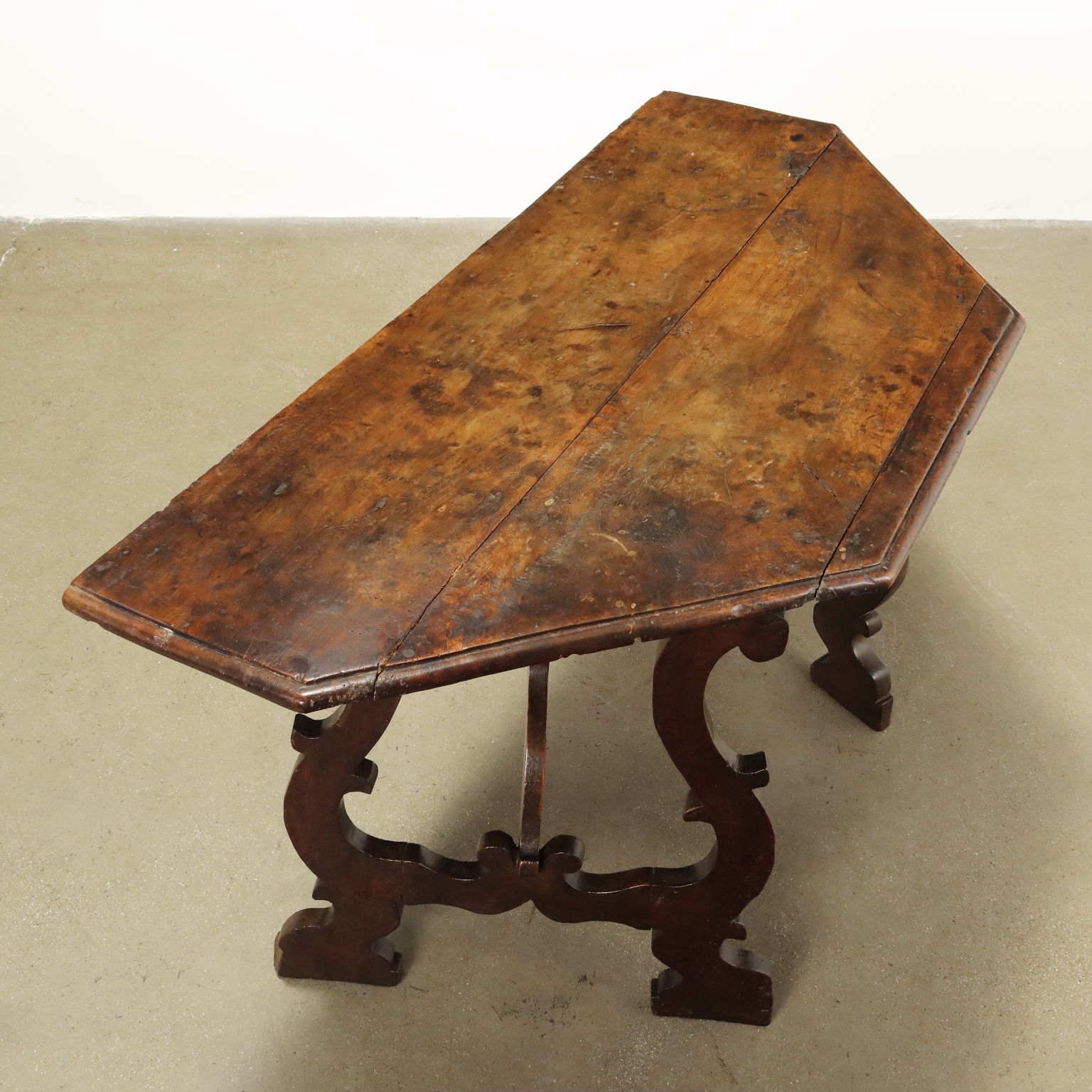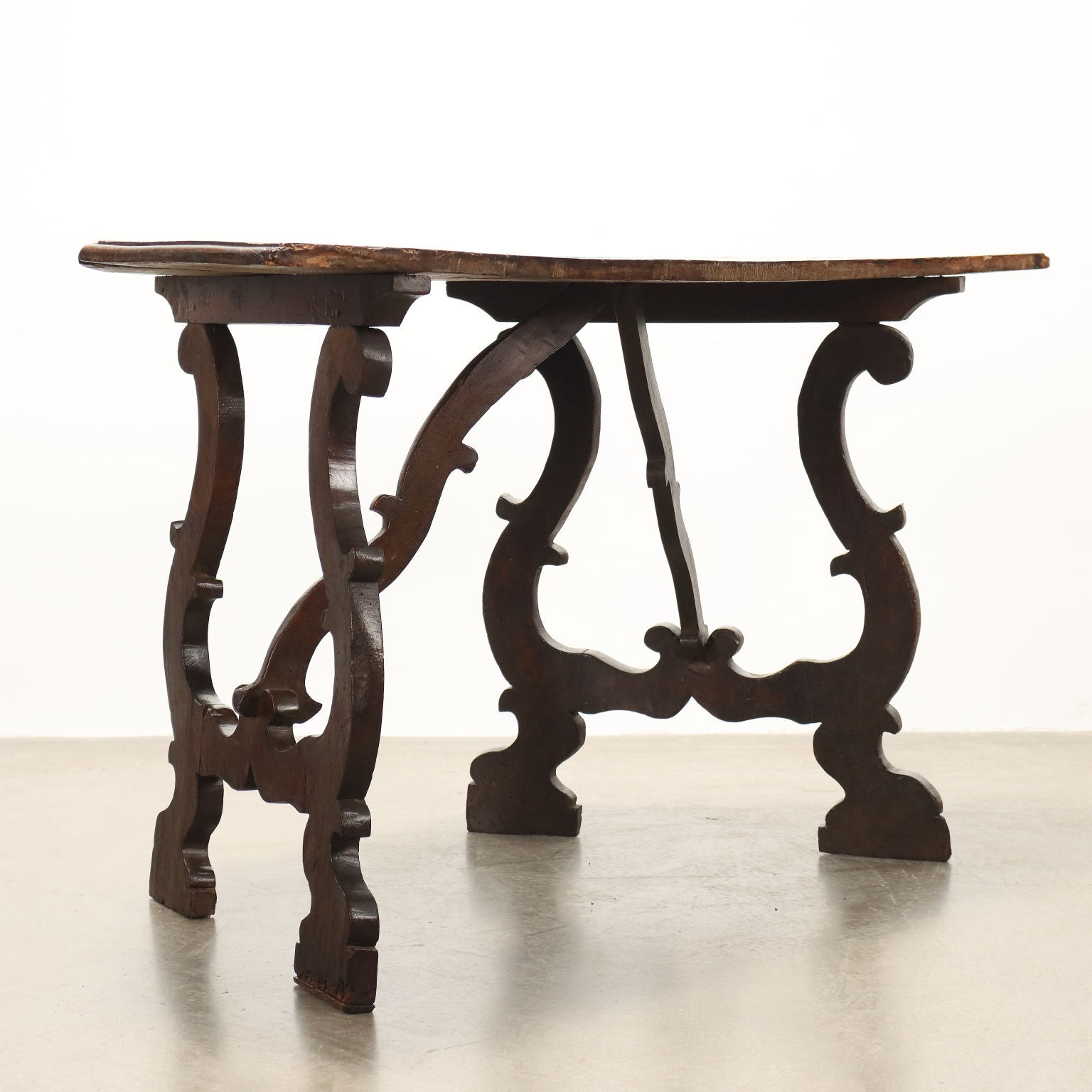 Consolle fratino barocca, sorretta da gambe a lira sagomate e intagliate, con motivo ripreso anche nelle saette; queste ultime sono state spostate dalla loro posizione originaria, sostituiti i chiodi di ancoraggio tra il piano e le gambe.