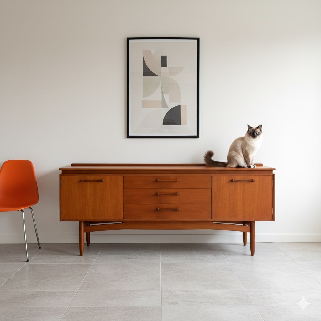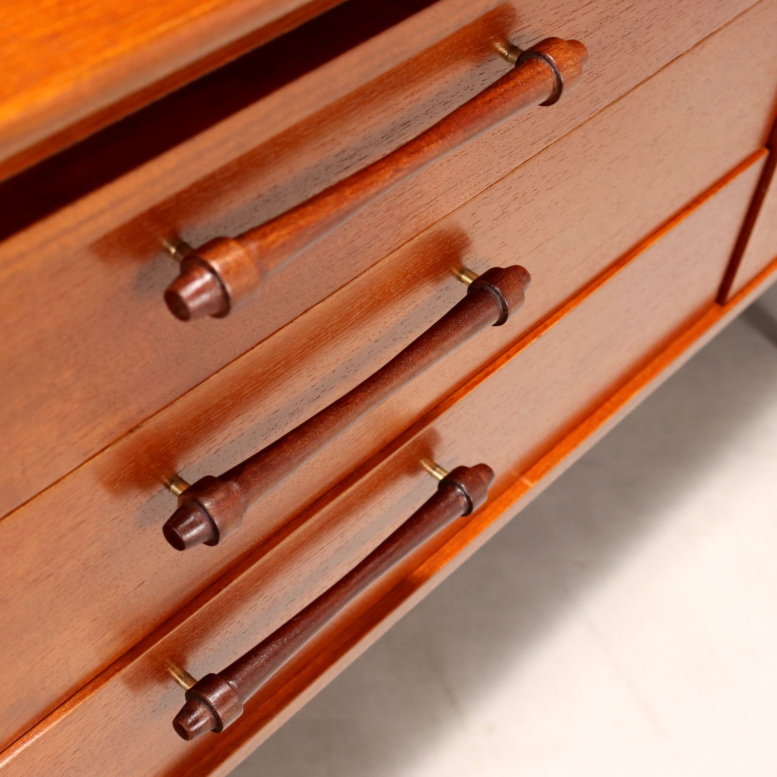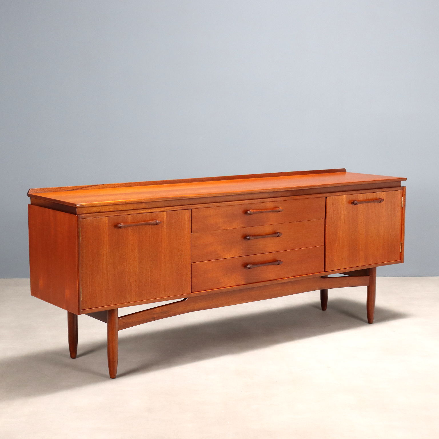 Sideboard vintage di manifattura Nord Europea con due ante a battente laterali e tre cassetti centrali. Realizzato in legno di teak, è stato restaurato nei minimi particolari nei nostri laboratori.
