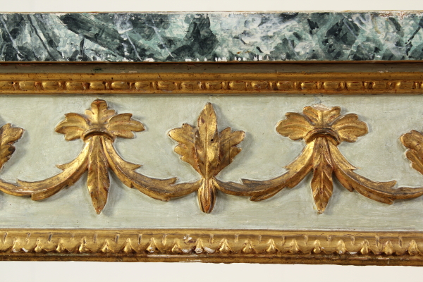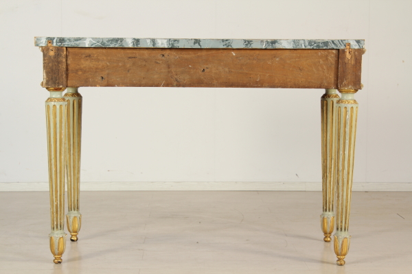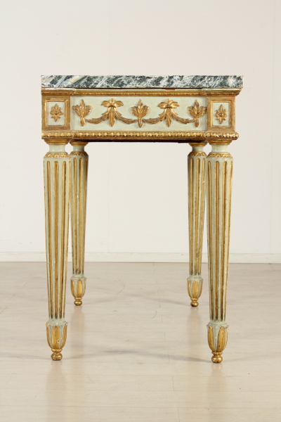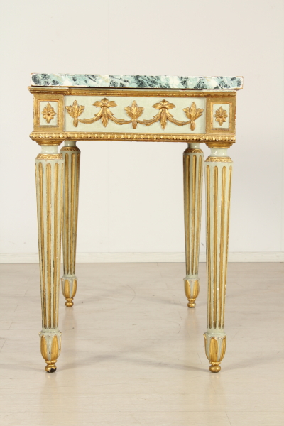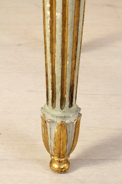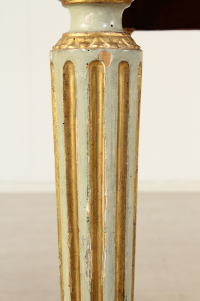 Retta da gambe troncoconiche scanalate e intagliate. Presenta fasce sottopiano con festoni intagliati. Piano marmorizzato non coevo. Laccata color salvia, dorata nelle parti intagliate.