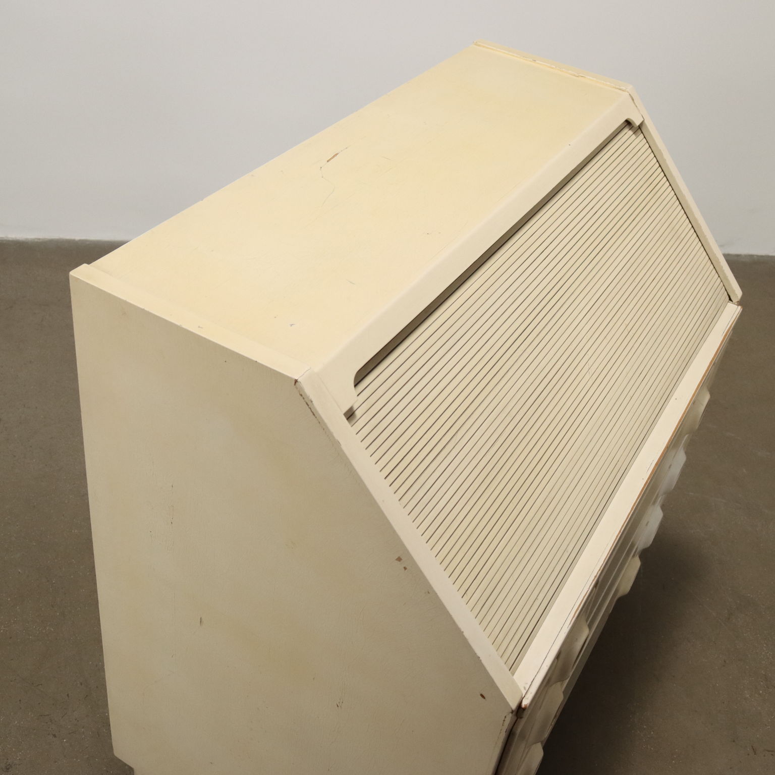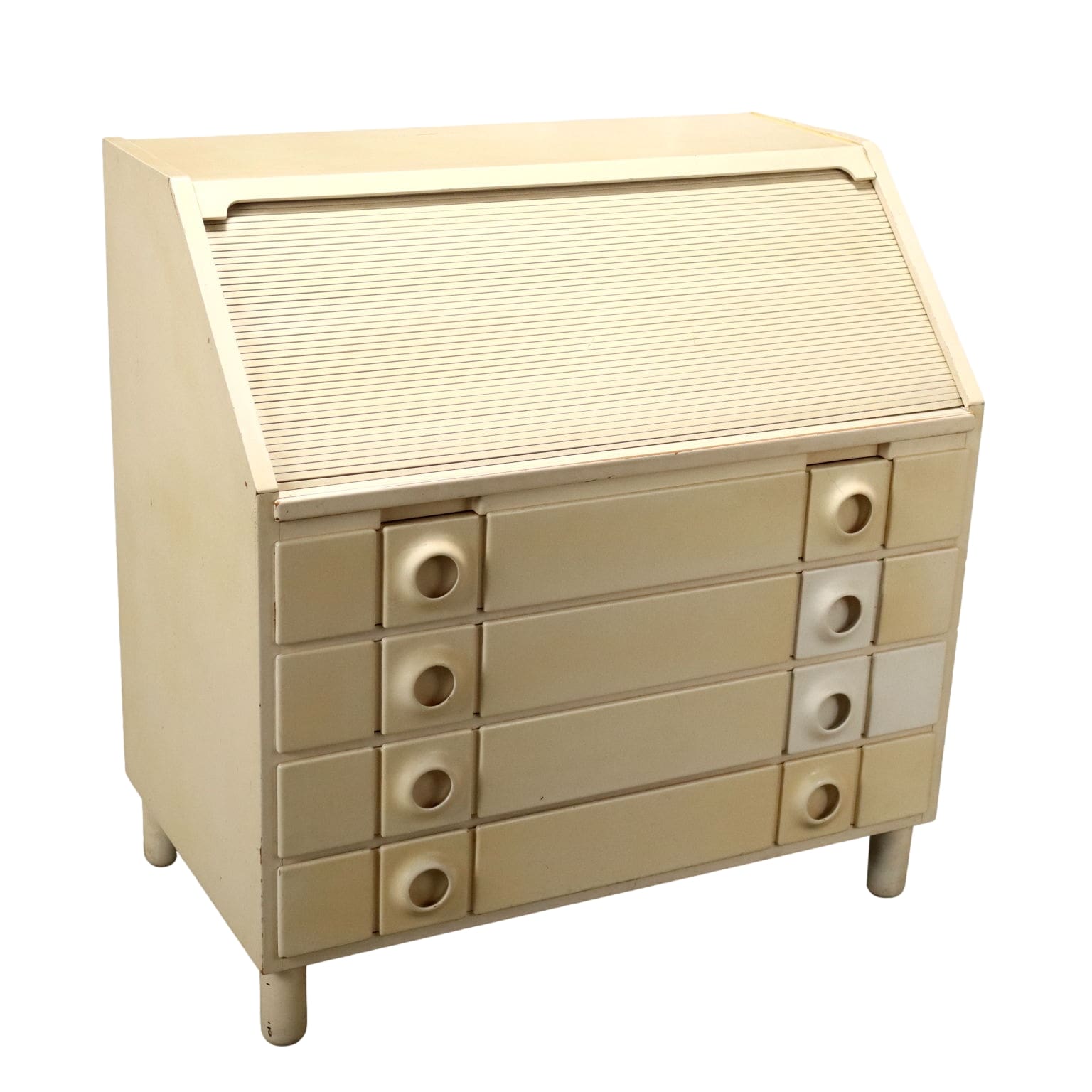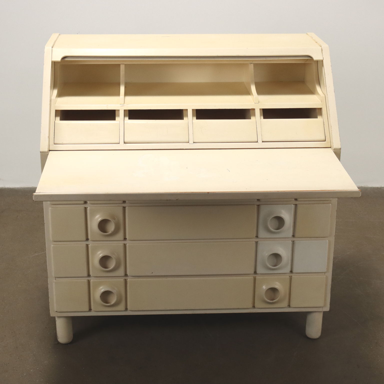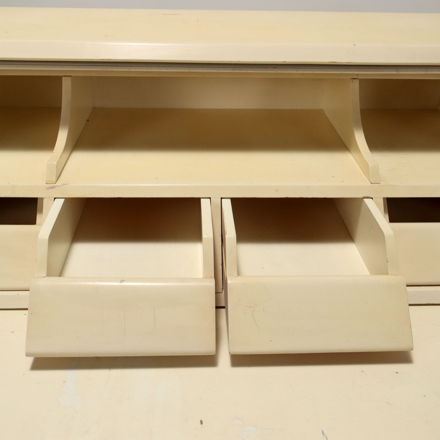 Scrittoio con serranda, piano estraibile e cassetti nella parte inferiore. In legno laccato.