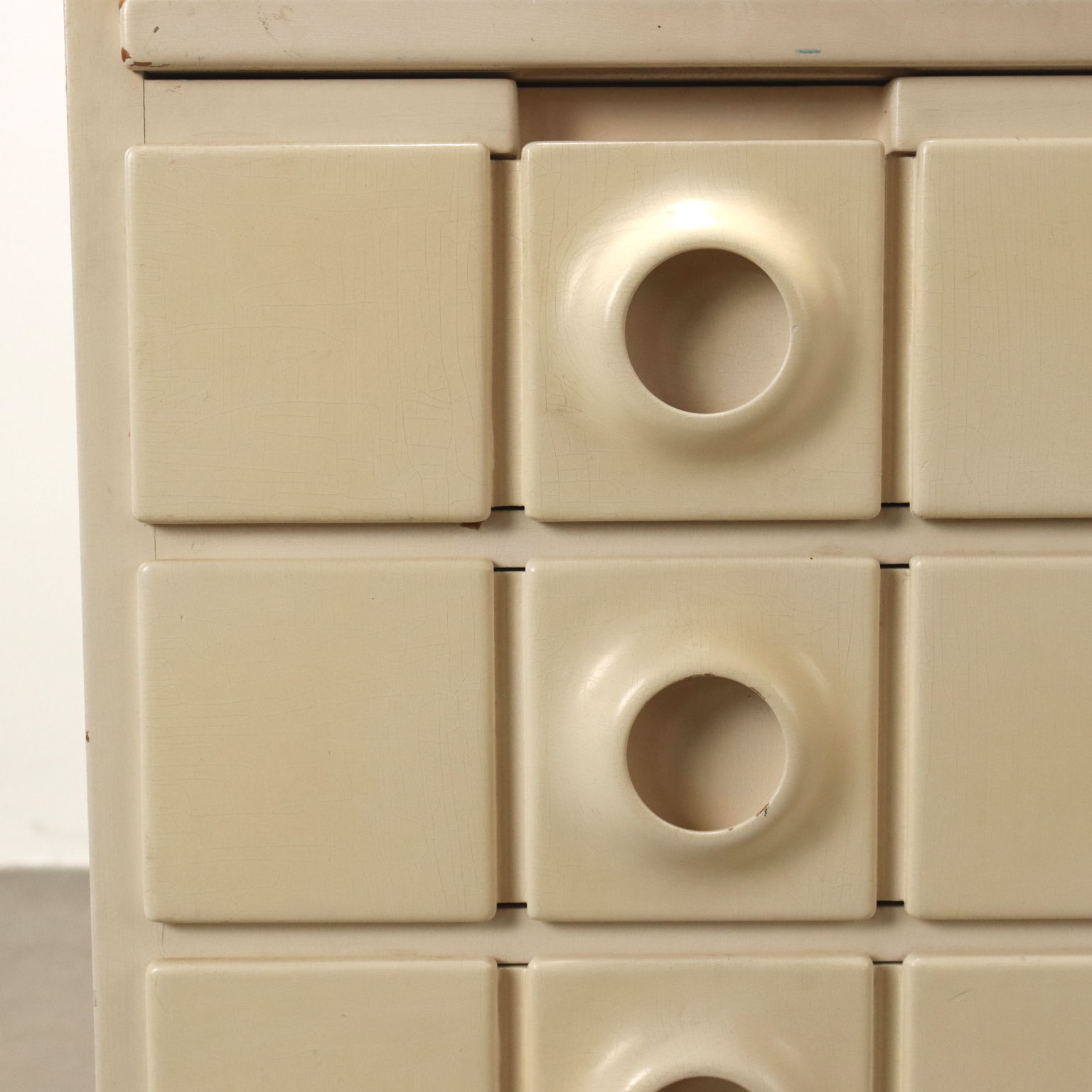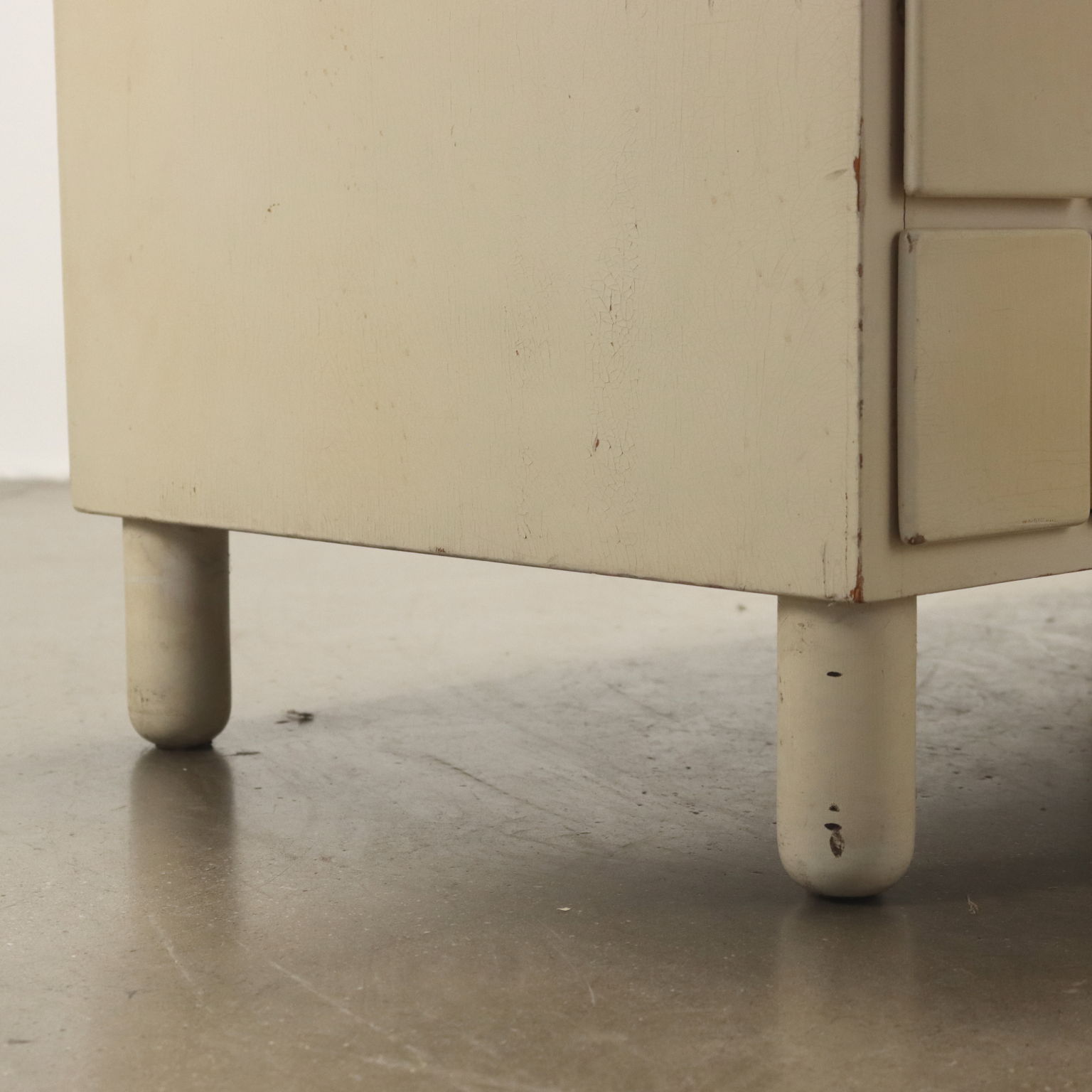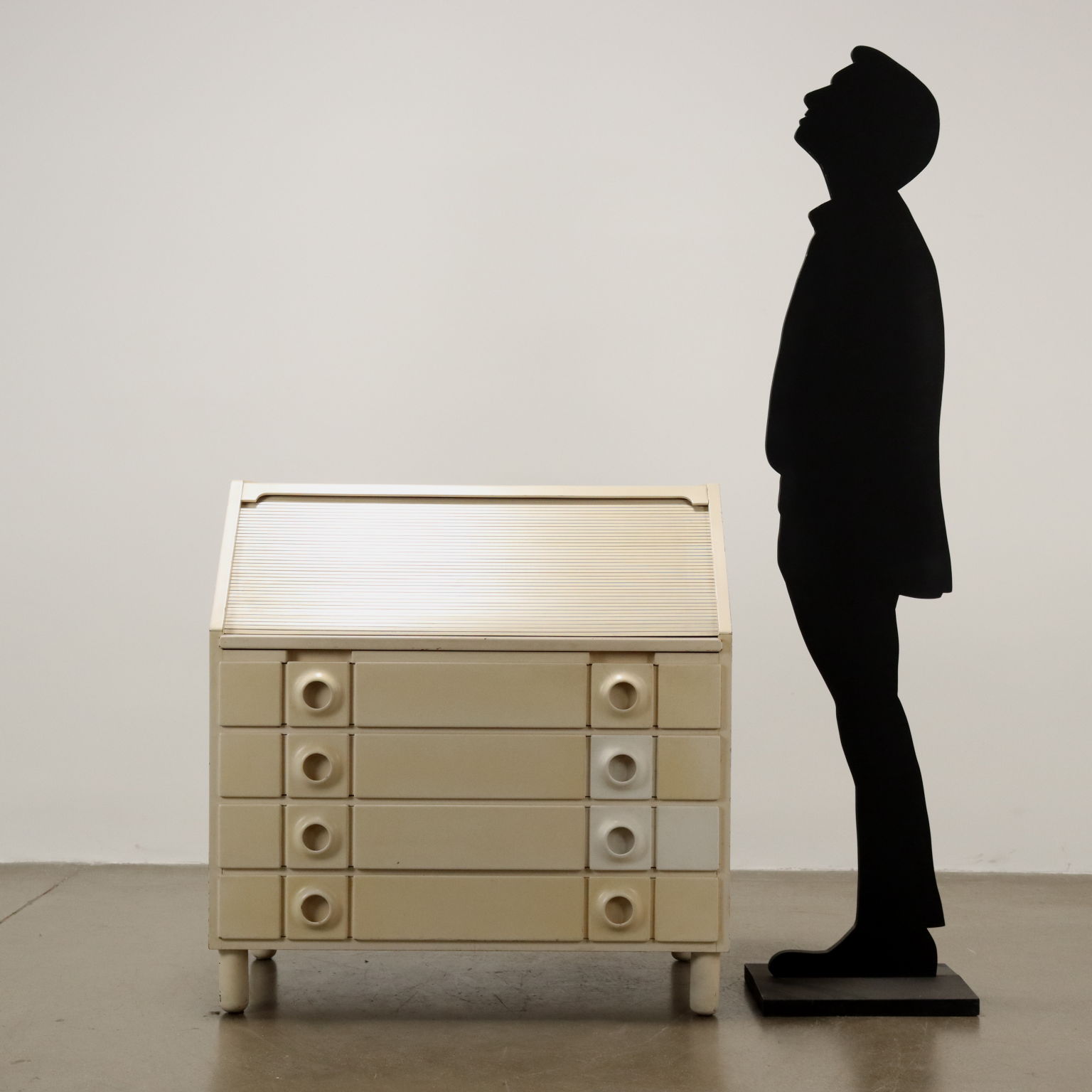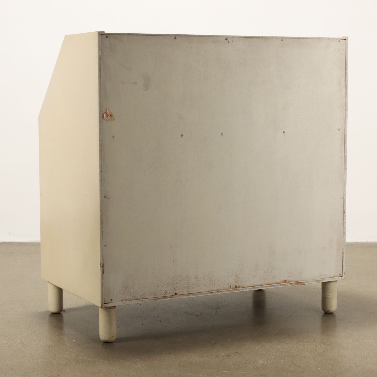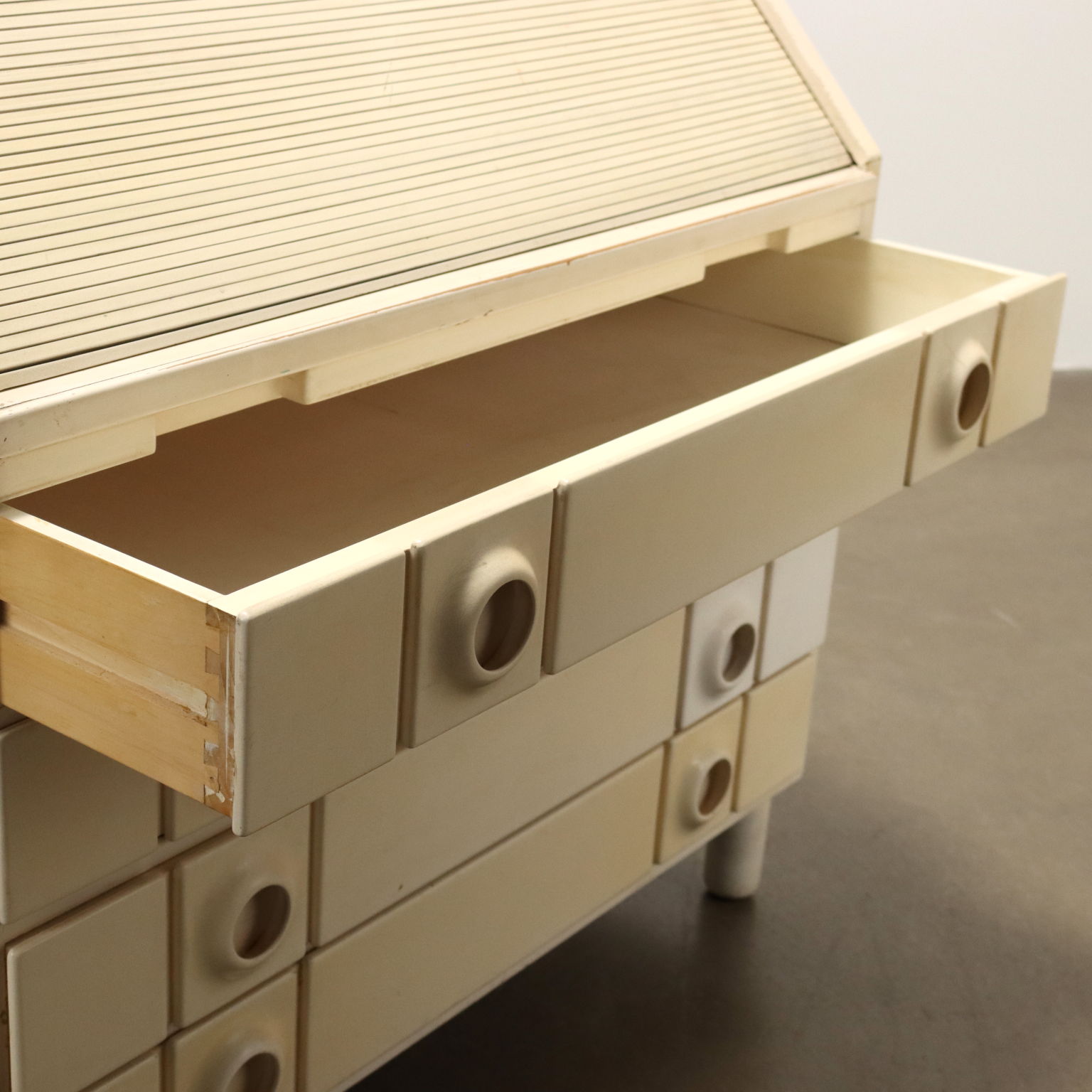 Scrittoio con serranda, piano estraibile e cassetti nella parte inferiore. In legno laccato.