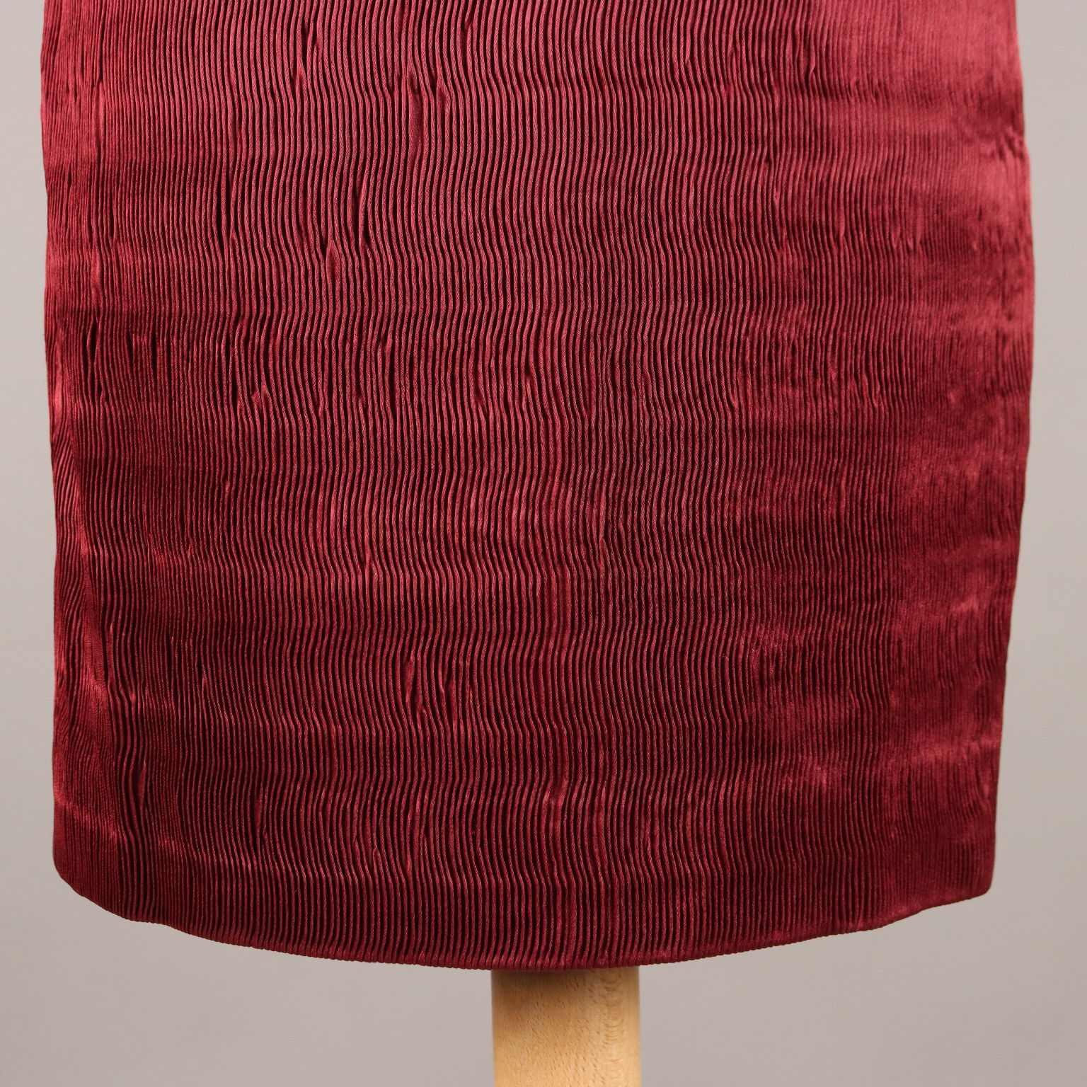 Gonna foderata, realizzata in un originale tessuto bordeaux dalla trama plissettata.