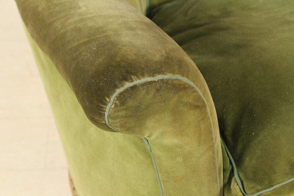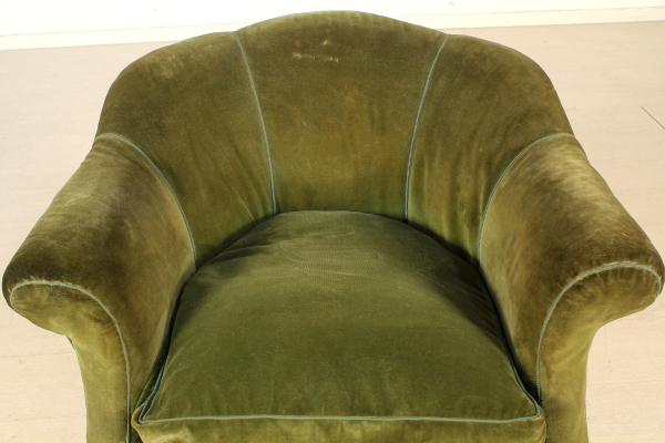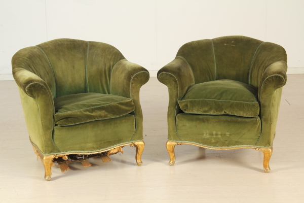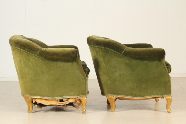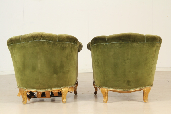 Poltroncine a pozzetto rette da gambe mosse e dorate. Interamente imbottita.