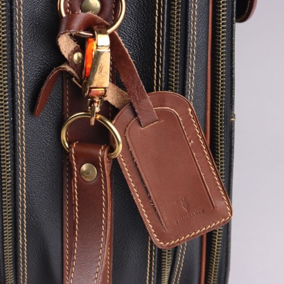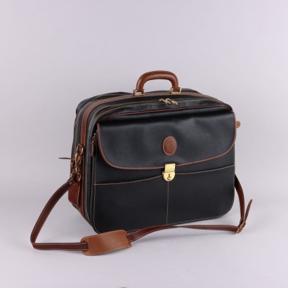 Borsa da viaggio in pelle nera con profili e dettagli in pelle marrone. L'articolo è organizzato in molti scompartimenti e tasche, risulta quindi capiente e pratico. Dotato di chiave e targhetta di riconoscimento, si può portare a mano o a tracolla.