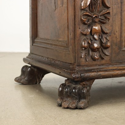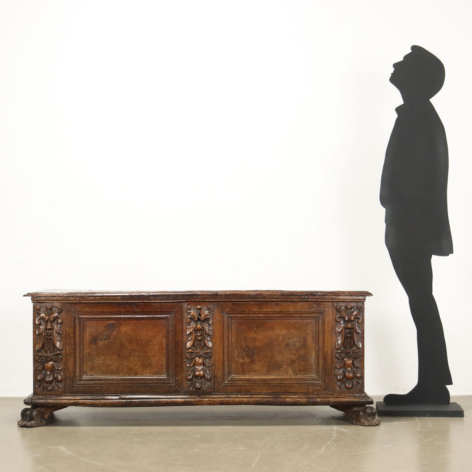 Cassapanca d'epoca barocca inizio del XVIII secolo. Fronte bipartito con lesene decorate da intagli con mascheroni e volute, piedi ferini. Cerniere sostituite inizialmente ad anello, serratura originale in ferro battuto, restauri.