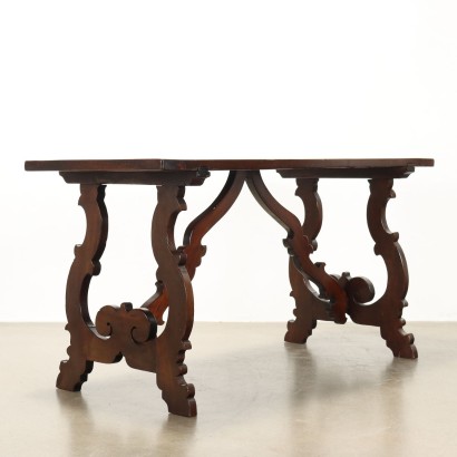 Tavolo fratino in stile, sorretto da gambe intagliate a lira e connesse al piano da saette, anch'esse intagliate. In noce, è stato parzialmente realizzato con materiale di recupero.