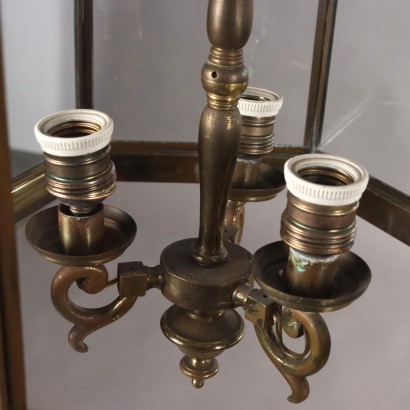 Coppia di lanterne con struttura in lamierino e laterali in vetro; presentano tre luci.