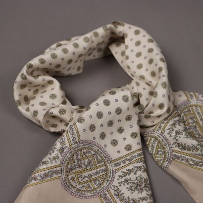 Sciarpa in pura seta, realizzata con una stampa a disegni circolari e una greca sul fondo con trama floreale. L'articolo è in buone condizioni, segnaliamo che sul fondo ha qualche piccola macchiolina e non è rifinito con un orlo.