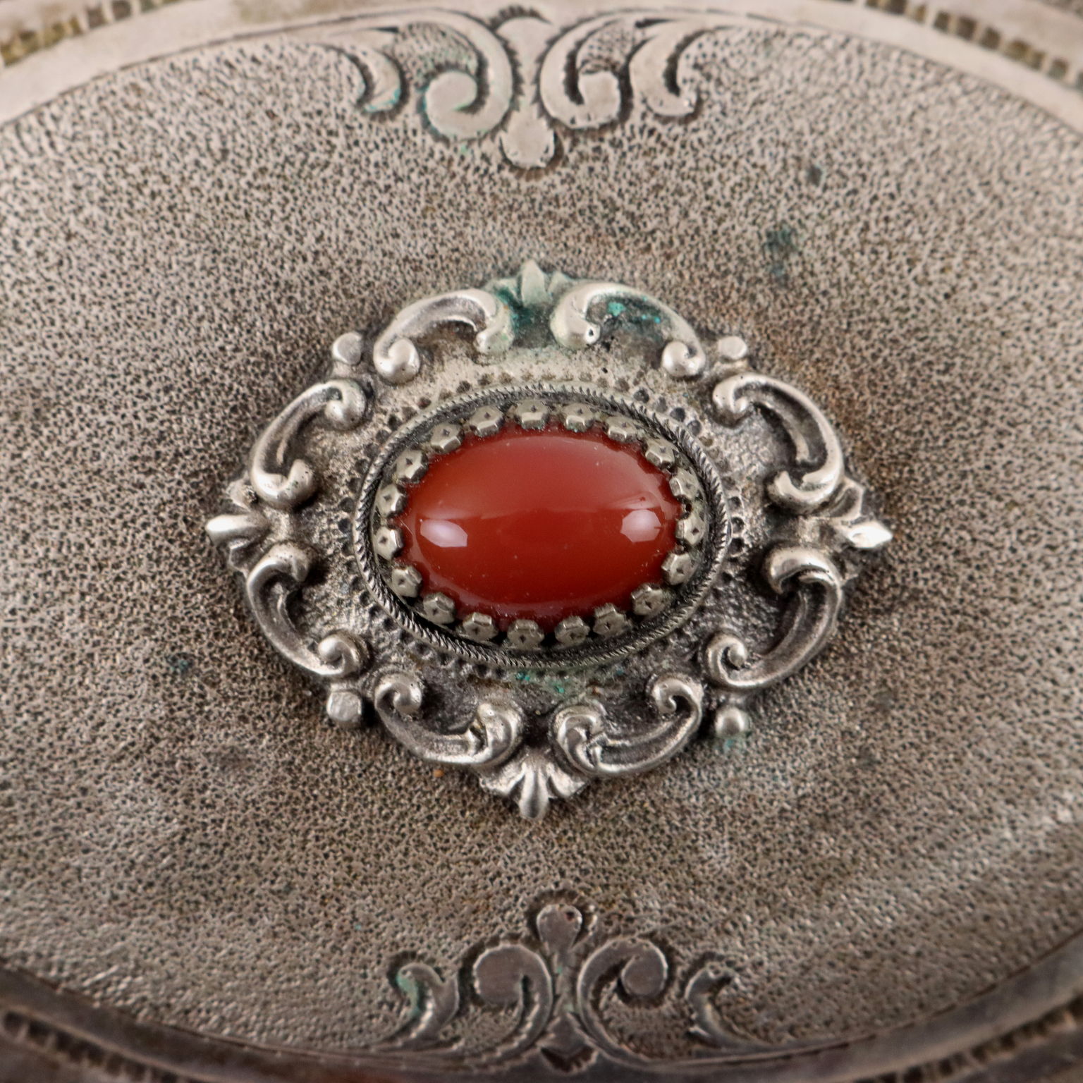 Scatola portagioie in argento lavorato a bulino e cesellato a volute fogliacee. A bordo mosso, retta da quattro piedini e con interno in argento vermeil. Pietra artificiale di forma ovale incastonata al centro del coperchio. Marchio dell'argento incusso sotto la base. Grammi 196.