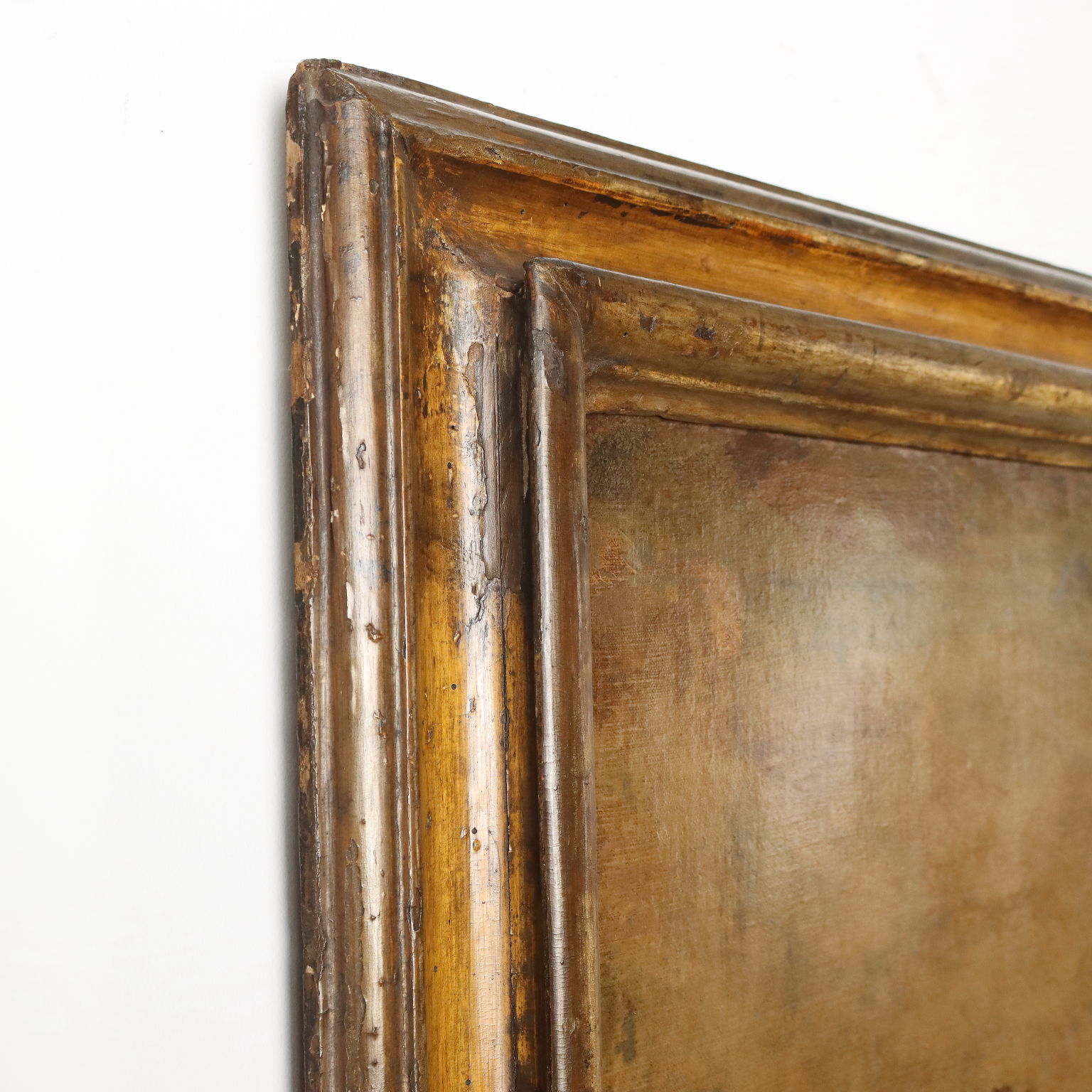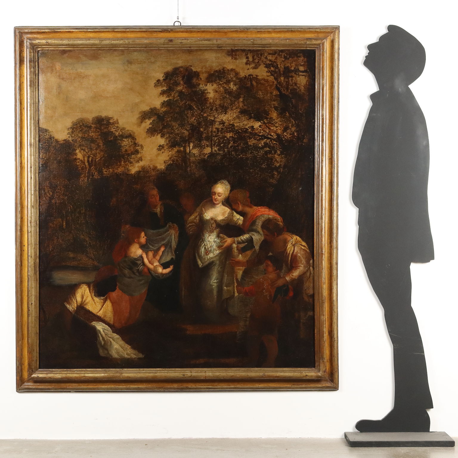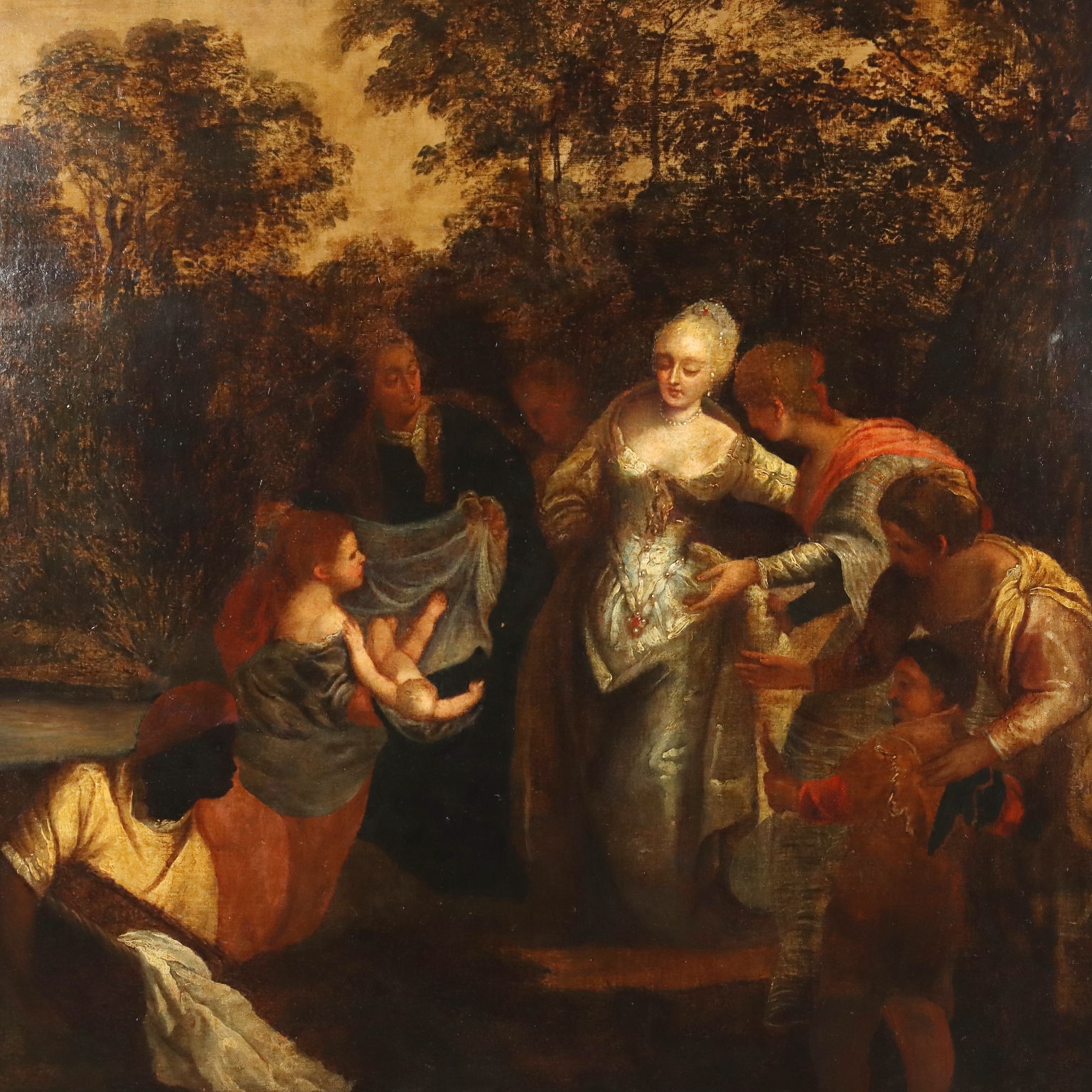 Olio su tela. Il dipinto guarda all'opera analoga di Paolo Veronese (1528-1588), databile intorno al 1560-70 e oggi conservata al museo del Prado, della quale il nostro dipinto riprende la composizione delle figure, cambiando tutto lo sfondo e l'abbigliamento dei personaggi. L'opera del Veronese ebbe un tale successo da essere replicata dalla sua stessa bottega, con numerose varianti: la nostra opera deriva probabilmente da una di queste copie, replicata in epoca successiva. L' episodio raffigurato è narrato nel libro biblico dell'Esodo e racconta il ritrovamento del piccolo Mosè, lasciato dalla madre in una cesta lungo le rive del fiume Nilo, per salvarlo dalla strage dei figli di Israele perpetrata dal Faraone; la figlia del Faraone, recatasi al fiume con il suo seguito, lo trova e lo salva, adottandolo. Le figure della scena sono raffigurate in abiti settecenteschi, in particolare spicca per ricchezza e sontuosità l'abito della principessa; unico elemento esotico è la presenza di un servitore di colore nel seguito, mentre anche lo sfondo rimanda ad un paesaggio del nord -Europa, con una folta vegetazione boschiva. Il dipinto, restaurato e ritelato, è presentato in cornice del XI secolo.