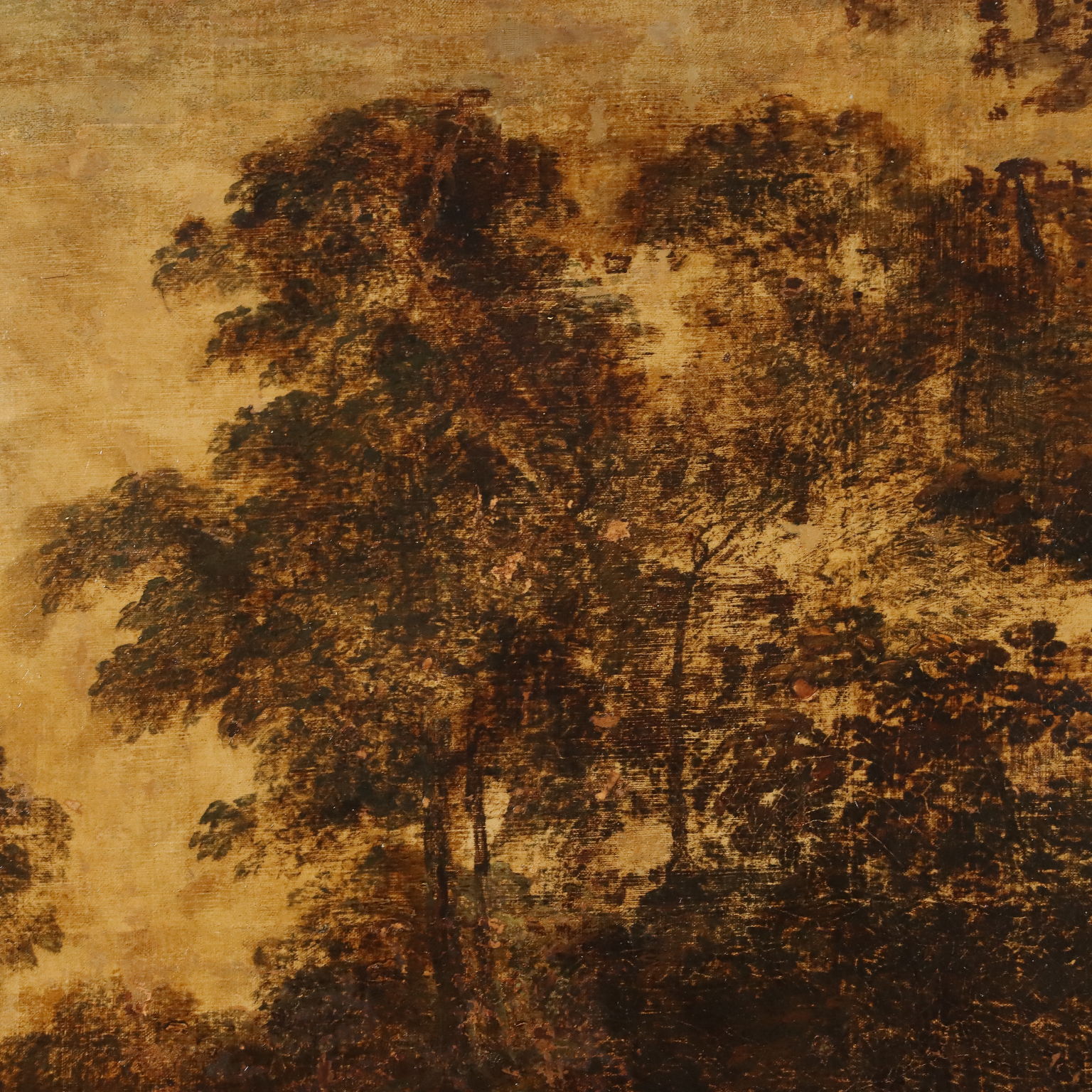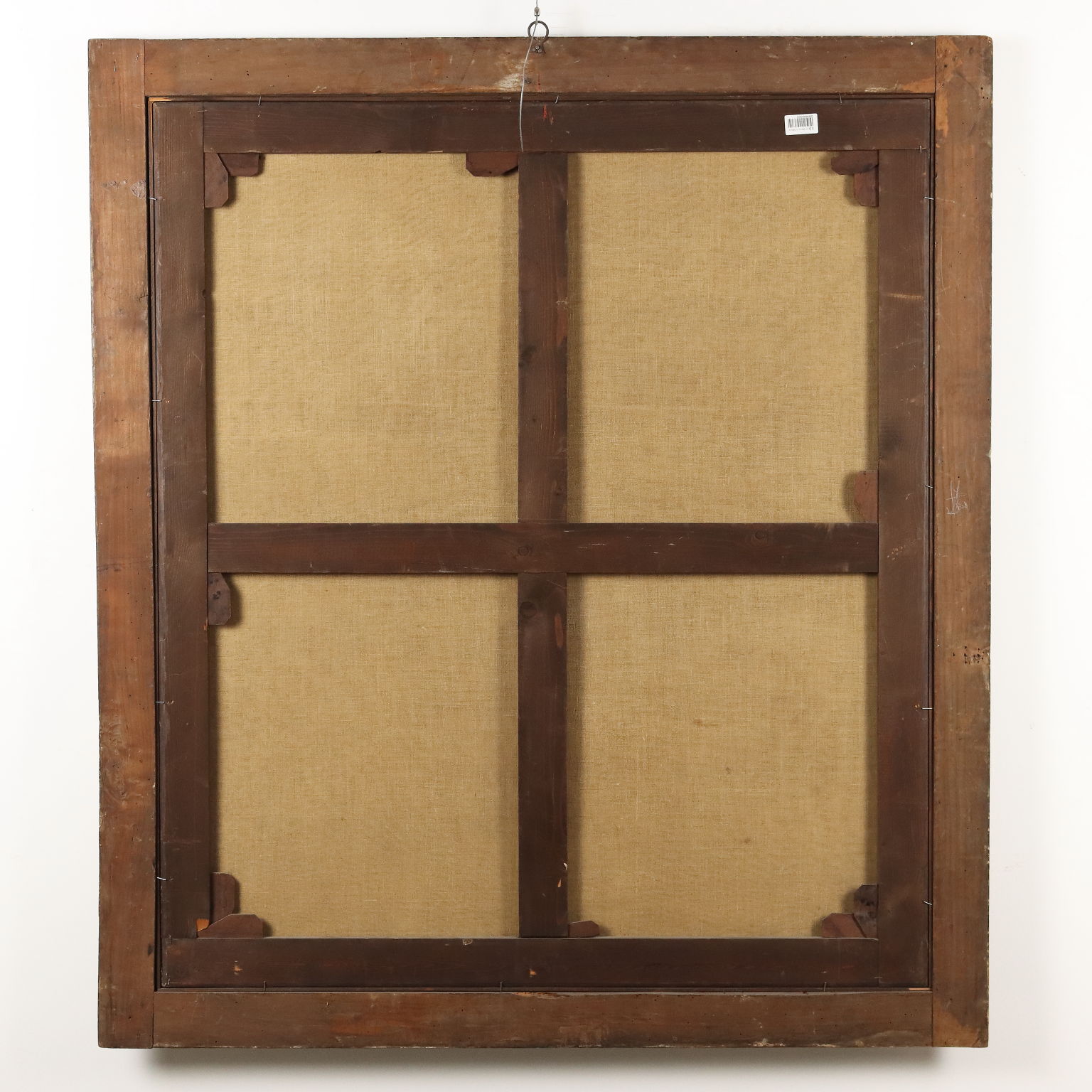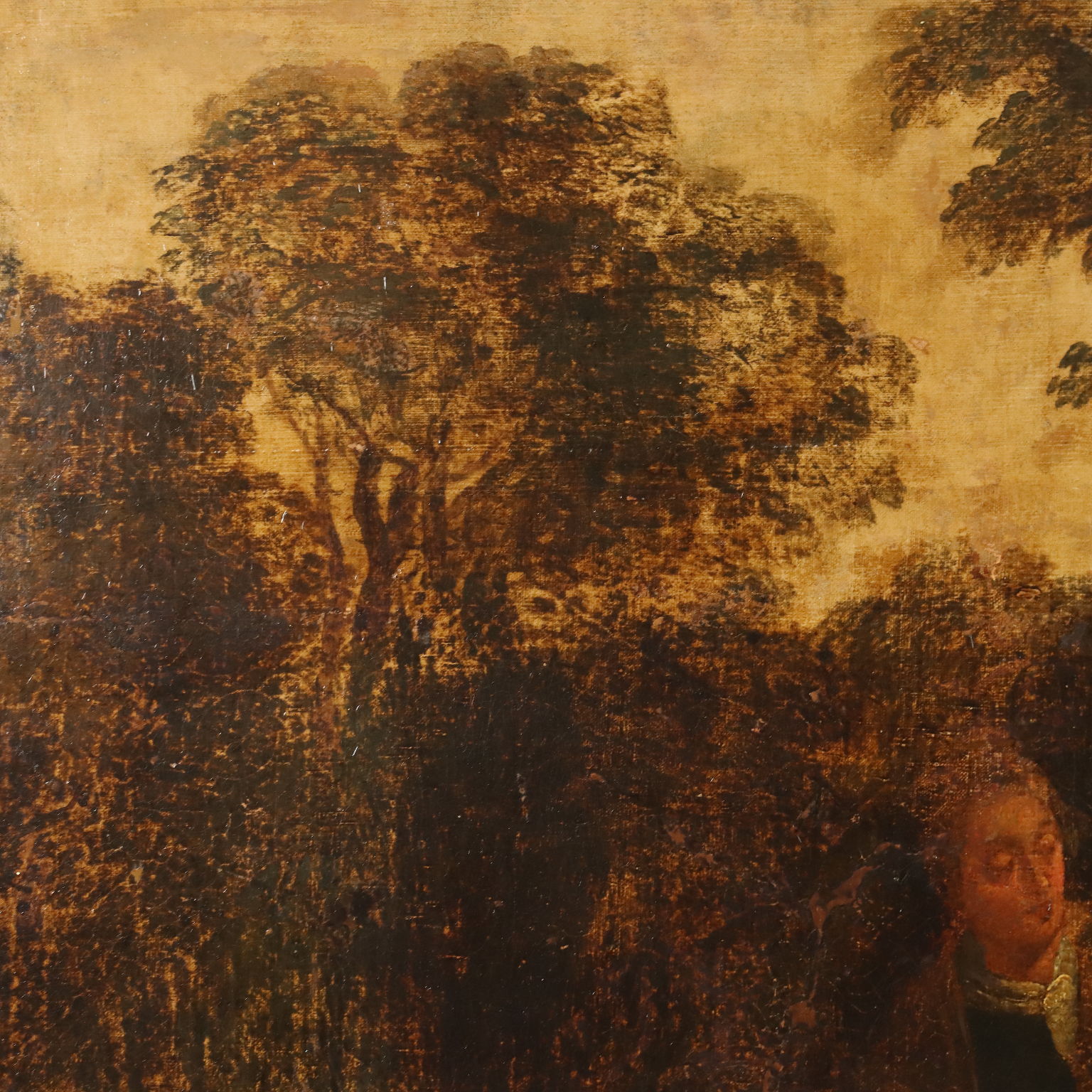 Olio su tela. Il dipinto guarda all'opera analoga di Paolo Veronese (1528-1588), databile intorno al 1560-70 e oggi conservata al museo del Prado, della quale il nostro dipinto riprende la composizione delle figure, cambiando tutto lo sfondo e l'abbigliamento dei personaggi. L'opera del Veronese ebbe un tale successo da essere replicata dalla sua stessa bottega, con numerose varianti: la nostra opera deriva probabilmente da una di queste copie, replicata in epoca successiva. L' episodio raffigurato è narrato nel libro biblico dell'Esodo e racconta il ritrovamento del piccolo Mosè, lasciato dalla madre in una cesta lungo le rive del fiume Nilo, per salvarlo dalla strage dei figli di Israele perpetrata dal Faraone; la figlia del Faraone, recatasi al fiume con il suo seguito, lo trova e lo salva, adottandolo. Le figure della scena sono raffigurate in abiti settecenteschi, in particolare spicca per ricchezza e sontuosità l'abito della principessa; unico elemento esotico è la presenza di un servitore di colore nel seguito, mentre anche lo sfondo rimanda ad un paesaggio del nord -Europa, con una folta vegetazione boschiva. Il dipinto, restaurato e ritelato, è presentato in cornice del XI secolo.