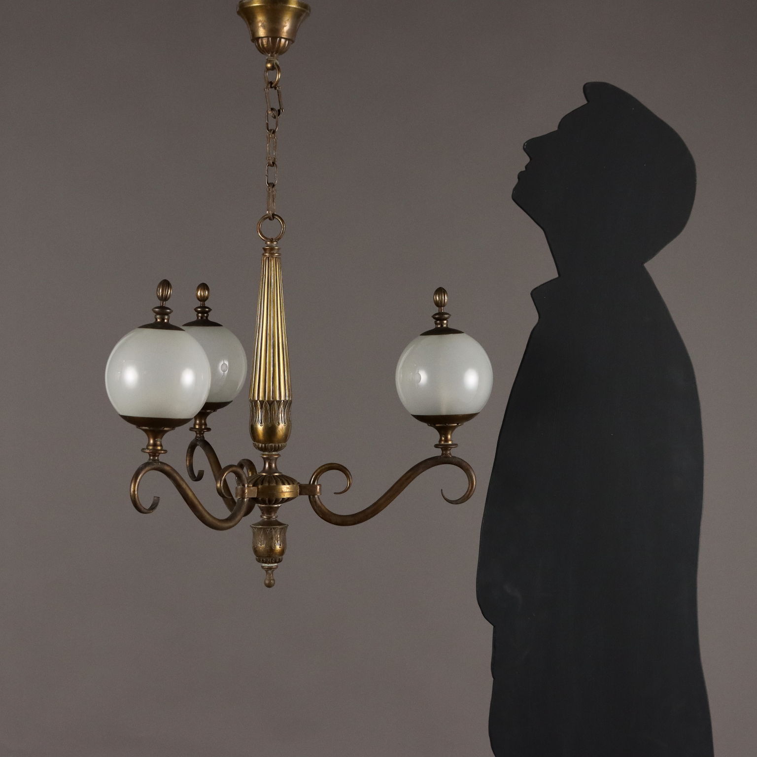 Coppia di lampadari anni '50 a tre luci con boccia in vetro opalino, da un fusto a faretra di dipartono tre bracci per le luci.
