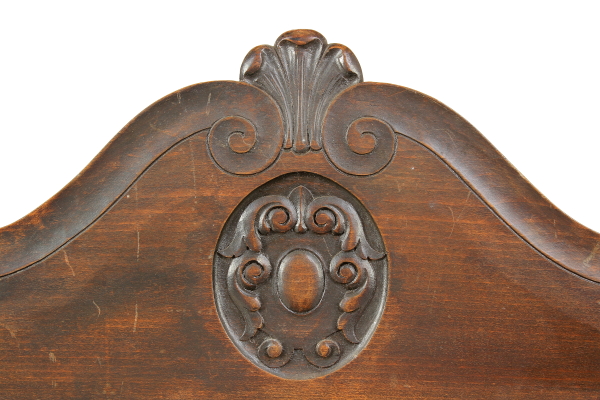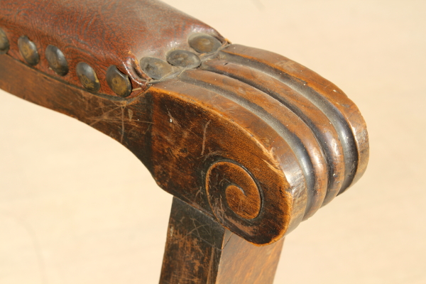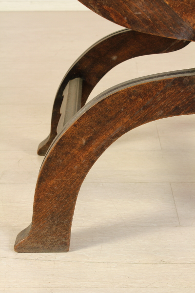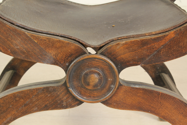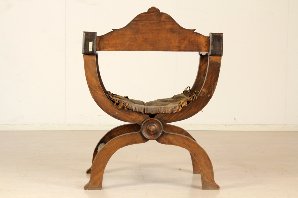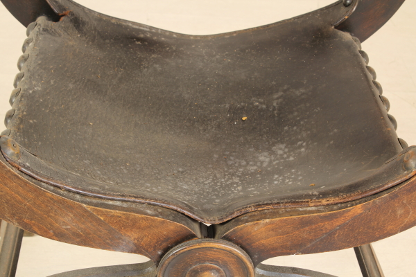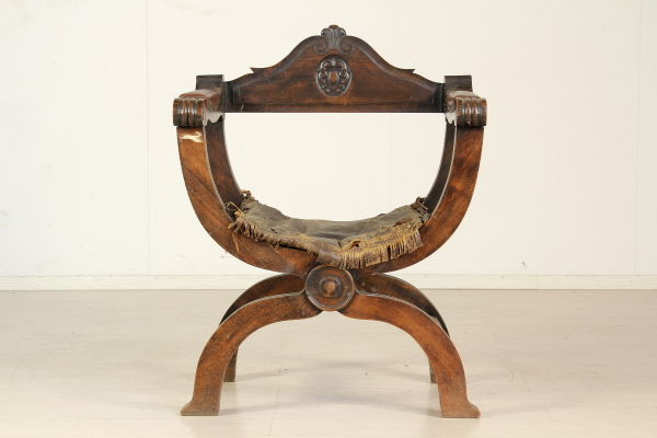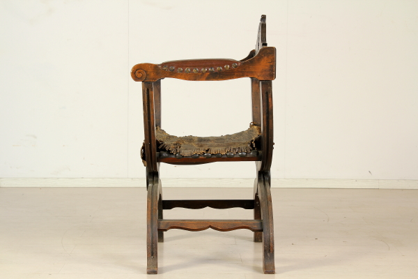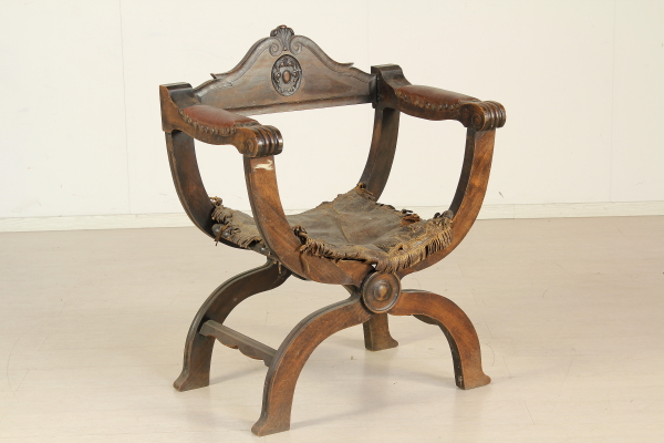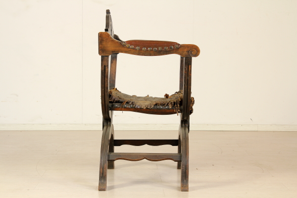 Poltrona dantesca in faggio intagliato con seduta e schienale in pelle, con cuscino d'appoggio in pelle lavorata e frange.