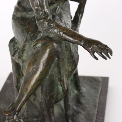 Scultura in bronzo su base in marmo raffigurante donna seduta con sigaretta. Sulla base firma incussa dell'autore.